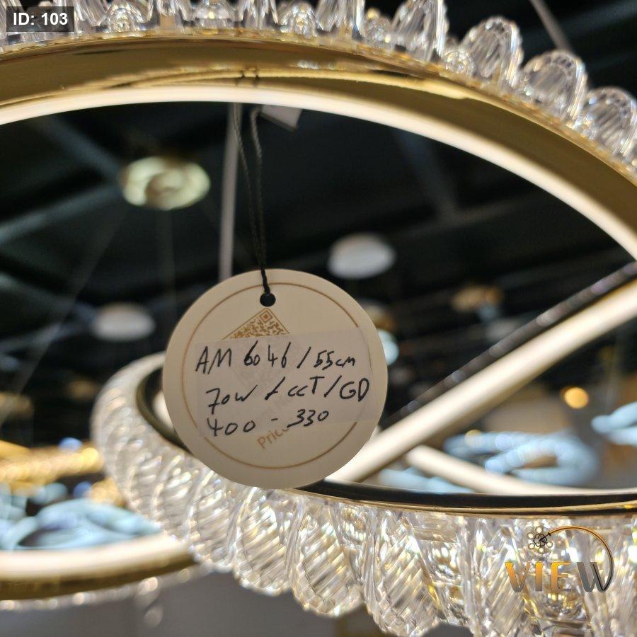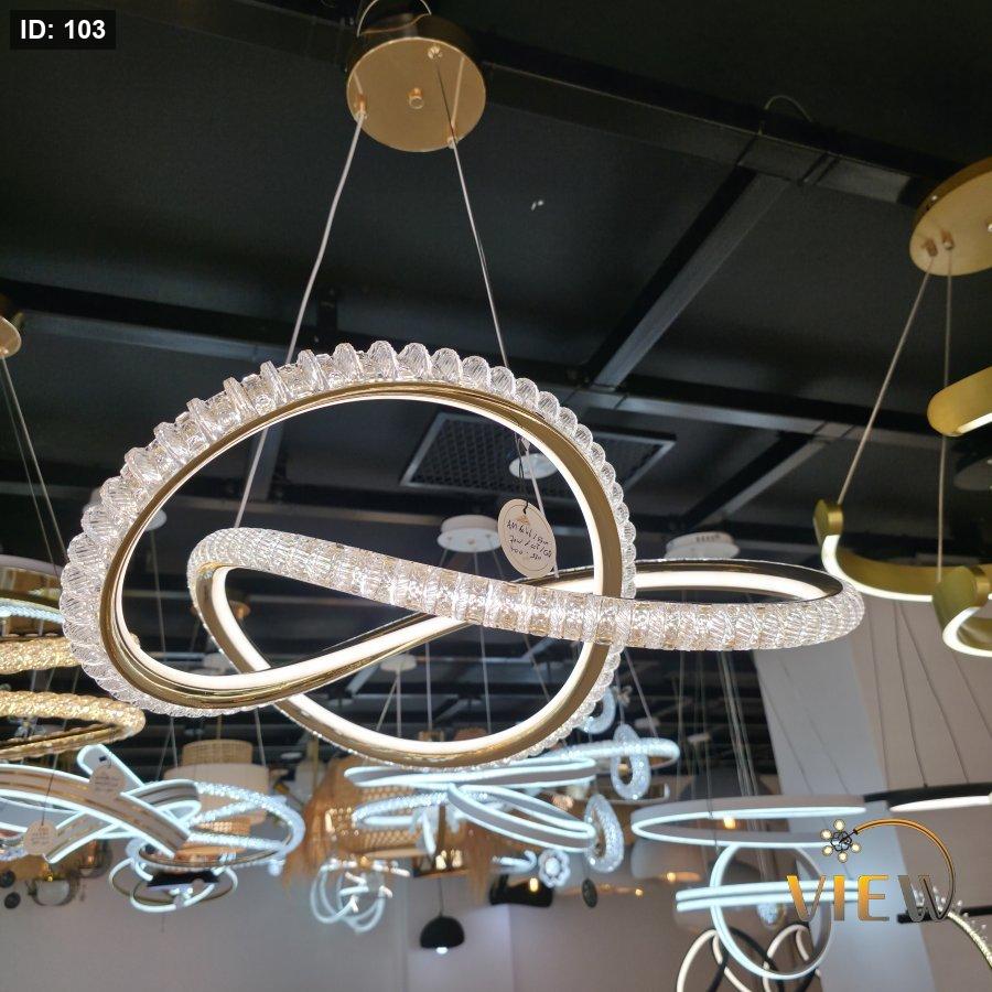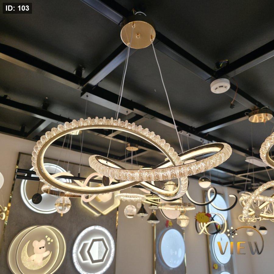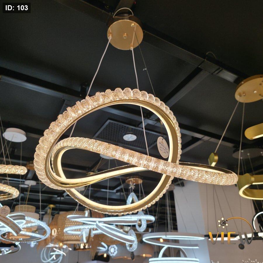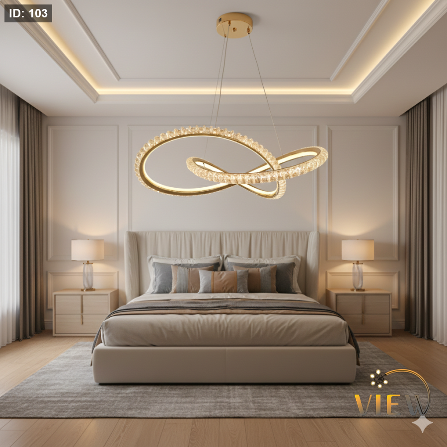 ثريا مودرن بتصميم حلقي متداخل مستوحى من رمز اللانهاية، تجمع بين الإطار المعدني الذهبي وبديل كريستال فاخر يعكس الضوء بانسيابية ناعمة.
