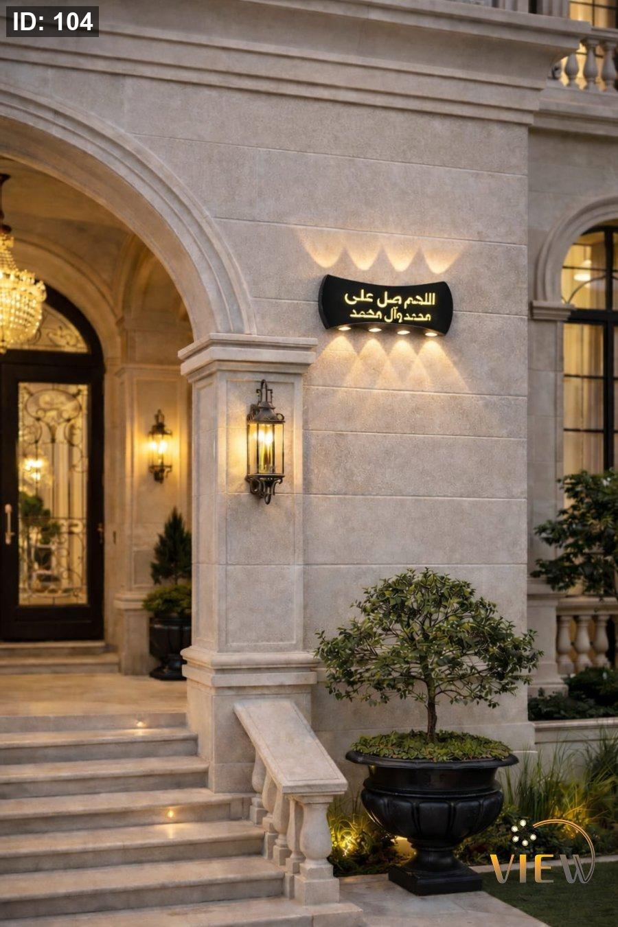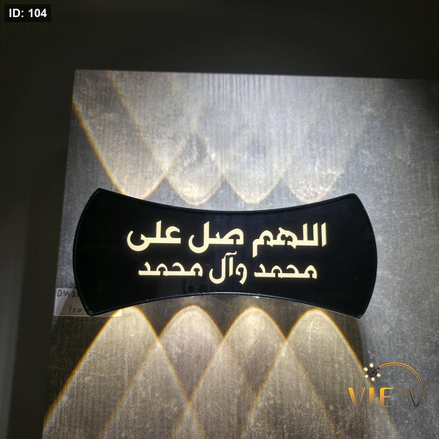 إنارة جدارية LED بتصميم إسلامي راقٍ، تحمل عبارة الصلاة على النبي ﷺ بإضاءة دافئة تنعكس بنقوش جميلة على الجدار، تضيف سكينة وروحانية للمكان مع لمسة ديكور فخمة.
