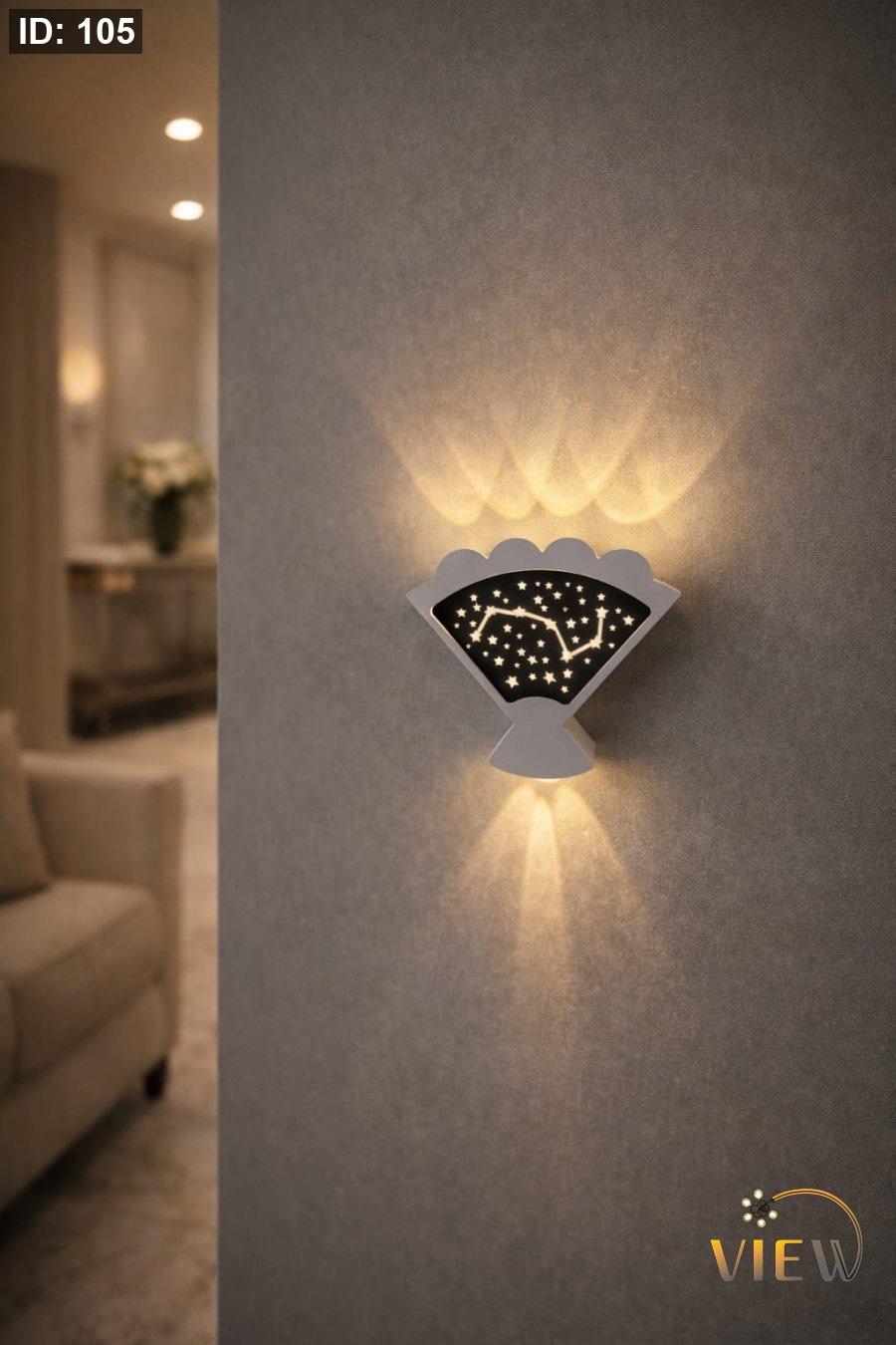 إنارة جدارية LED بتصميم فني مستوحى من النجوم والكوكبات، تعكس ضوءاً دافئاً بنقوش سماوية جذابة على الجدار، تضيف لمسة خيالية وهادئة للمكان وتلفت النظر كقطعة ديكور مضيئة.