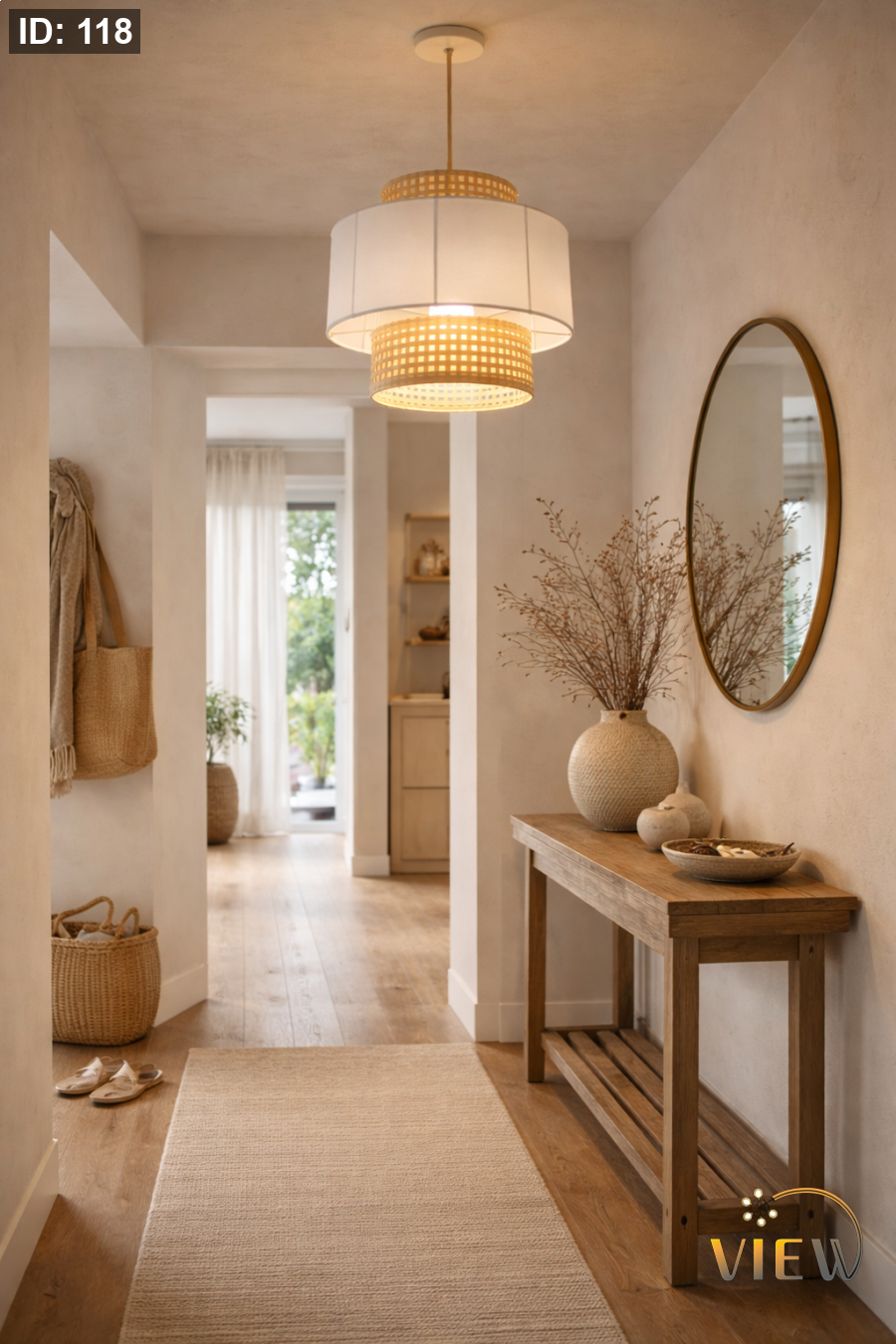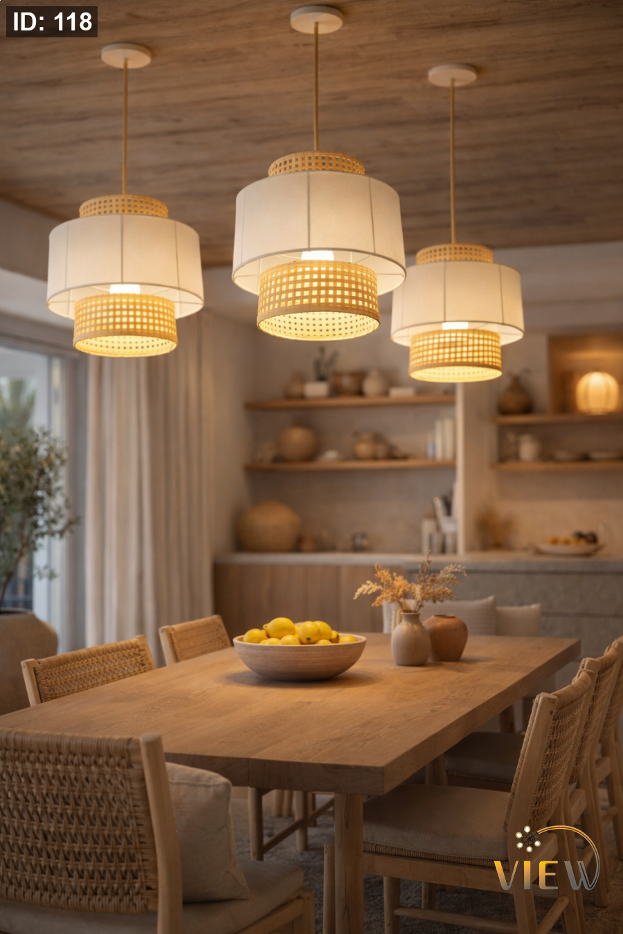 إنارة معلّقة تجمع بين نعومة القماش الأبيض وجمال القش الطبيعي بتصميم متوازن يضفي دفئًا وأناقة على المكان. توفّر إضاءة مريحة وغير مباشرة، وتنسجم بسلاسة مع الديكورات الهادئة، البوهيمية، والاسكندنافية، لتخلق أجواء راقية ومريحة للنفس.
