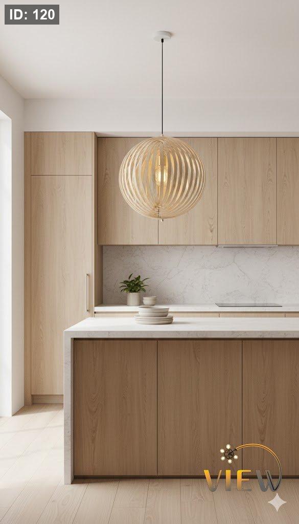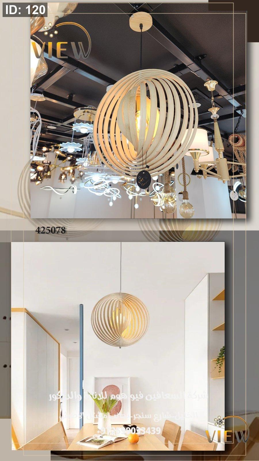 إنارة معلّقة بتصميم كروي أنيق، مكوّنة من شرائح خشبية منحنية تشكّل دائرة متوازنة تحتضن الضوء في مركزها. تمنح إضاءة دافئة وناعمة مع لمسة فنية معاصرة، وتبرز جمال المساحات العصرية والبسيطة دون مبالغة.