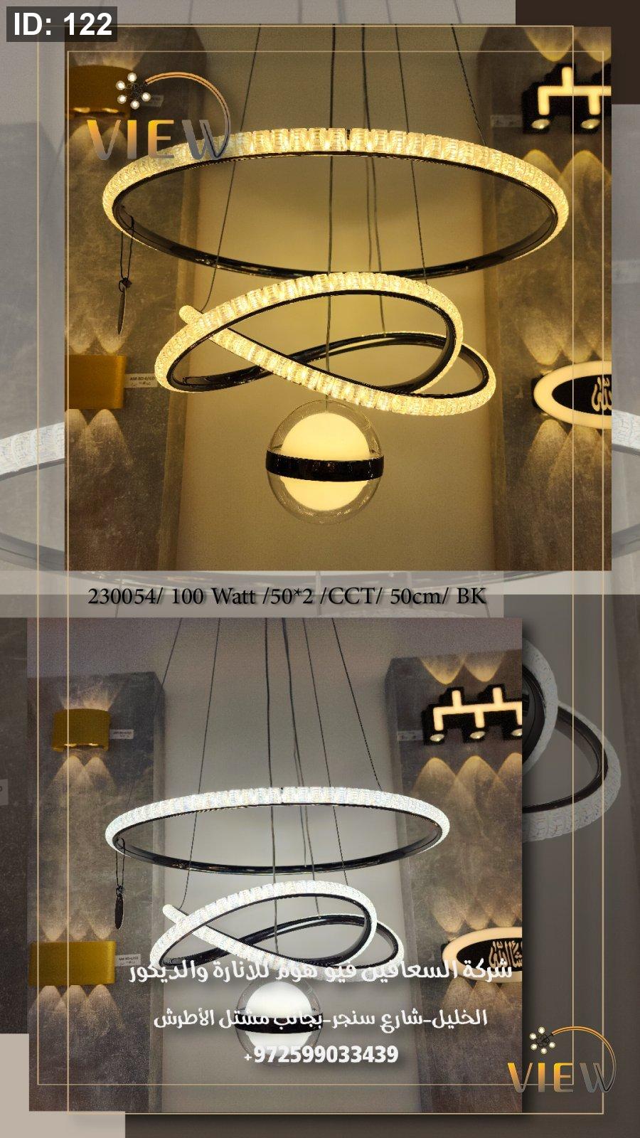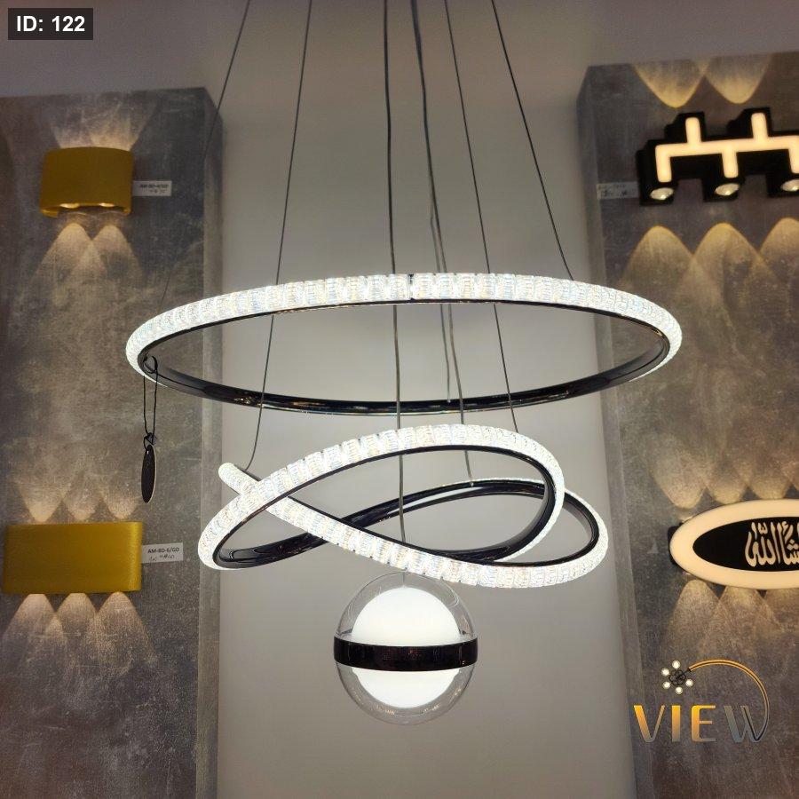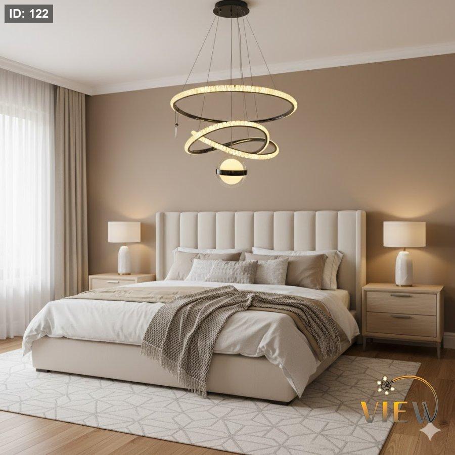ثريا LED عصرية بتصميم حلقي متداخل يمنح إحساسًا بالحركة والانسيابية، مع إضاءة دافئة ناعمة تبرز جمال التفاصيل دون إزعاج. تجمع بين الحداثة والفخامة، وتحوّل السقف إلى عنصر بصري لافت يضفي طابعًا راقيًا ومتوازنًا على المكان.
