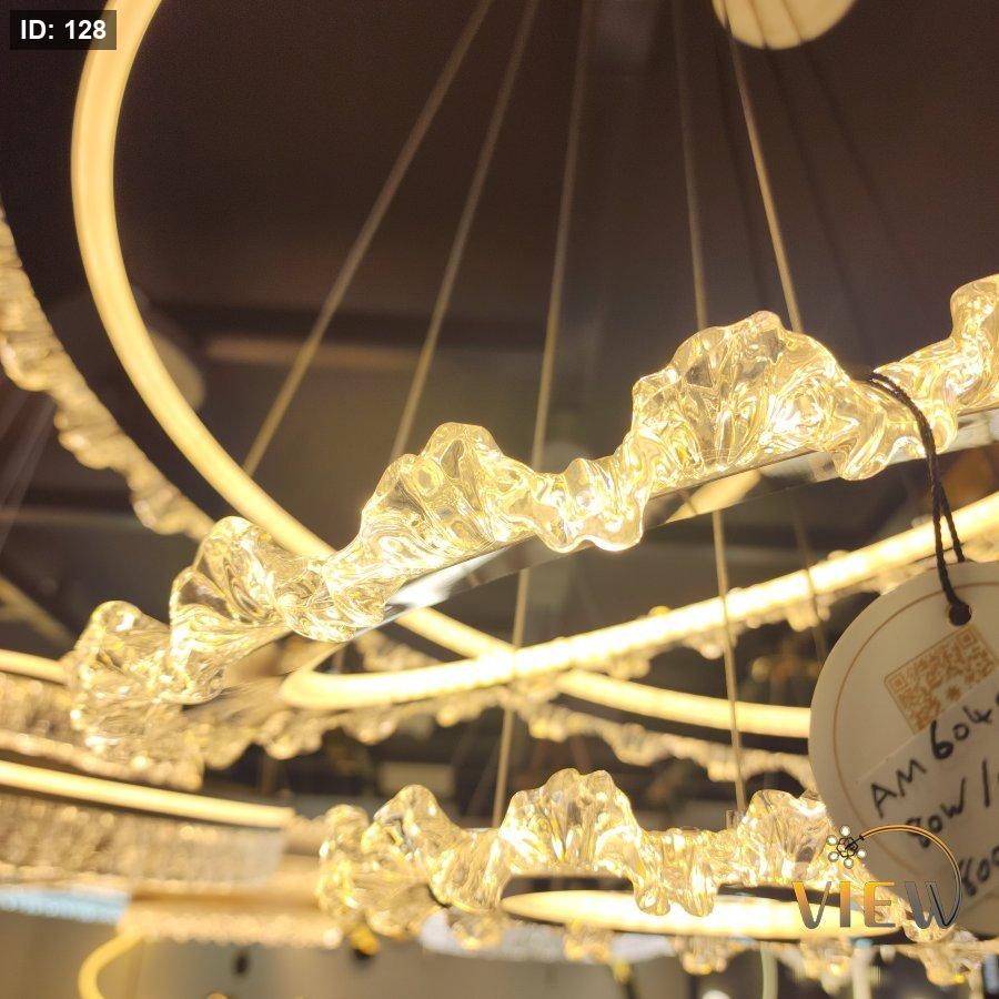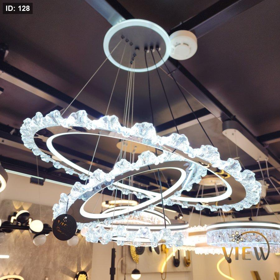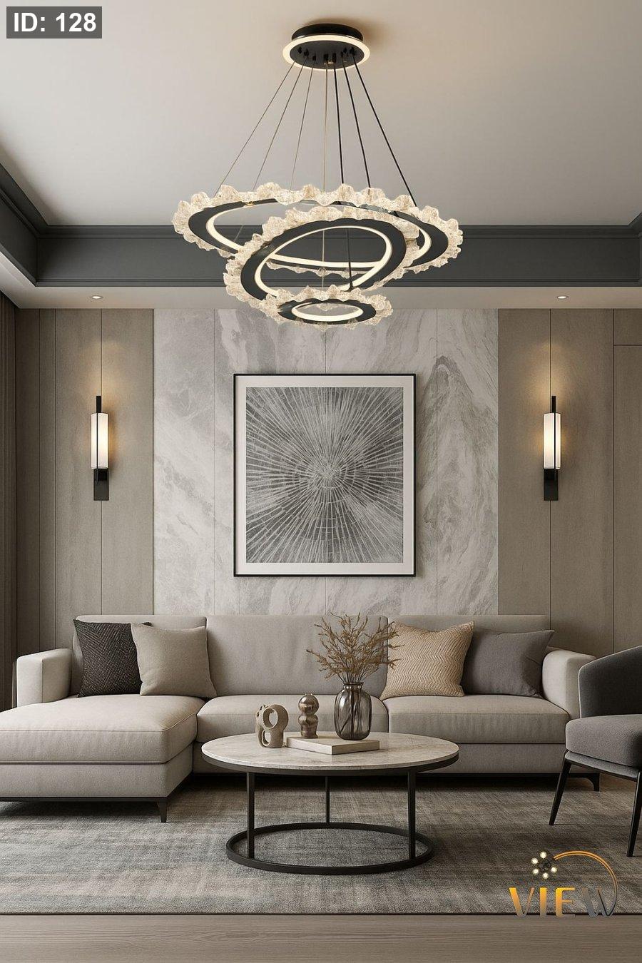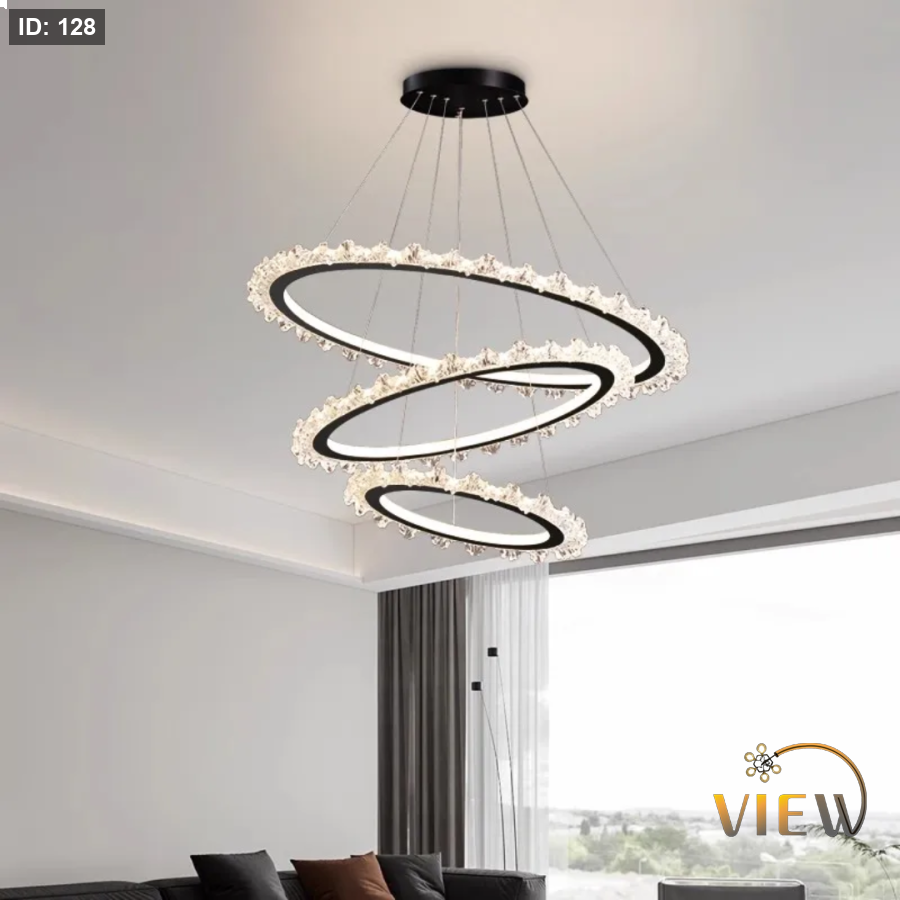 ثريا LED عصرية بتصميم حلقي متدرّج مزوّد ببديل الكريستال يحيط بالحلقات ليعكس ضوءًا أصفر دافئًا يمنح إحساسًا بالفخامة والراحة. تصميمها الانسيابي يجعلها قطعة محورية تبرز جمال السقف وتضيف لمسة راقية دون مبالغة، مناسبة للمساحات الحديثة والفاخرة.