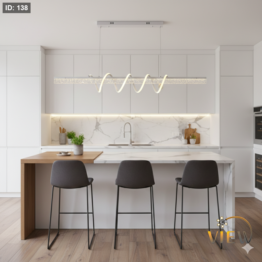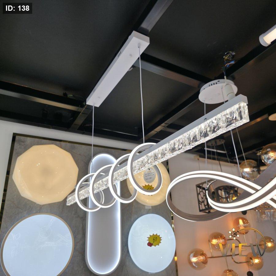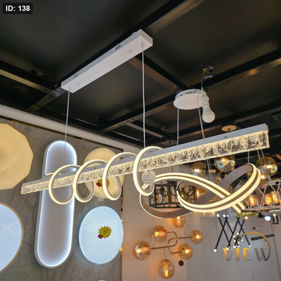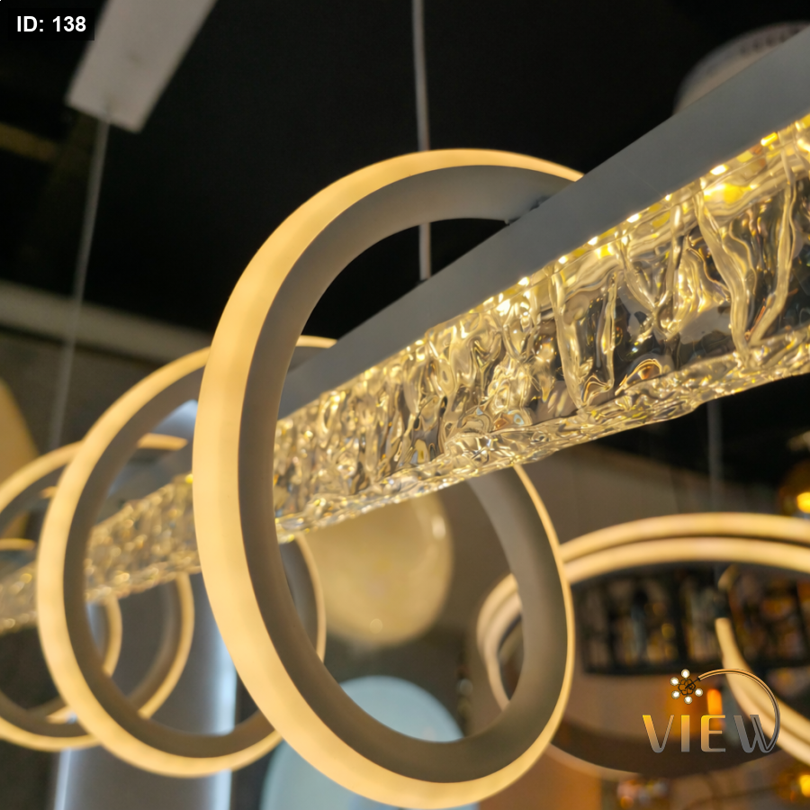 ثريا مودرن بتصميم هندسي أنيق يجمع بين الخط المستقيم والحلقات الدائرية بانسجام لافت. يتوسطها شريط بديل الكريستال الشفاف يعكس الضوء بشكل فاخر ويمنح بريقًا ناعمًا، بينما تحيط به حلقات LED مضيئة بتوزيع مدروس يضيف لمسة فنية عصرية. الهيكل المعدني باللون الأبيض يمنحها مظهرًا نظيفًا وأنيقًا، مع نظام تعليق بسيط يبرز خفة التصميم وأناقة التفاصيل.