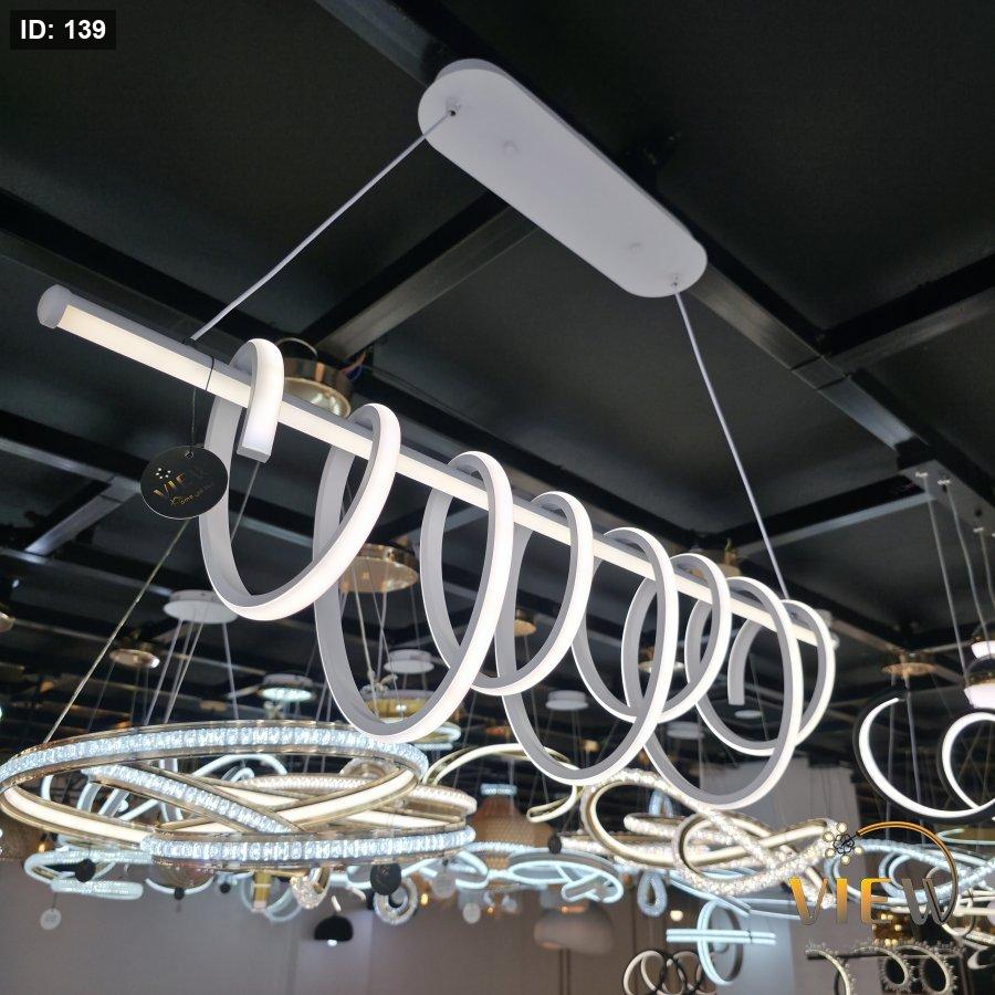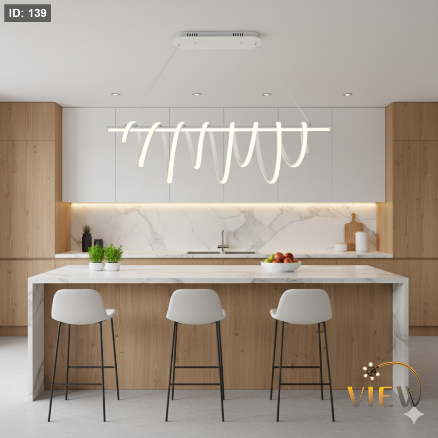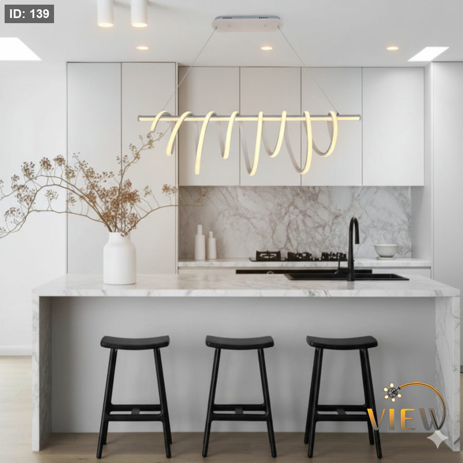 ثريا مودرن بتصميم خطّي مميز تتخلله تموجات انسيابية ناعمة تضفي إحساس الحركة والمرونة على الفراغ. تعتمد على إضاءة LED مدمجة بلون دافئ موزّعة بشكل متوازن، ما يمنح إنارة مريحة وعصرية في آنٍ واحد.