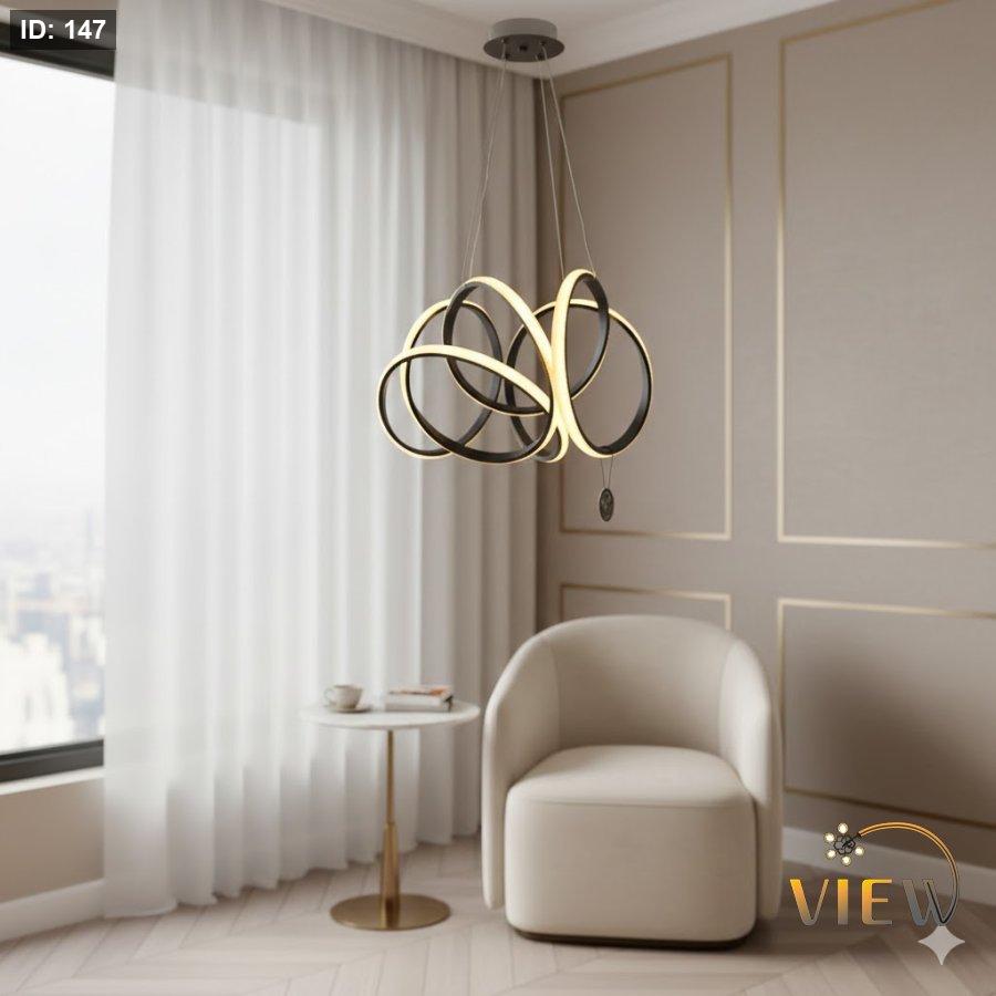 ثريا مودرن بتصميم حلقي متشابك يعكس الإبداع الهندسي المعاصر، تمنح المكان حضوراً فنياً ناعماً دون مبالغة. تعمل بتقنية LED وتوفّر 3 ألوان إضاءة (أبيض دافئ – أبيض طبيعي – أبيض بارد) لتناسب مختلف الأوقات والأجواء، مع توزيع ضوء متوازن يبرز جمال المساحة دون إزعاج بصري.