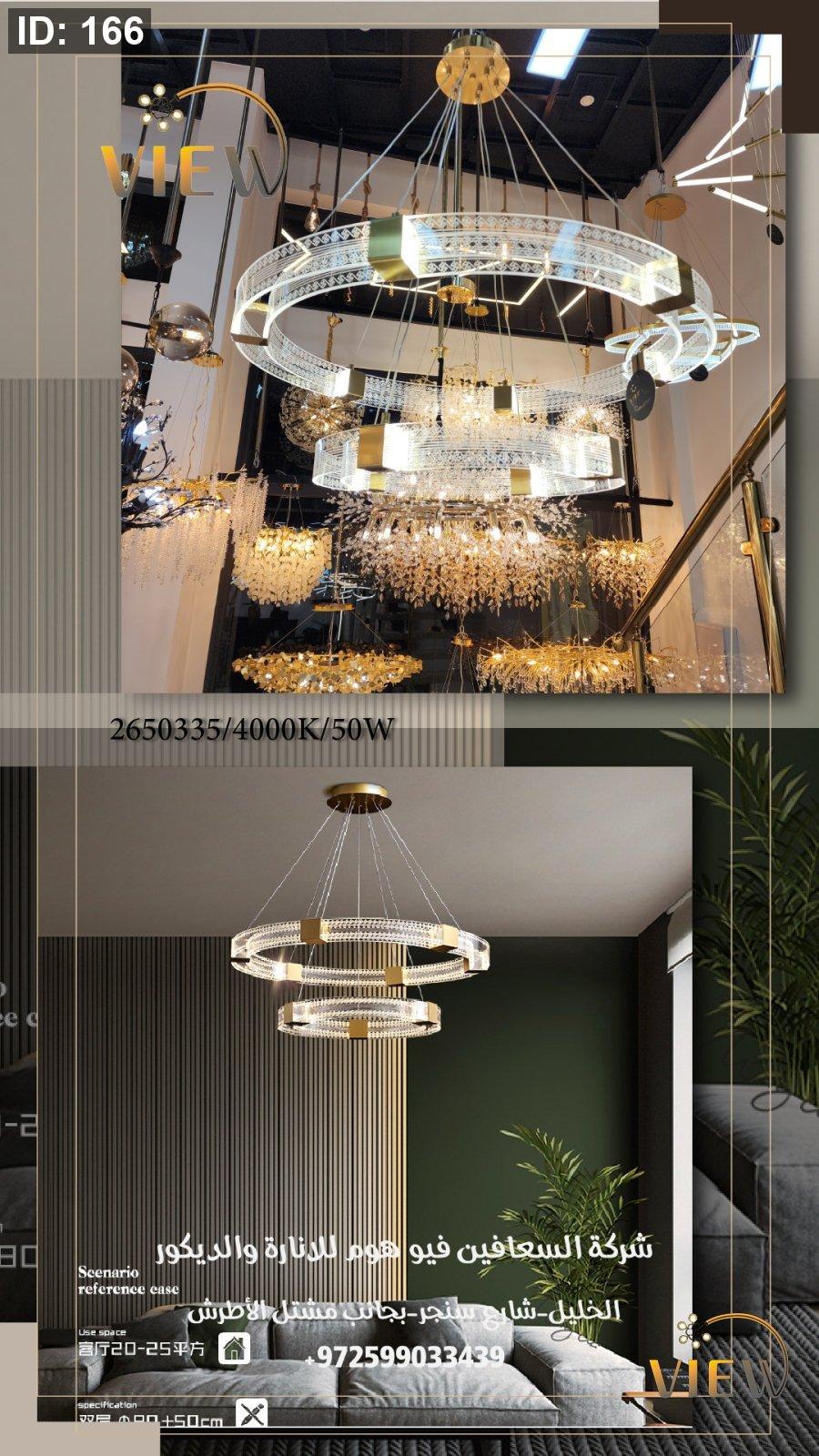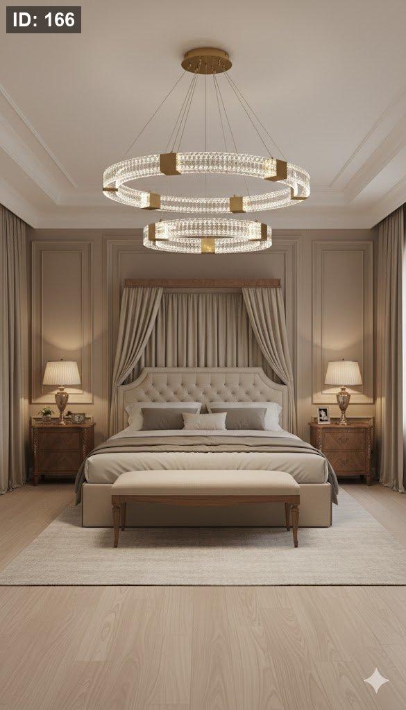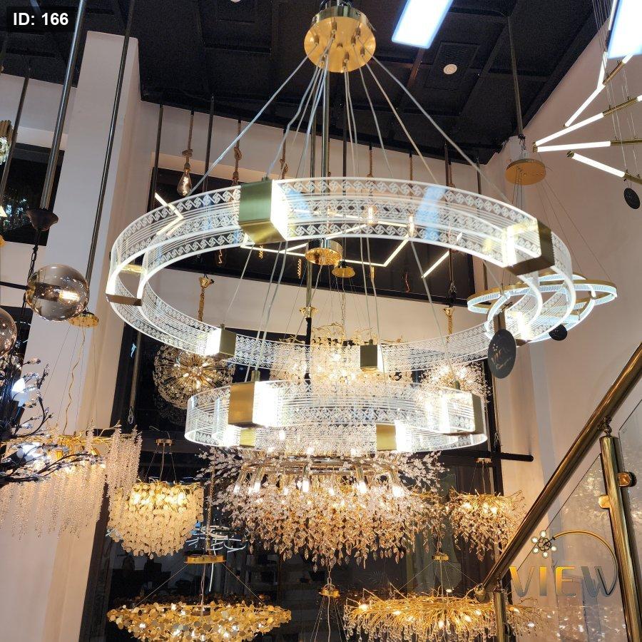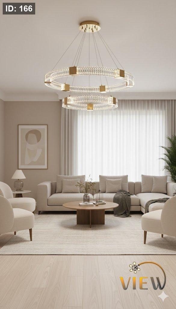 ثريا مودرن فاخرة بتصميم دائري مزدوج، تجمع بين الحلقات المتوهجة والكريستال اللامع مع لمسات ذهبية أنيقة. تعكس إضاءة متوازنة تضيف عمقاً وأناقة للمكان، وتمنح الفراغ حضوراً راقياً دون مبالغة، لتكون قطعة فنية معلّقة تلفت النظر من أول نظرة.