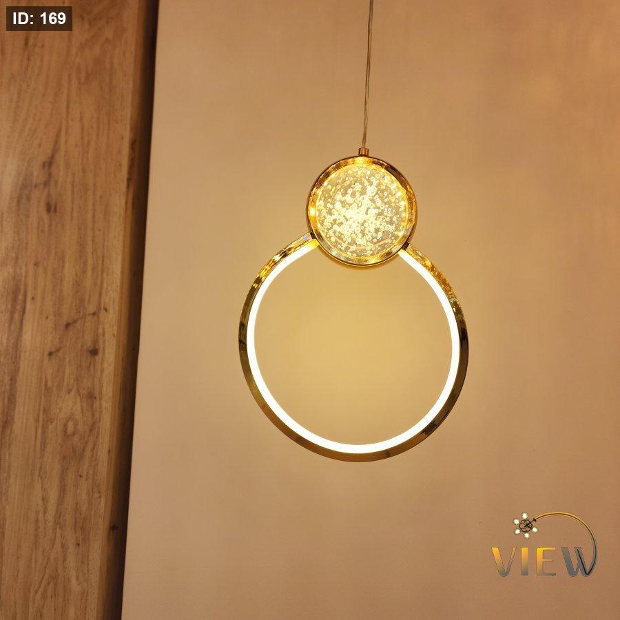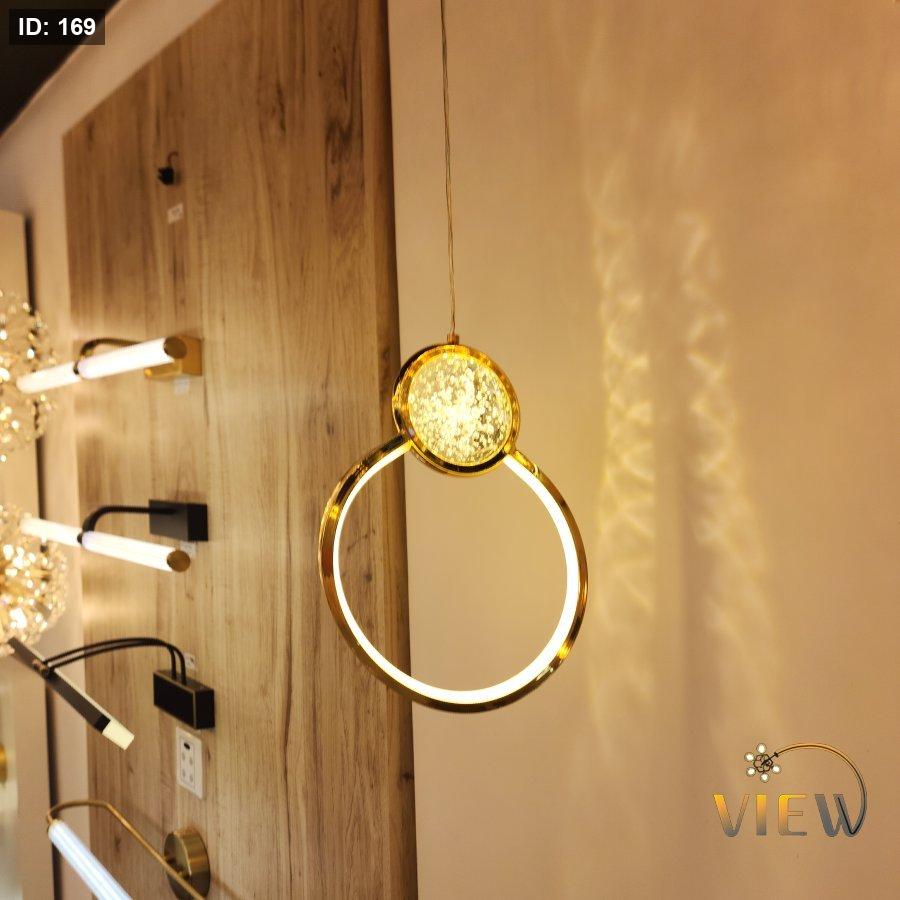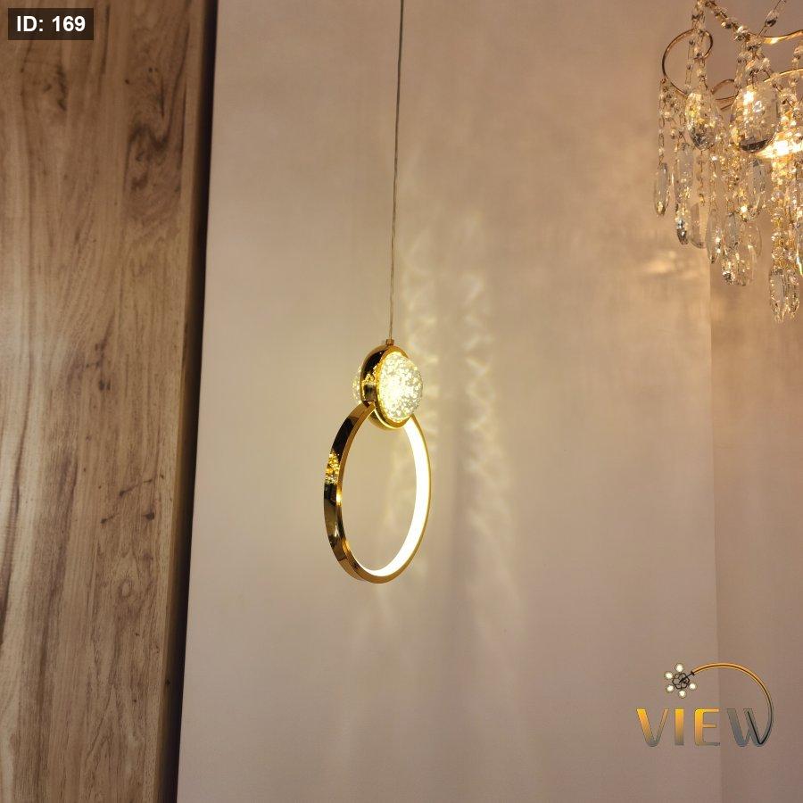معلّقة لؤلؤة بتصميم أنيق يجمع بين حلقة LED ذهبية وبلّورة كريستال متلألئة في الأعلى، لتخلق إضاءة ناعمة ومركّزة تضيف لمسة فاخرة دون ازدحام بصري.