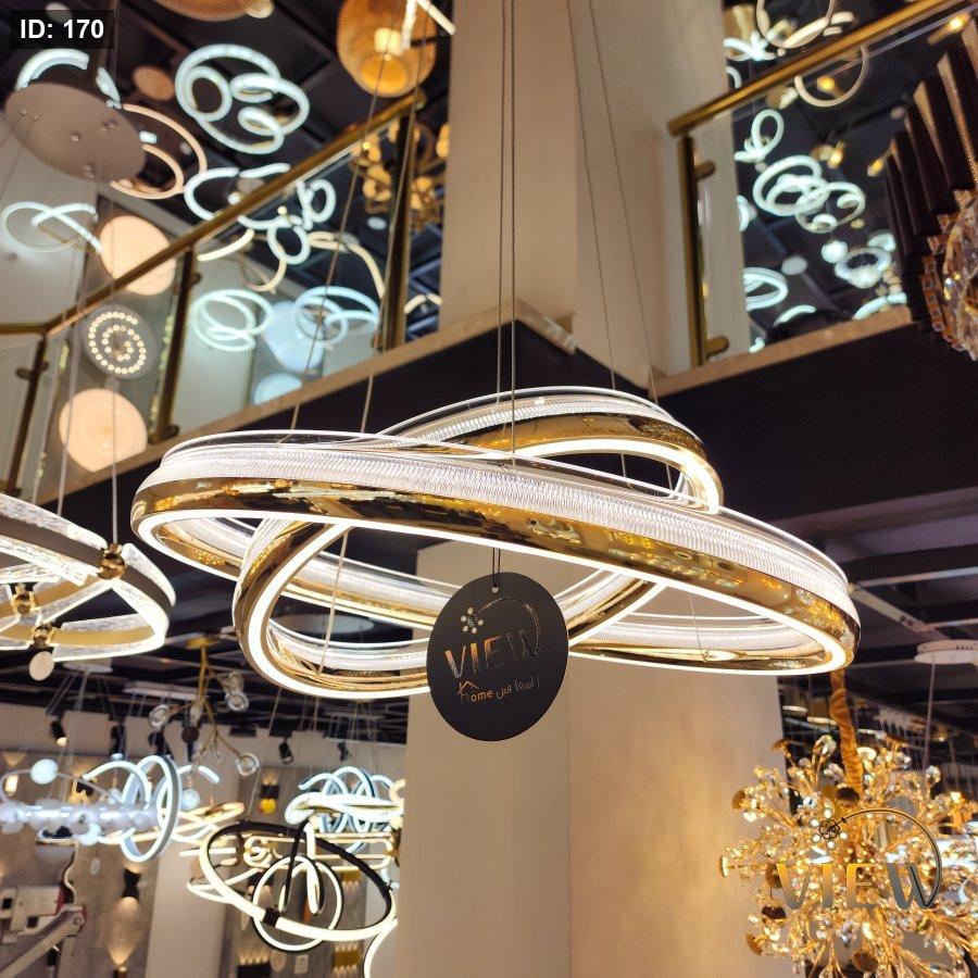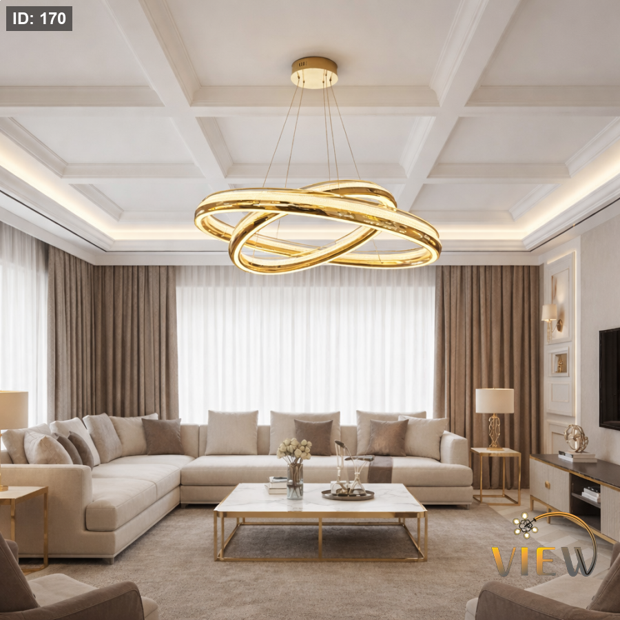 حلقات LED الذهبية تلتف بتناغم لتمنح المكان حضورًا راقيًا دون ازدحام بصري، مع إضاءة دافئة تضيف عمقًا وجمالًا للمساحة. قطعة ديكور معمارية تلفت النظر وتكمّل التصاميم العصرية والفاخرة.