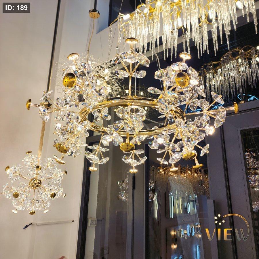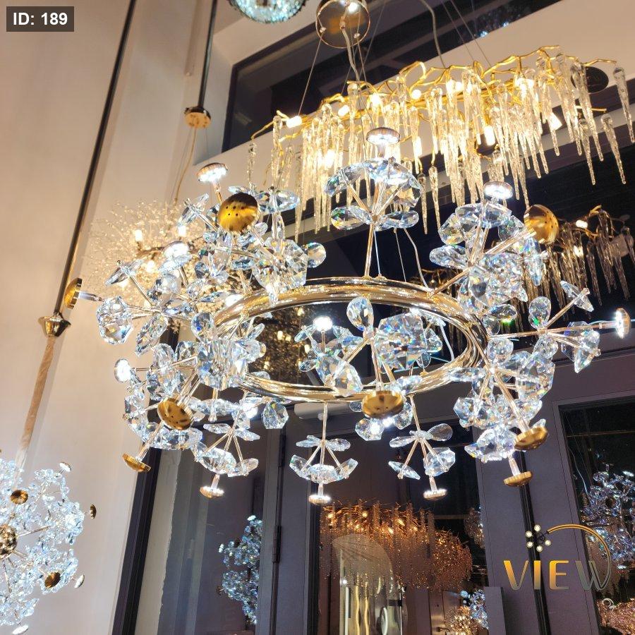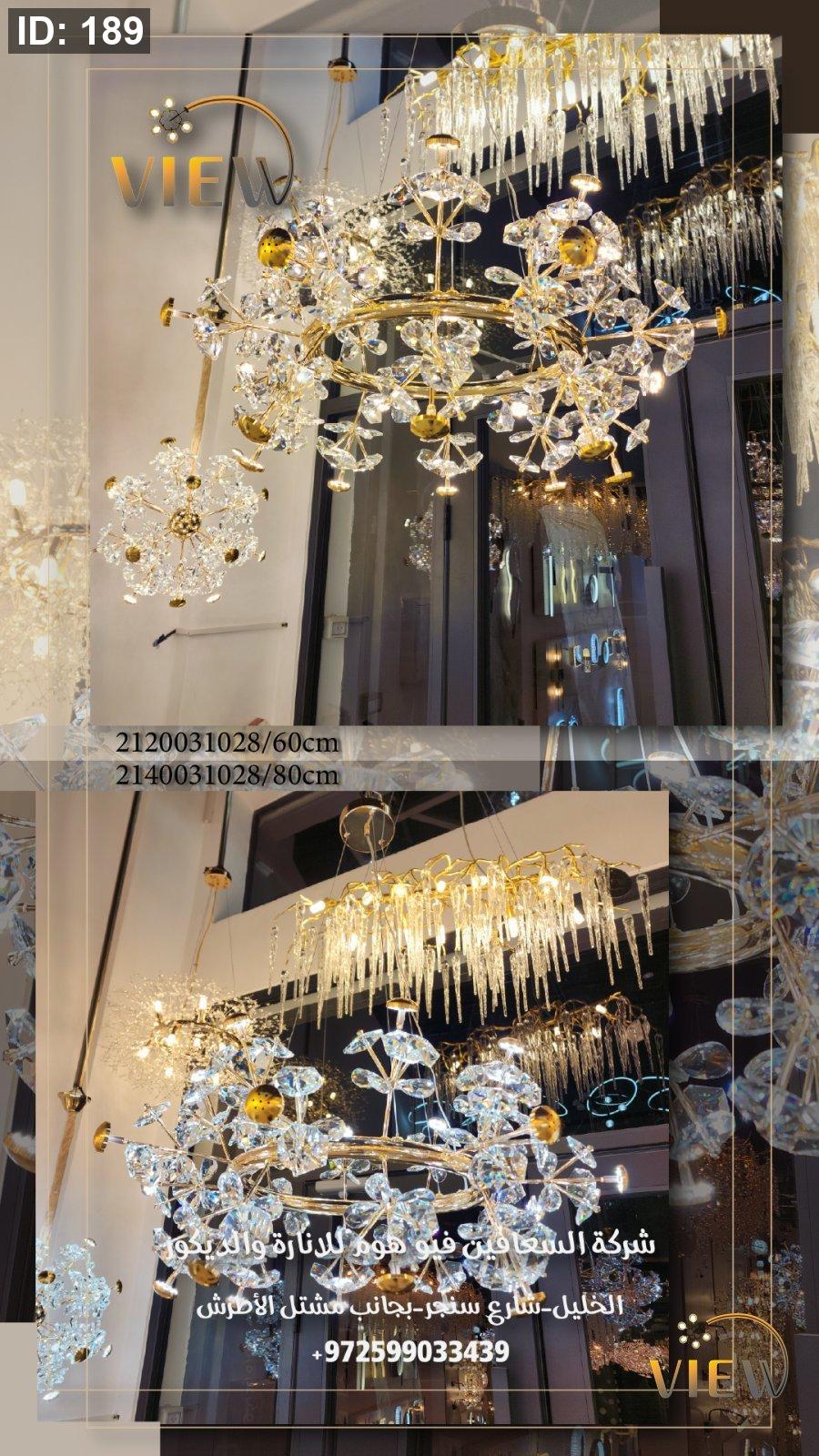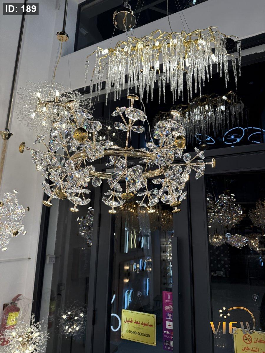 ثريا حجار الكريستال الدائري تأتي بتصميم فخم يعتمد على حلقة ذهبية أنيقة تتفرّع منها أحجار كريستالية لامعة تمثل مزيجاً مثالياً بين الفخامة والرقي. انعكاسات الضوء على الحجار تعطي وهجاً ساحراً يضيف عمقاً ولمعاناً للمكان، لتصبح الثريا قطعة ديكور رئيسية تلفت الأنظار وت elevates the entire room.