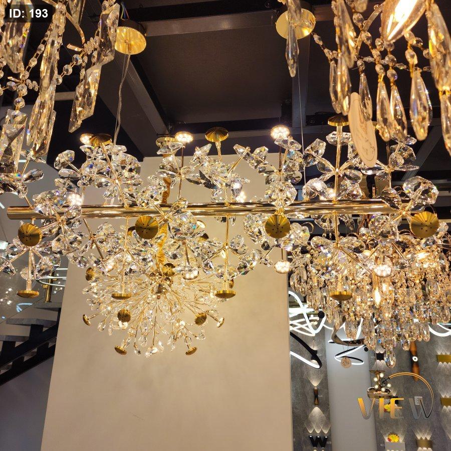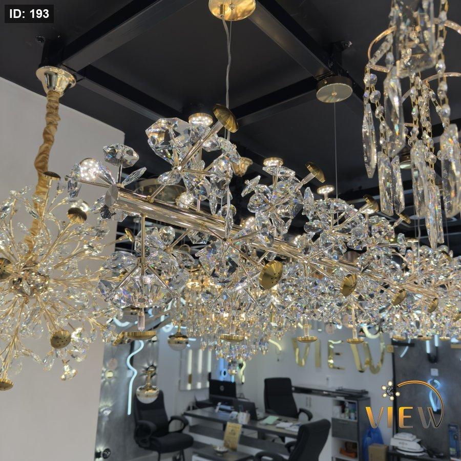ثريا حجار الكريستال المستطيل تتميز بتصميم فاخر يعتمد على هيكل ذهبي مستطيل تتدلّى منه أحجار كريستالية براقة مرتّبة بطريقة جذابة تضفي عمقاً ولمعاناً على الإضاءة.