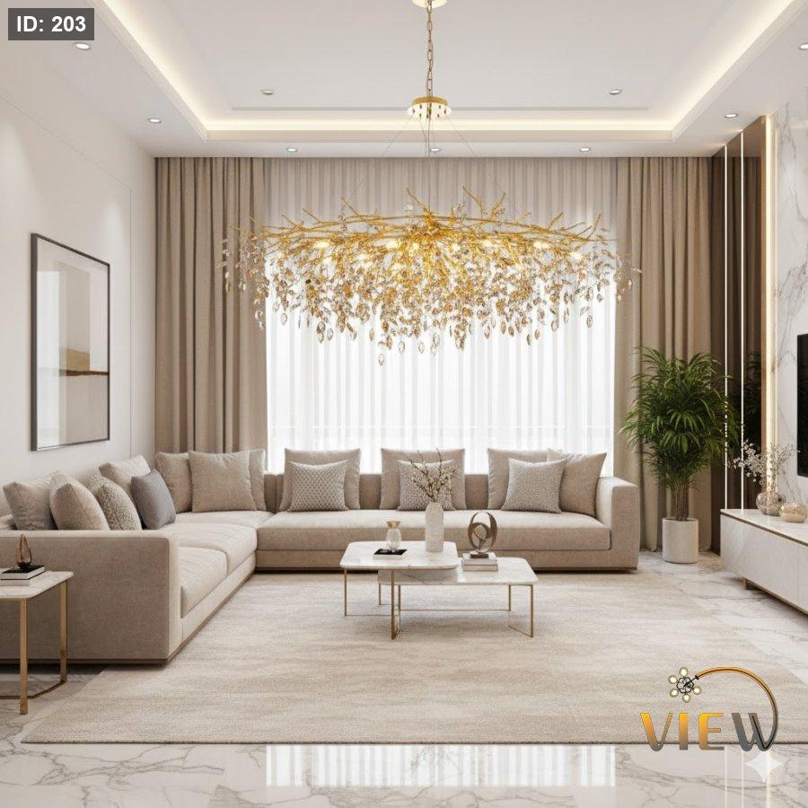 ثريا فاخرة بتصميم مستوحى من شكل المحار، تجمع بين اللمعان الكريستالي والهيكل الذهبي الانسيابي لتمنح المكان ضوءًا راقيًا ومتناغمًا.