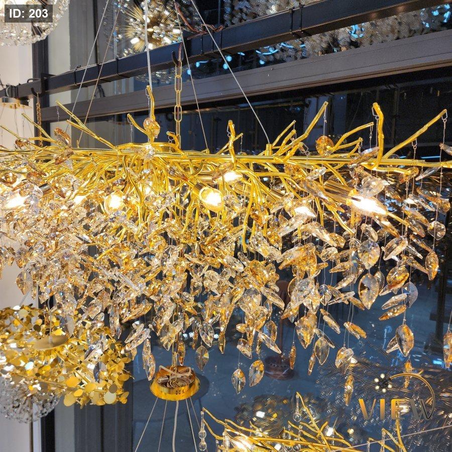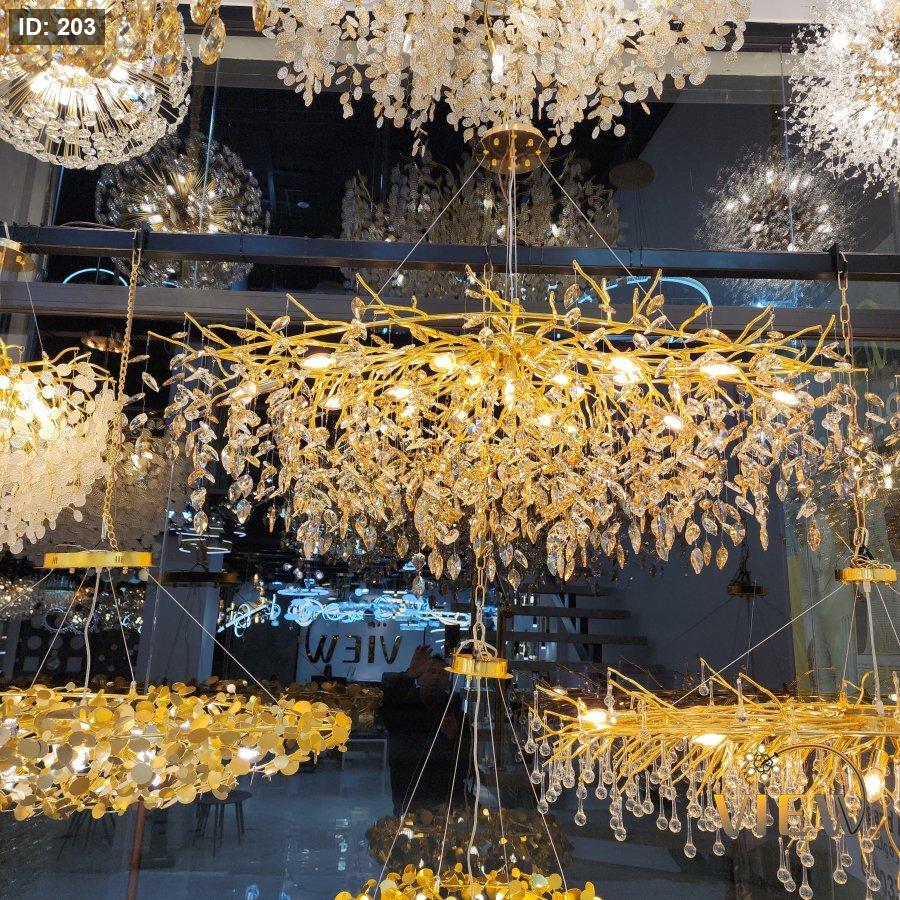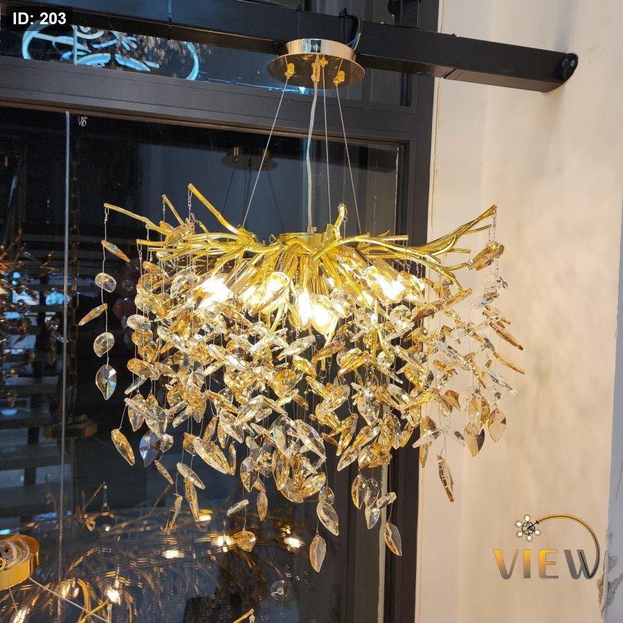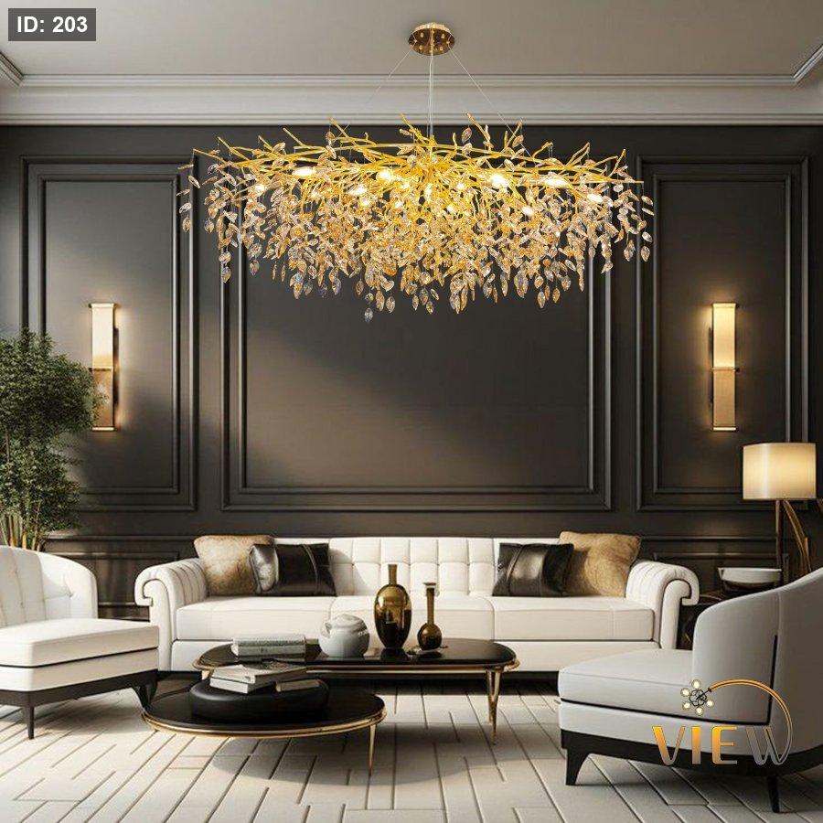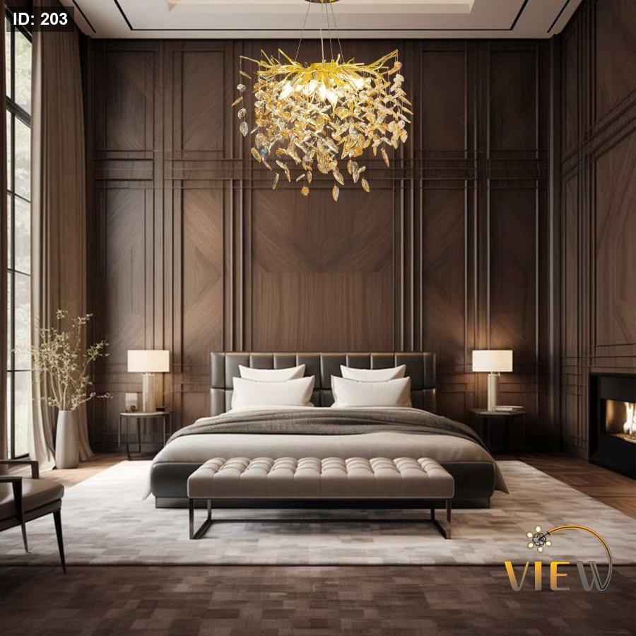 توزيع الكريستالات يشبه قطرات لامعة تنسدل برقة، مما يخلق إضاءة دافئة وانعكاسات مبهرة تضيف إحساسًا بالفخامة والرقي في أي مساحة.