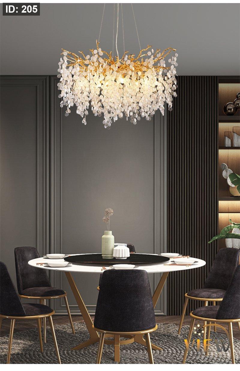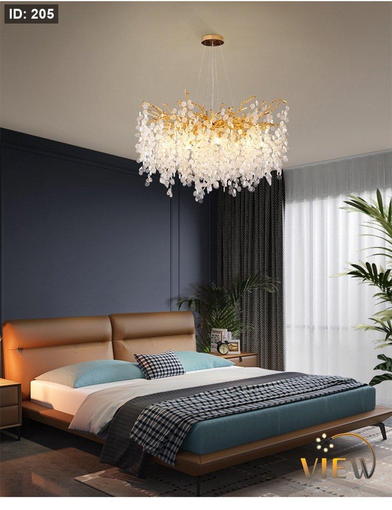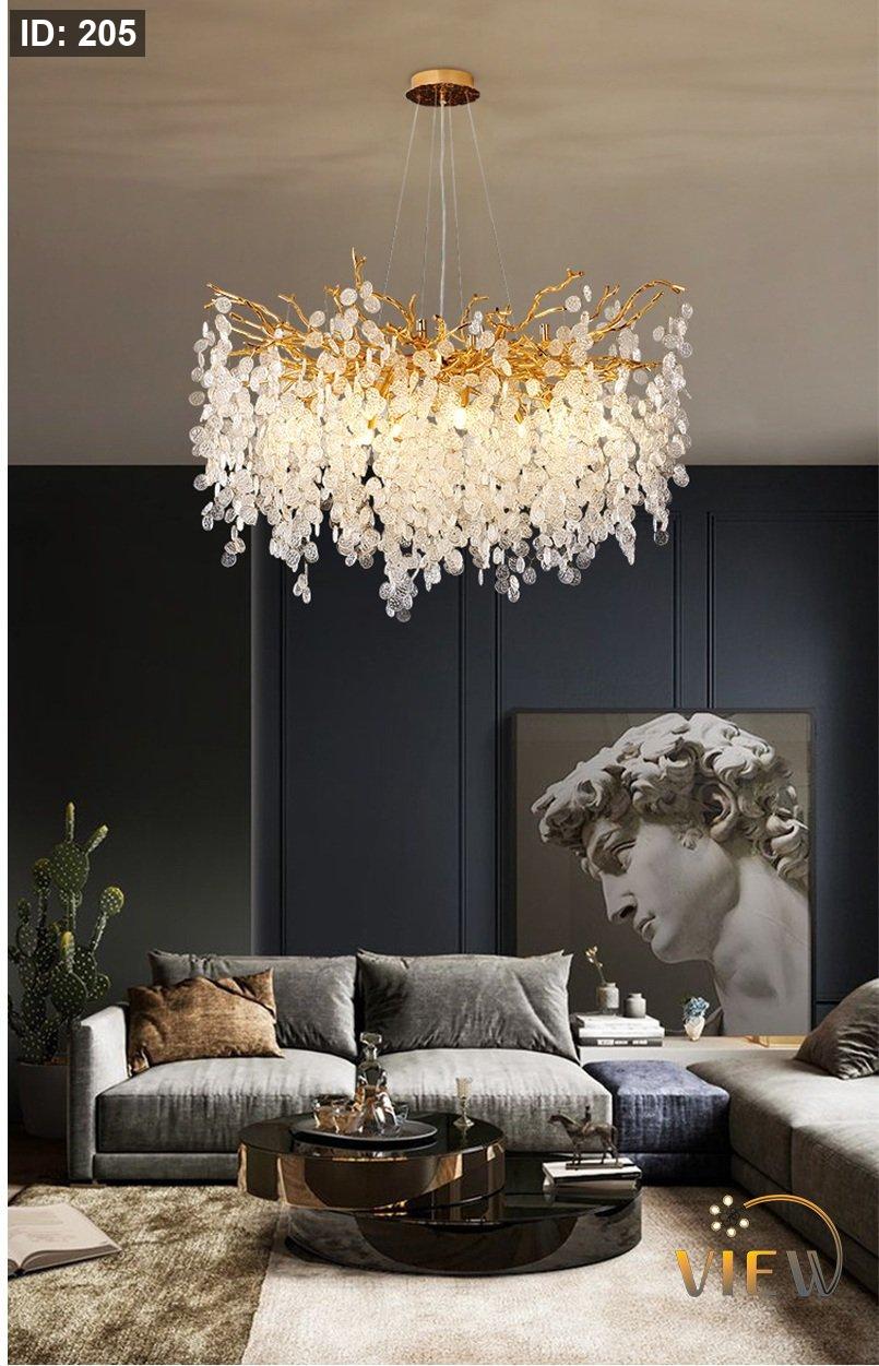 ثريا فاخرة بتصميم مستوحى من جمال الشلالات المتلألئة، تتدلى فيها كريستالات ناعمة تشبه اللآلئ البيضاء على فروع ذهبية أنيقة.