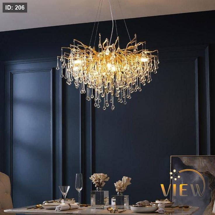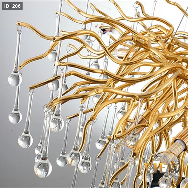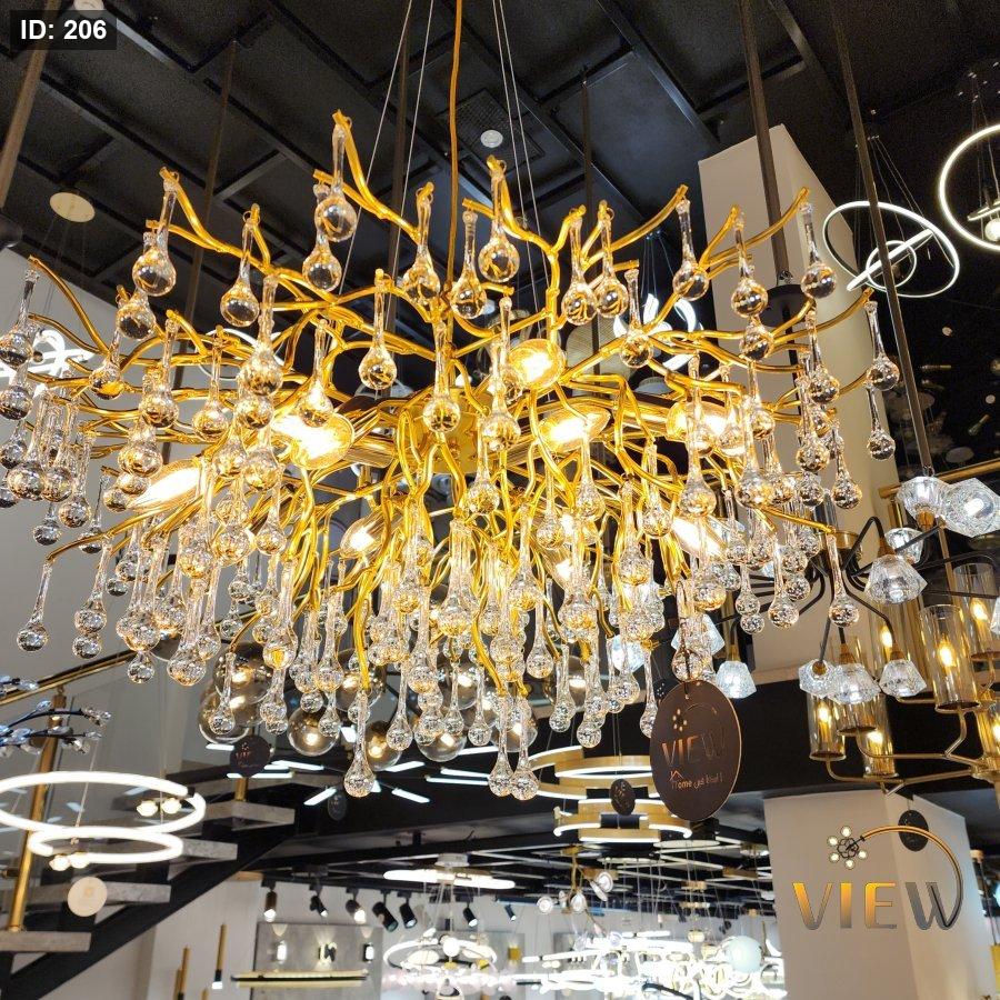 ثريا فاخرة بتصميم فريد يجمع بين العصرية والنعومة، تتكوّن من فروع ذهبية تنسدل منها قطرات كريستالية شفافة تشبه "الدموع اللامعة".