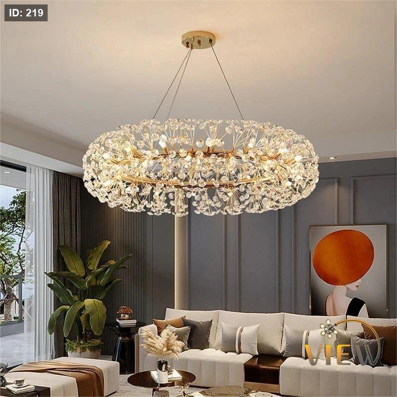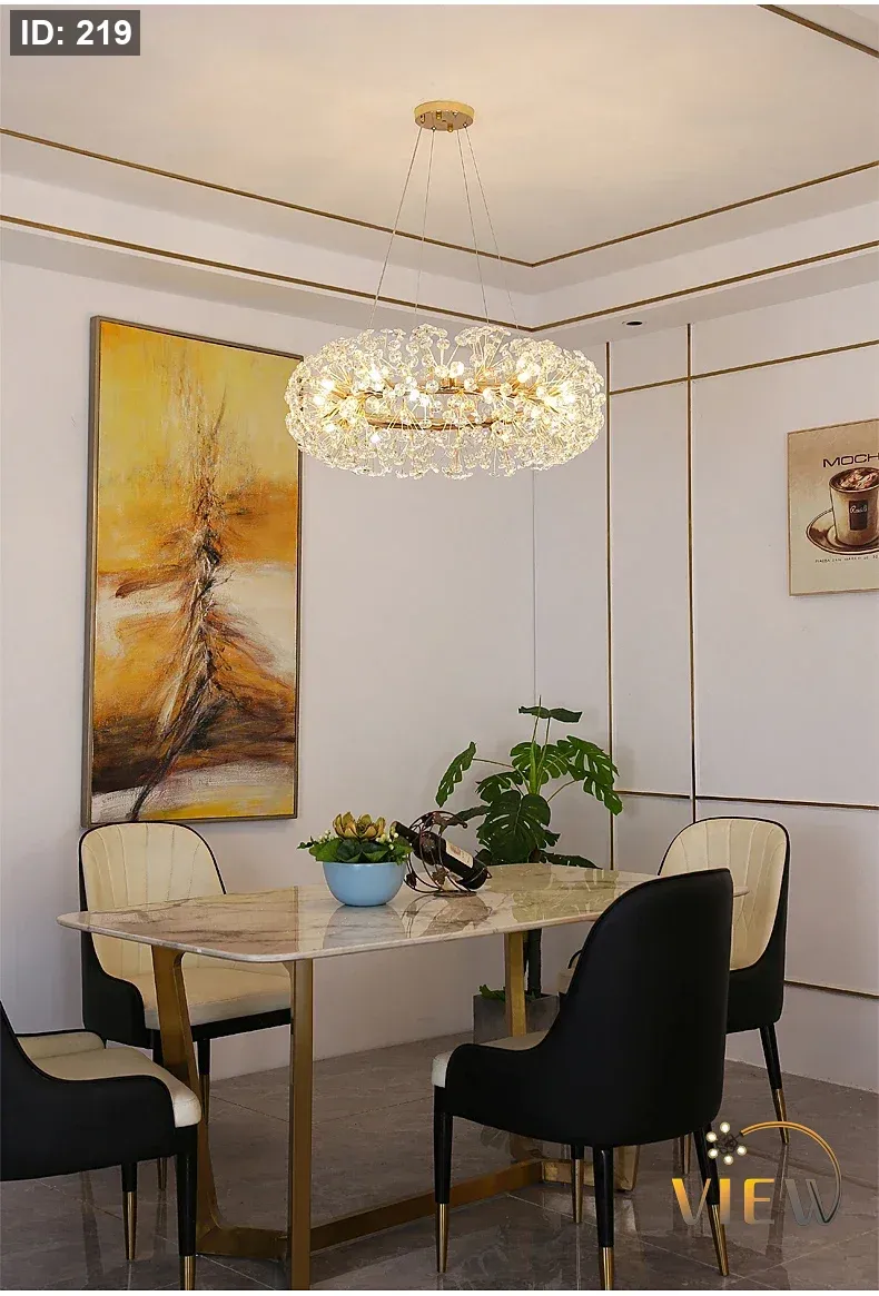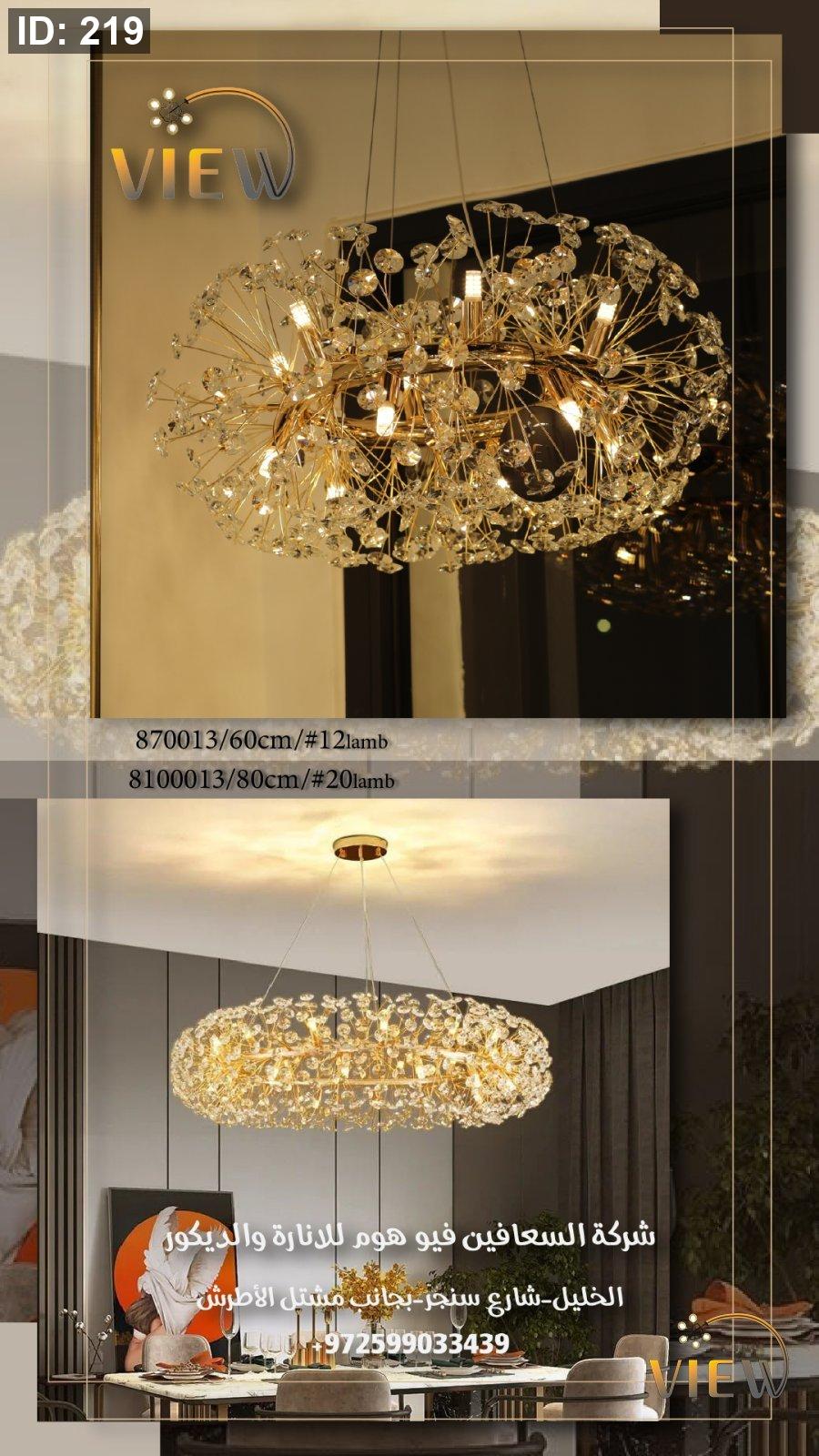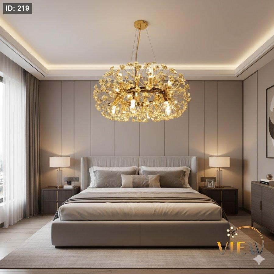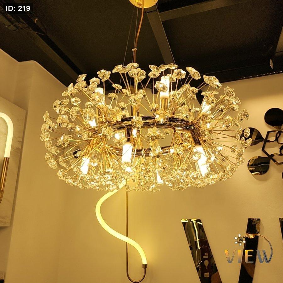 تأتي بتركيبة ذهبية فاخرة محاطة بقطع كريستال متلألئة تعكس الضوء من كل اتجاه، لتصنع هالة ضوئية ساحرة تضيف عمقًا وأناقة للمكان.