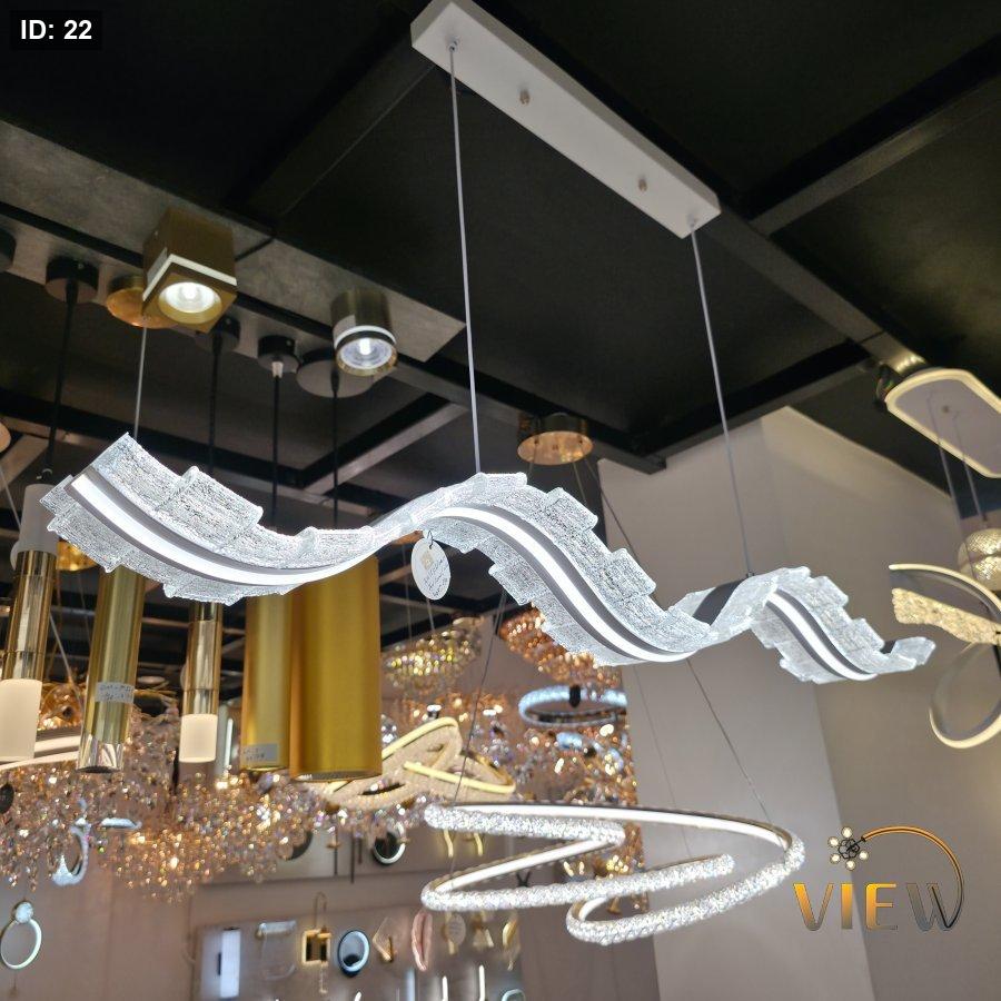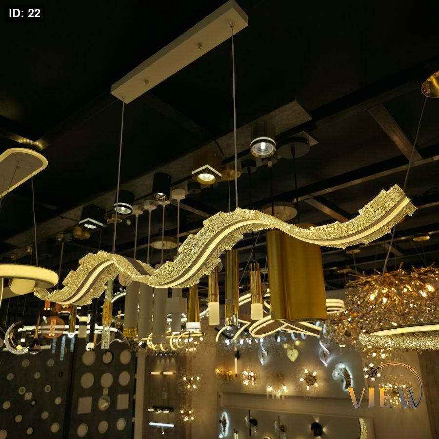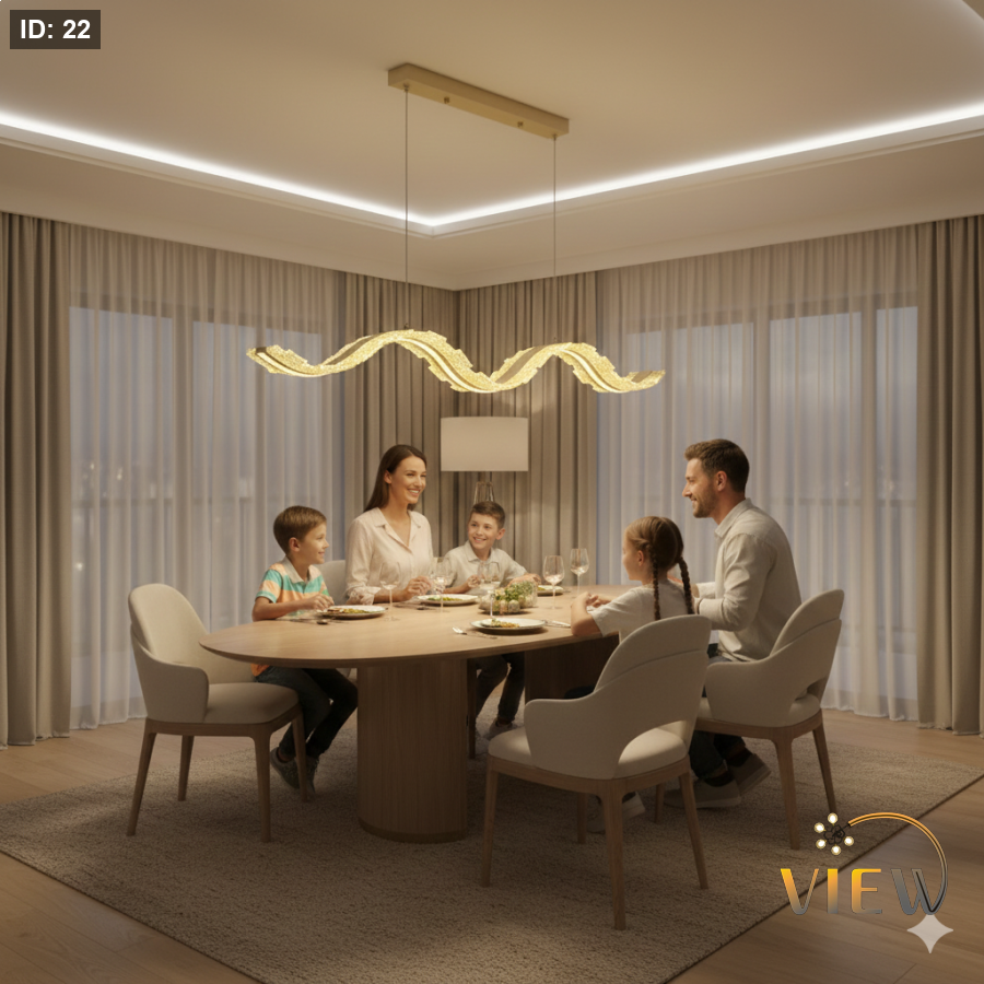 ثريا مميّزة بتصميم متموّج أنيق مزخرف بشكل كريستال ذهبي فاخر، تعكس الضوء بشكل جذاب وتضيف لمسة فنية راقية للمكان. إضاءتها الدافئة تخلق أجواء مريحة وفخمة، مثالية لطاولات الطعام والمساحات العصرية.
