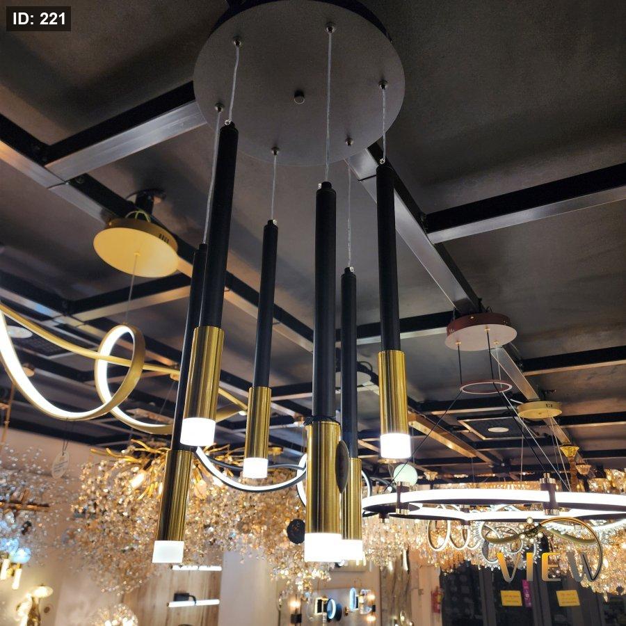 ثريا سلندرات بتصميم مودرن يجمع بين الأسود المطفأ والذهبي اللامع لتبدو كقطع ضوء معلّقة بانسيابية رائعة.