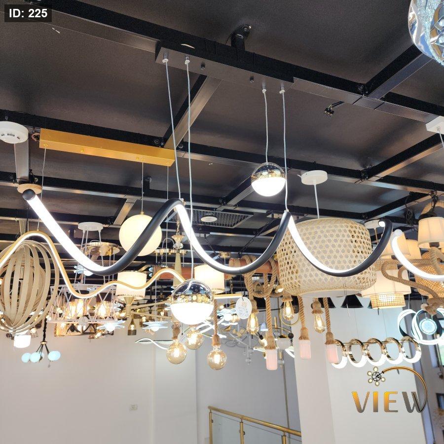 ثريا موجة الضوء بتصميم مودرن فريد يجمع بين انحناءة LED المضيئة باللون الأبيض وخطوطها السوداء الأنيقة، مع كرتين كرويتين عاكستين يتدلّيان من القاعدة ليمنحا لمسة توازن وجاذبية.
