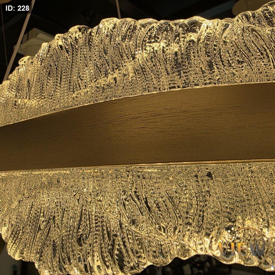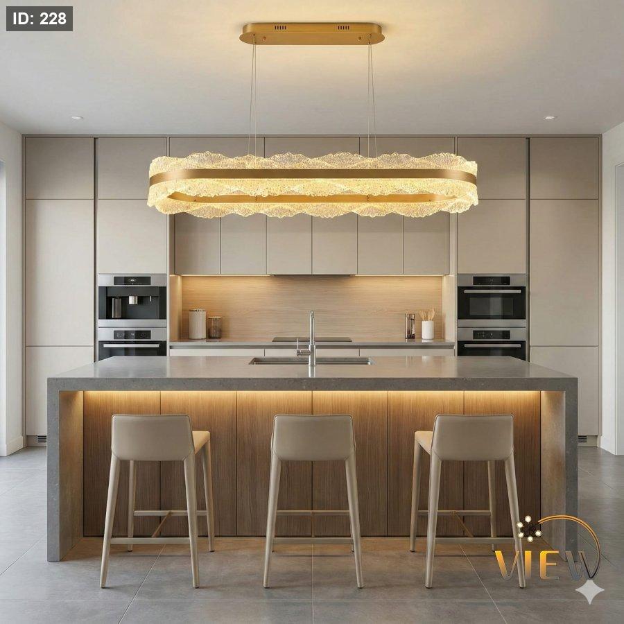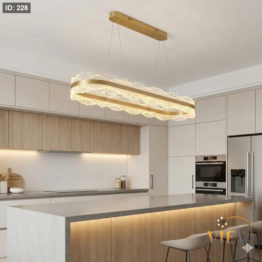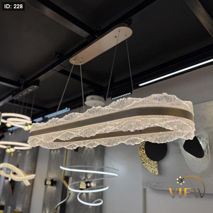 ثريّا اللـمـســة المخـمليـة تتميز بتصميم مستطيل رفيع تتدلّى منه حافة توحي لشكل كريستالية ناعمة تشبه تموّجات القماش المخملي المضيء. توزع الضوء بشكل دافئ ومتوازن، مما يعطي الطاولة أو المساحة أسفلها لمسة فاخرة وهادئة في الوقت نفسه.