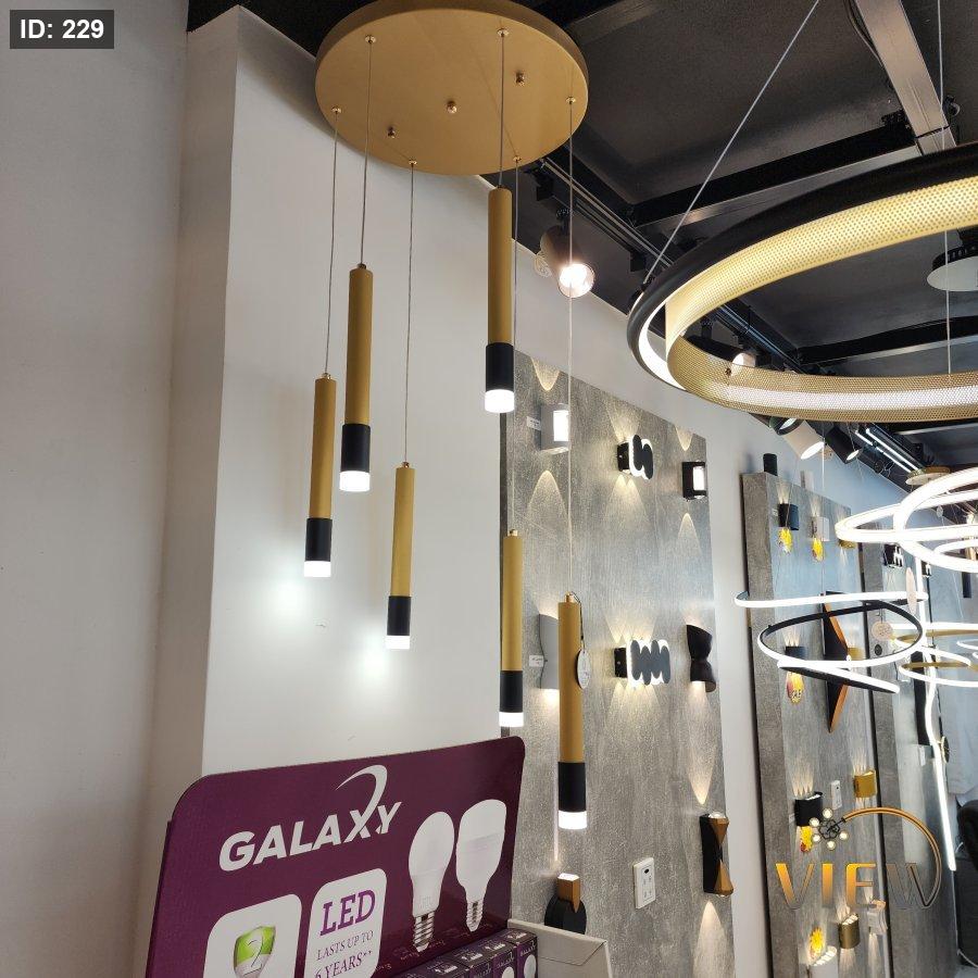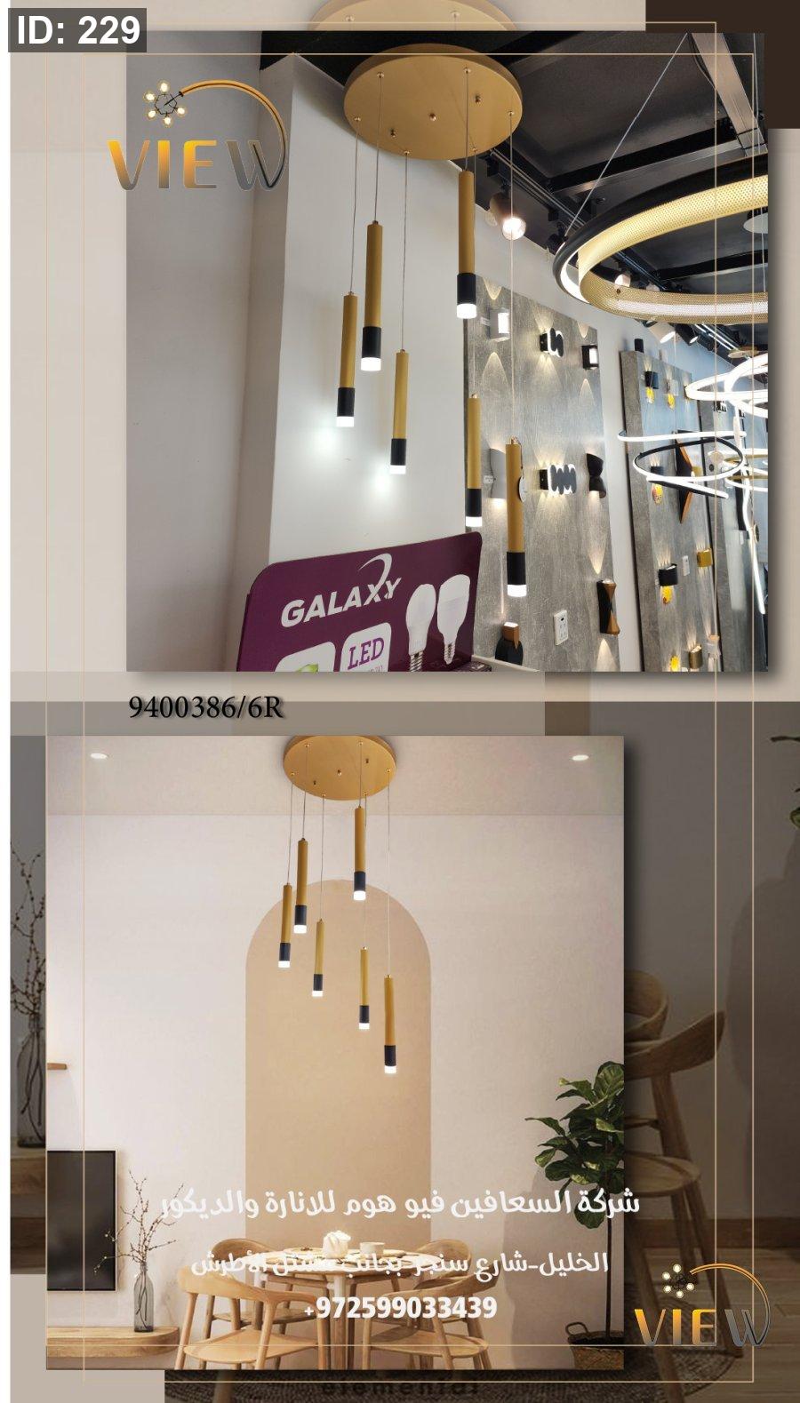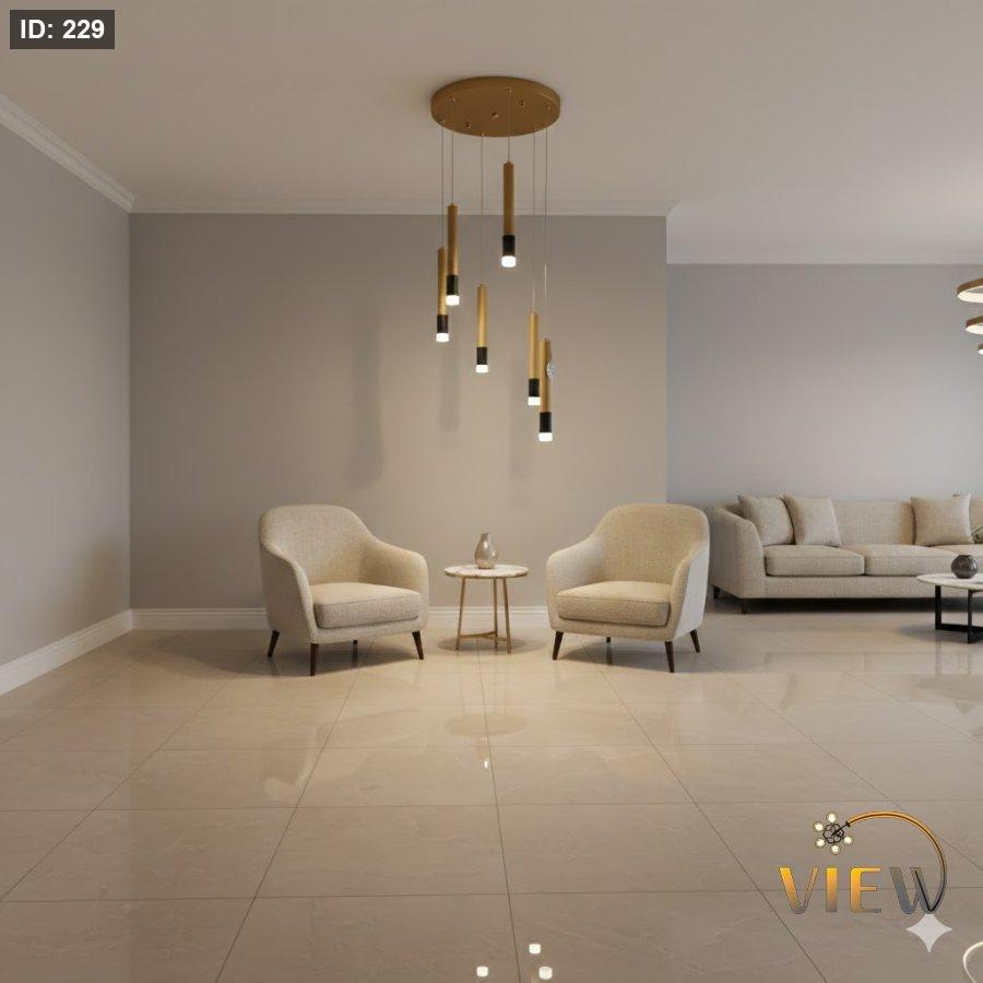 ثريّا انسياب الأسطوانات تتميّز بستّة سلندرات ذهبية نحيفة تتدلّى بانسيابية متفاوتة الارتفاع، مما يعطي حركة بصرية راقية دون أي تعقيد. تصميمها الذهبي مع الأطراف السوداء يخلق توازناً مثالياً بين الفخامة والحداثة، بينما تضيف الإضاءة البيضاء لمسة نقاء تضبط أجواء المكان بدقة.