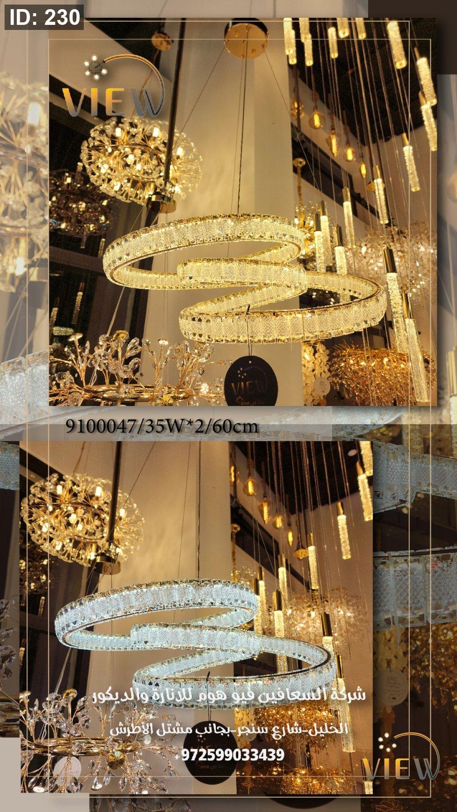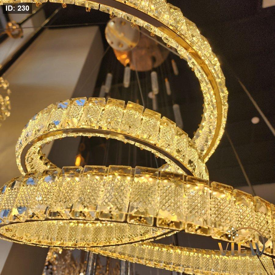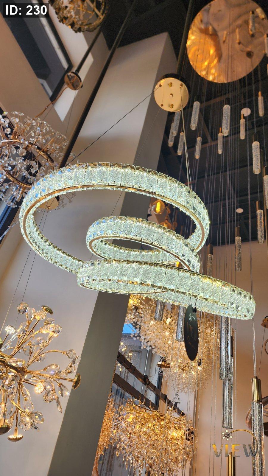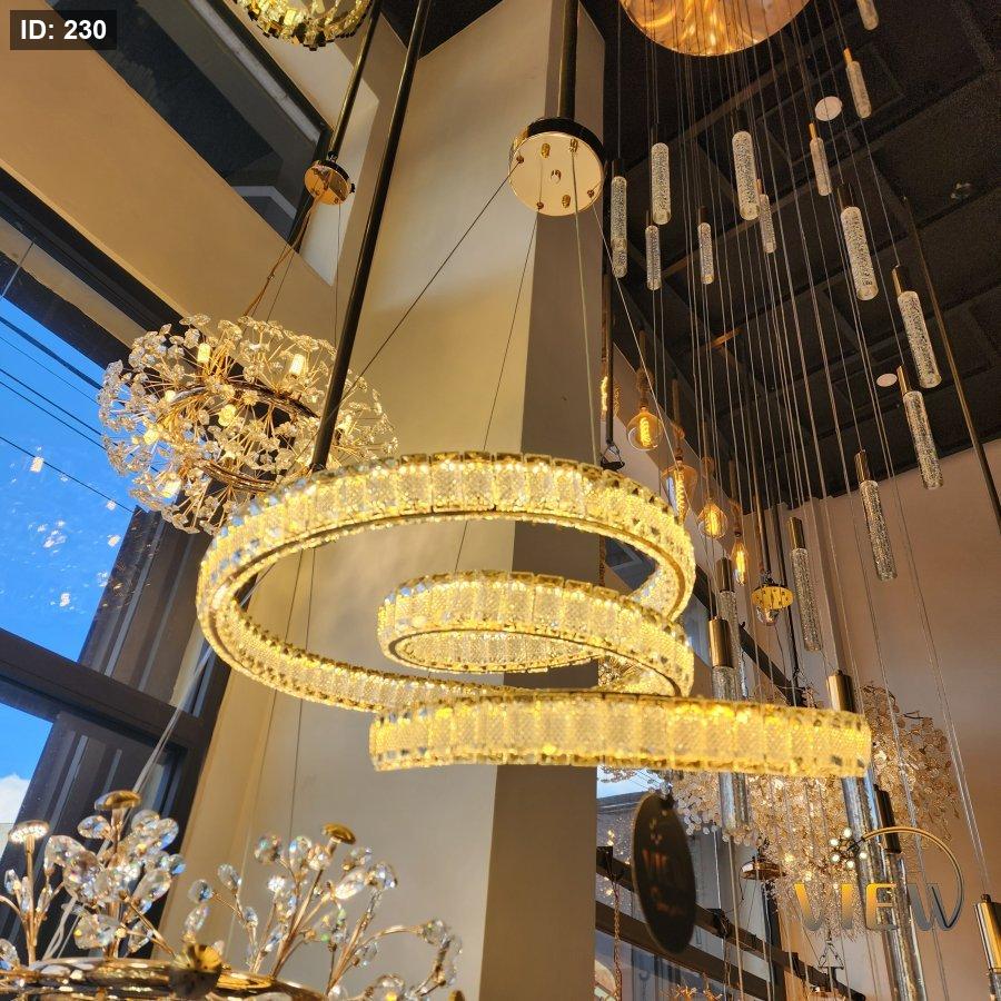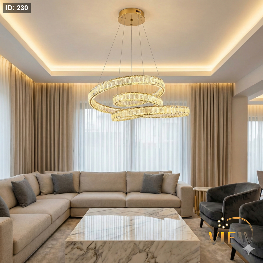ثريّا هيبة الكريستال تأتي بتصميم حلَقي مزدوج من الكريستال المشكّل بعناية، حيث تنعكس الإضاءة الذهبية على كل قطعة كريستالية لتخلق وهجاً مترفاً يشبه تياراً دائرياً من المجوهرات.