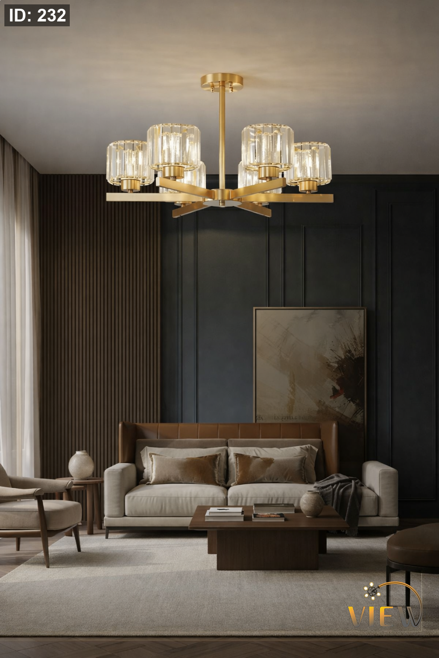 ثريّا مونو تتميز بتصميم مودرن راقٍ يجمع بين الهيكل الذهبي المستقيم وكاسات الكريستال المخططة التي تعكس الضوء بشكل ناعم ومترف. تصميمها الانسيابي يعطيها حضوراً فخماً دون مبالغة، ويجعلها قطعة رئيسية تكمل الديكور العصري بكل أناقة.