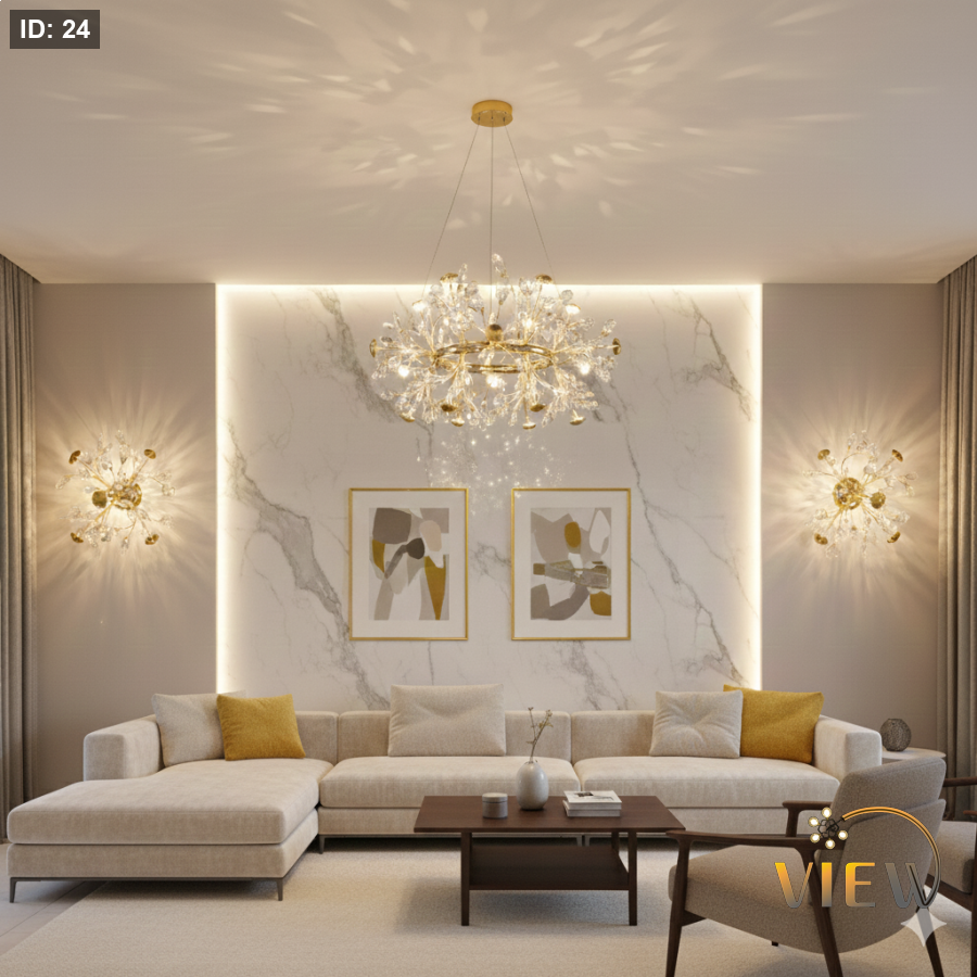 إنارة جدارية كريستال بتصميم ذهبي أنيق، تجمع بين الفخامة واللمسة العصرية.