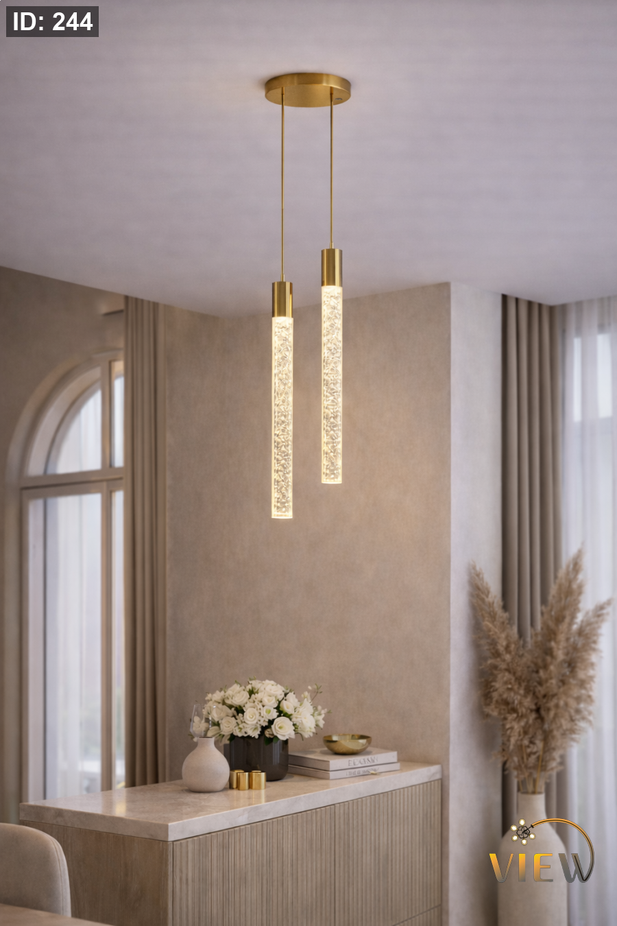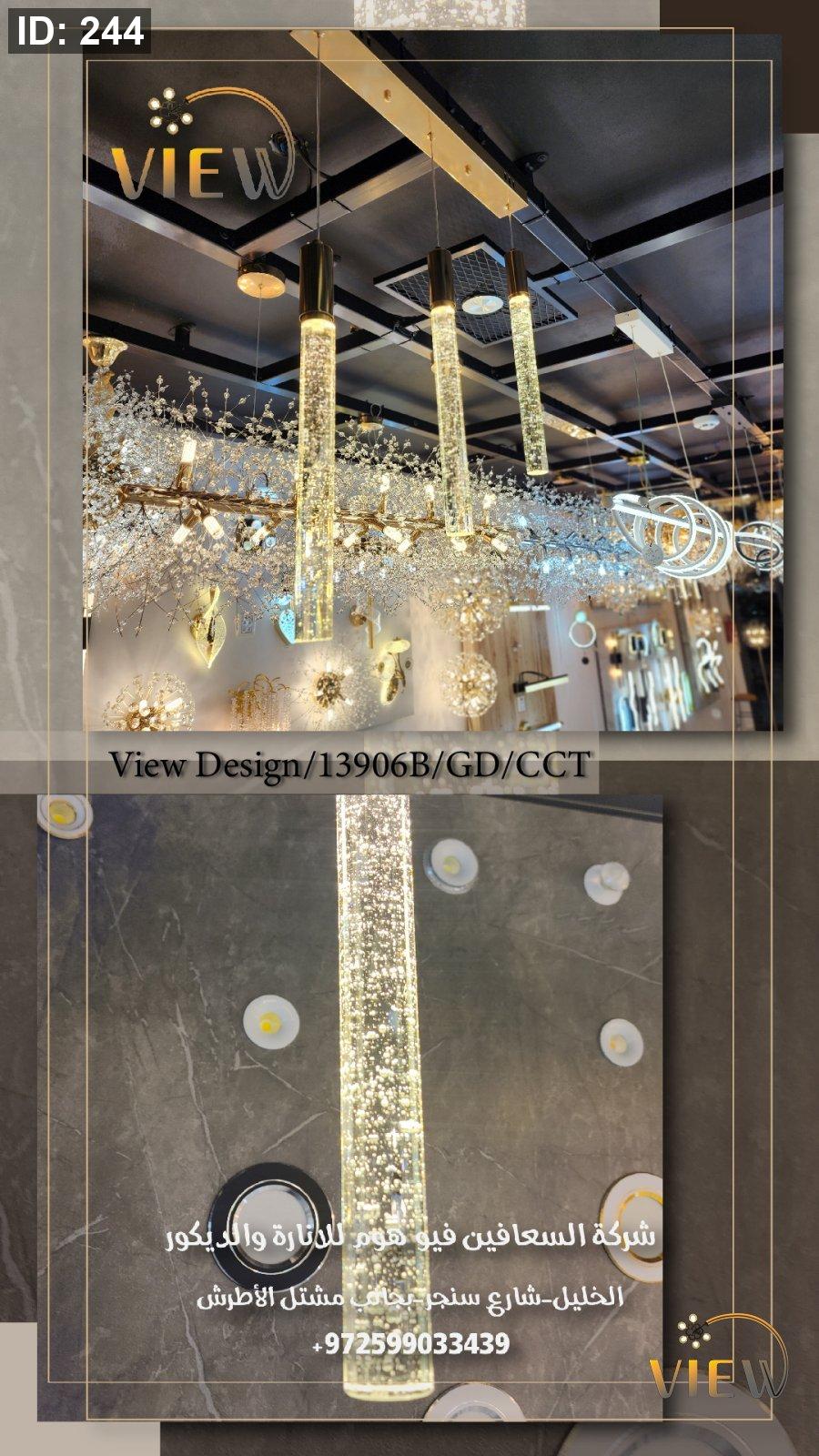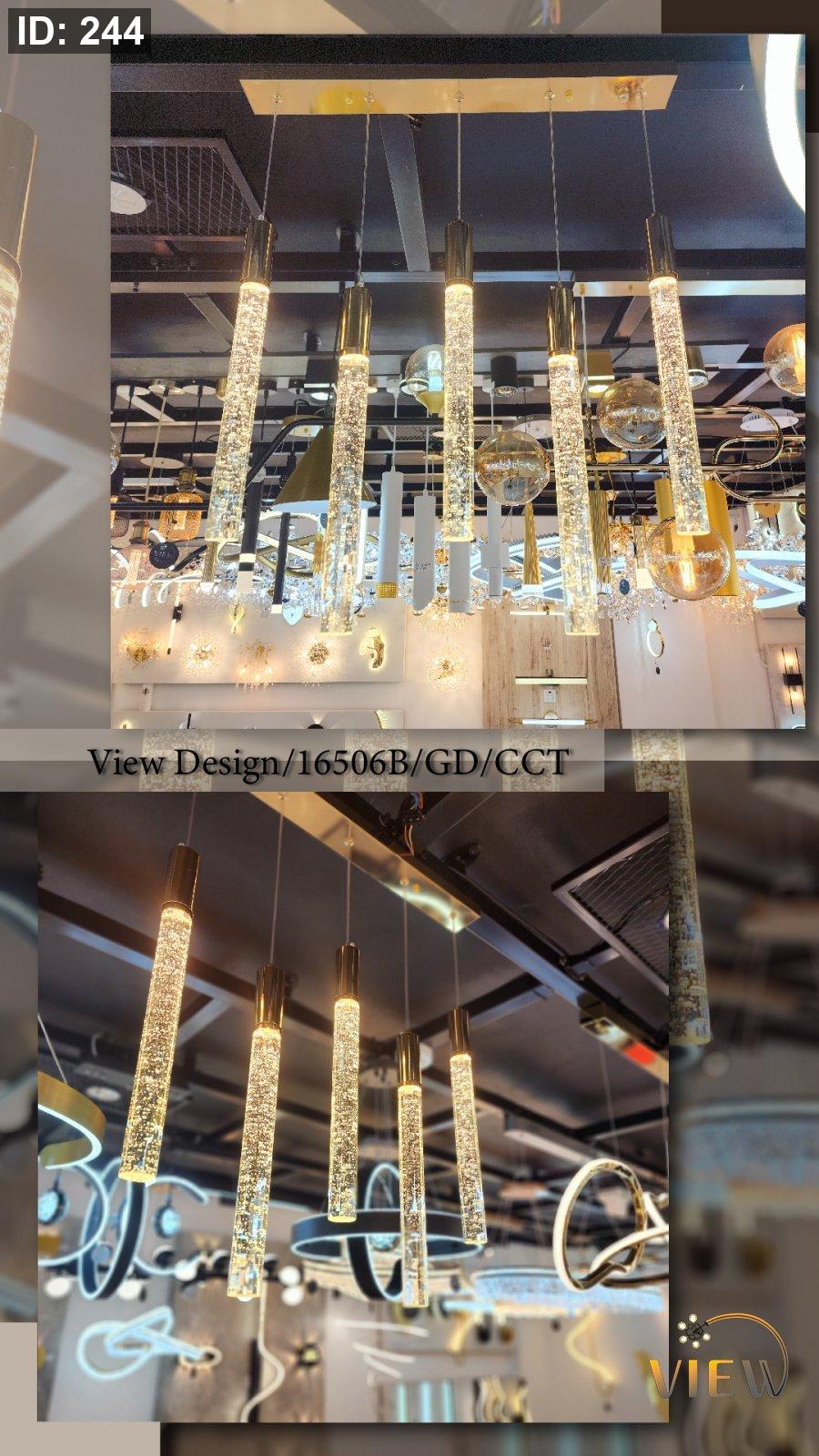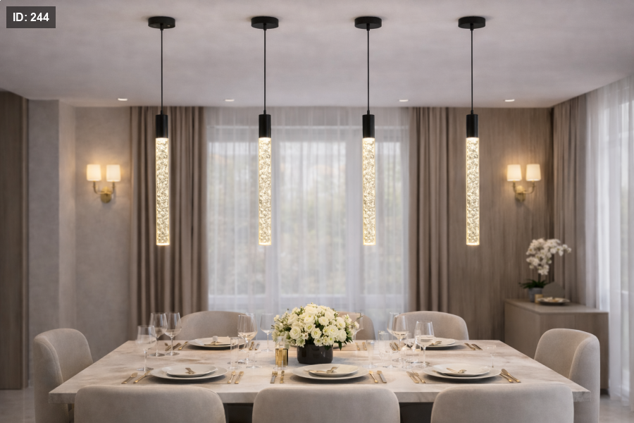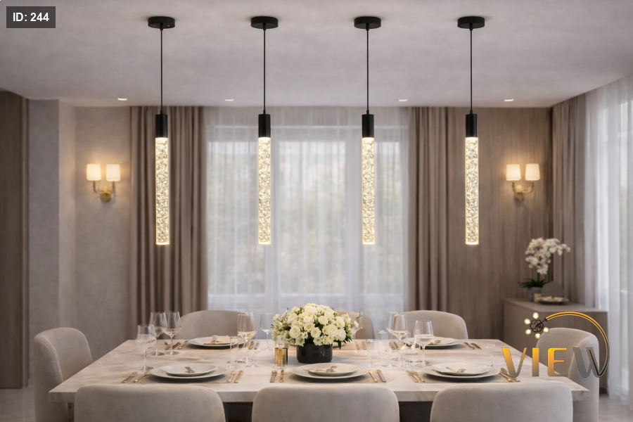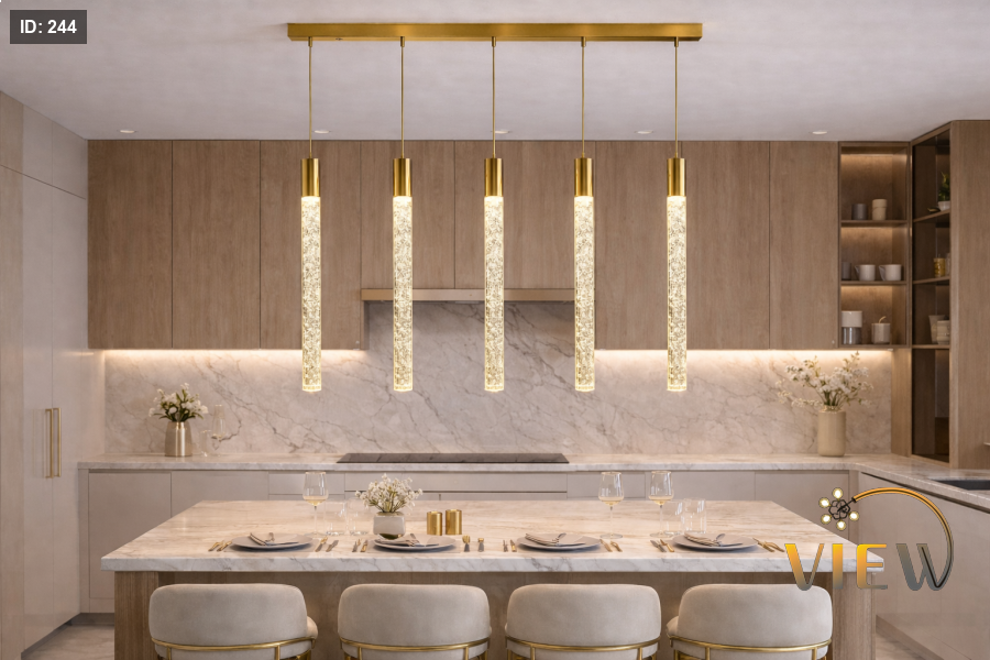 معلّقة مودرن بتصميم أسطواني مضلّع يمنحها حضورًا فريدًا، مع إضاءة دافئة تنساب من داخل أنبوب شفاف بفقاعات مضيئة تعكس لمسة ذهبيّة ساحرة. مثالية للمطابخ، طاولات الطعام، المداخل، وغرف النوم لمحبي الإضاءة الهادئة ذات الطابع الفاخر.