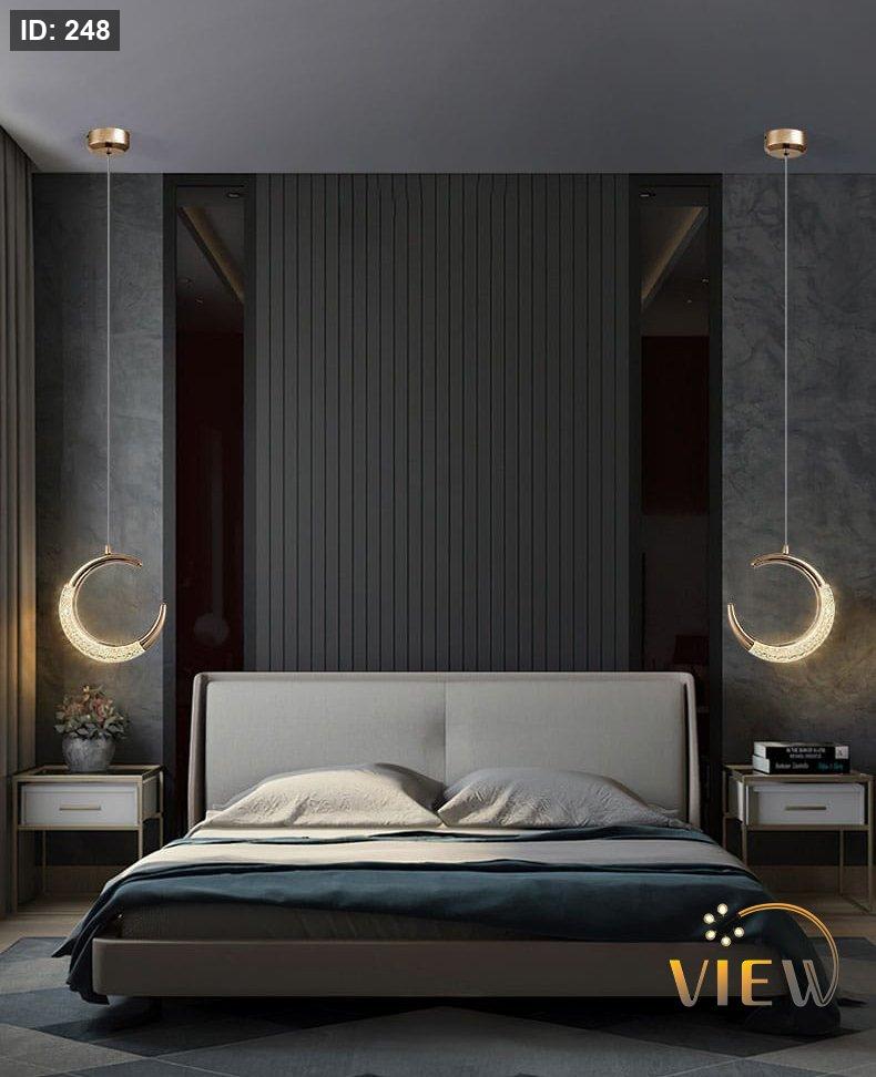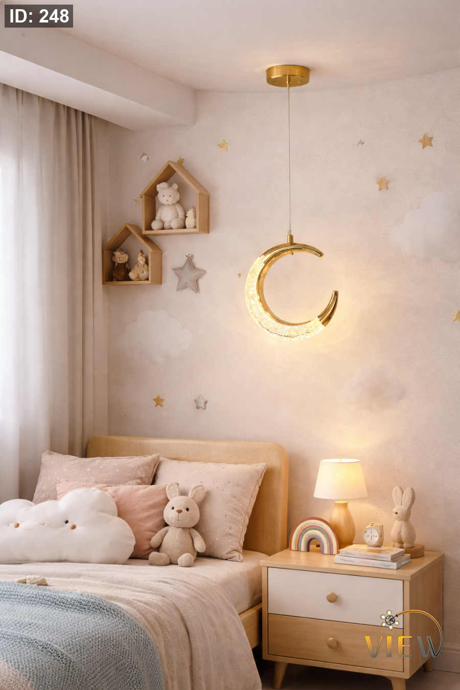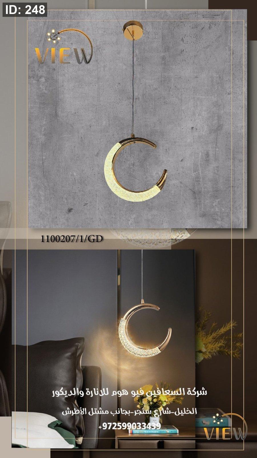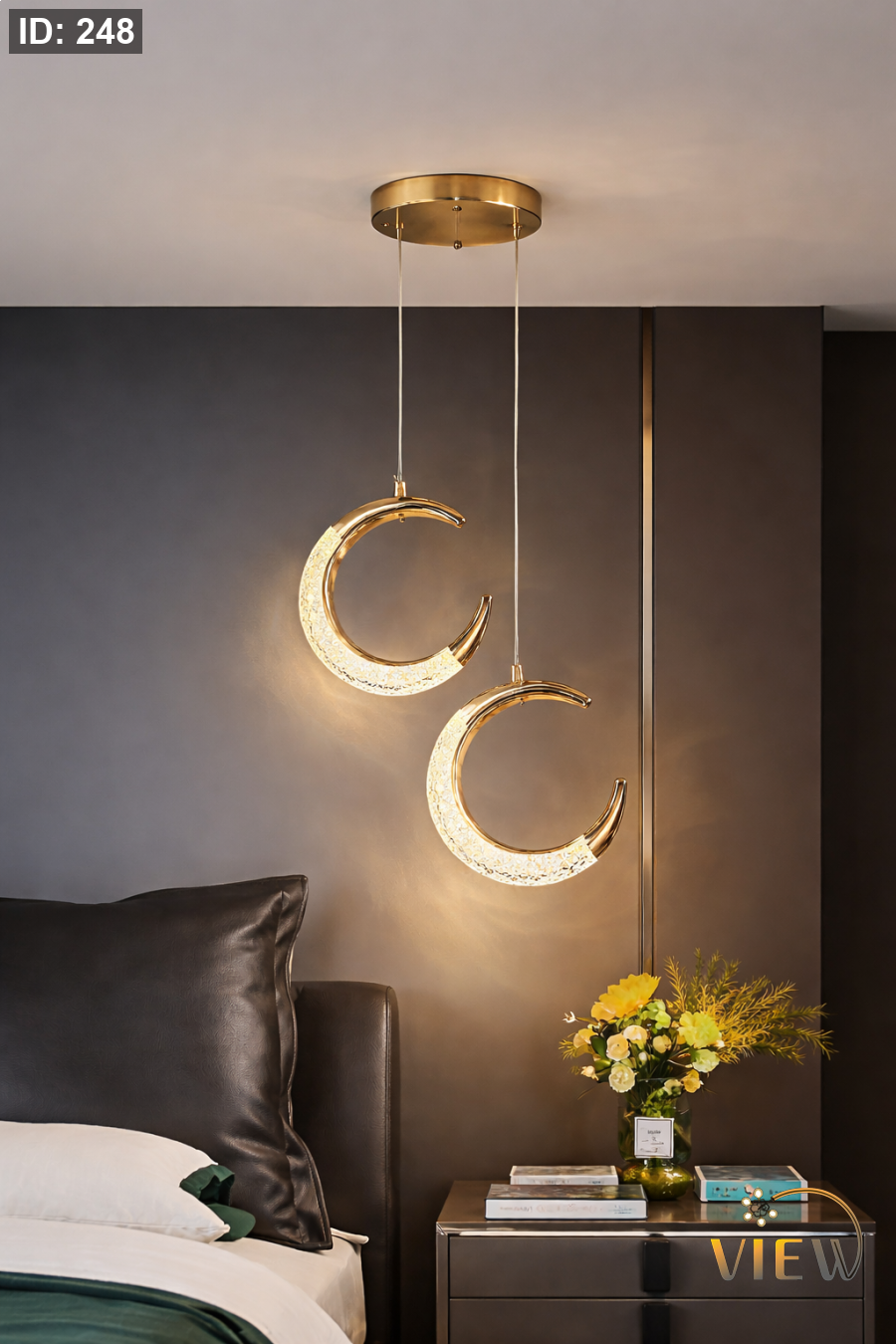 معلقة بتصميم هلال ذهبي فاخر، مغطاة بطبقة كريستالية تمنح لمعاناً ناعماً وإضاءة دافئة مريحة. تتميز بشخصية مودرن جذابة، تجعلها قطعة ديكور تضيف فخامة وأناقة دون مبالغة. تصميمها المنحني يجعلها مناسبة للأجواء الهادئة والراقية في المنزل.