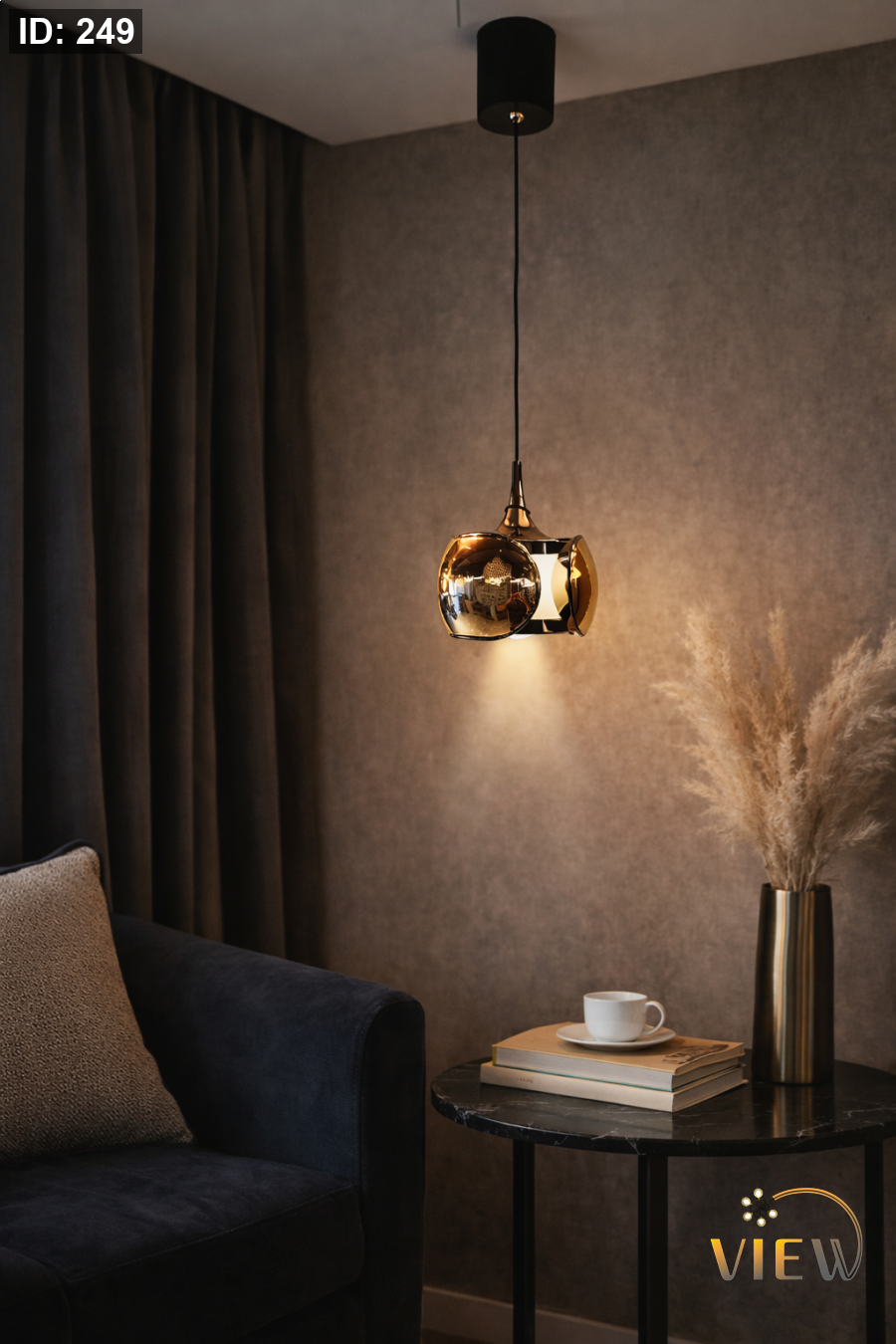 معلقة فاخرة بتصميم كروي عصري، تجمع بين لمعة الذهب وعمق الظلال بطريقة تعكس رُقيّ الذوق الحديث.