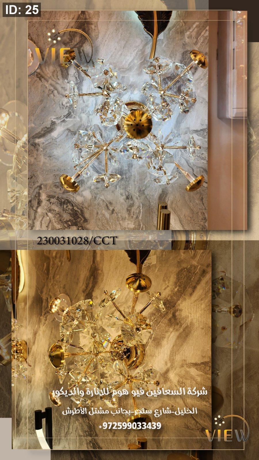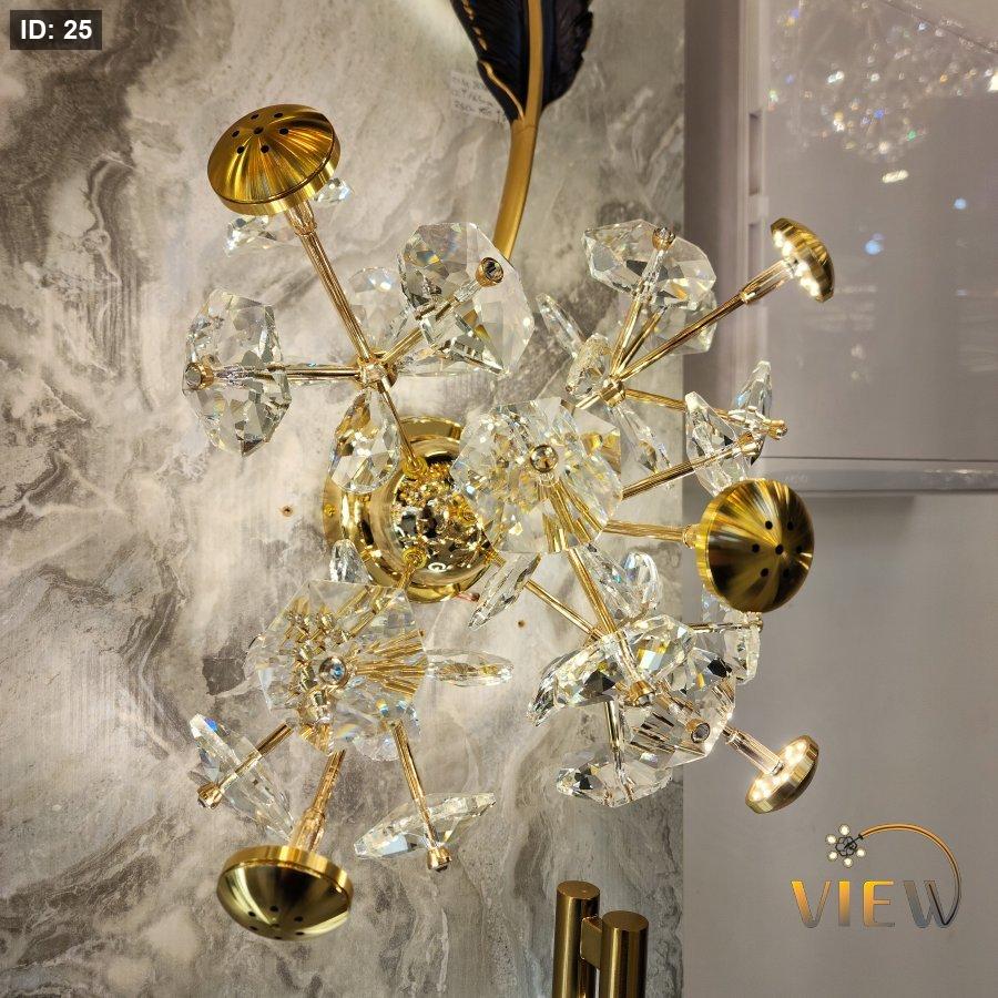 إنارة جدارية بتصميم ذهبي فاخر تتزين بكريستالات هندسية متعددة الأوجه، تعكس الضوء بانسيابية وتمنح المكان إضاءة ناعمة ولمسة فخامة عصرية. مثالية لإبراز جمال الجدران في غرف النوم والصالونات الحديثة.