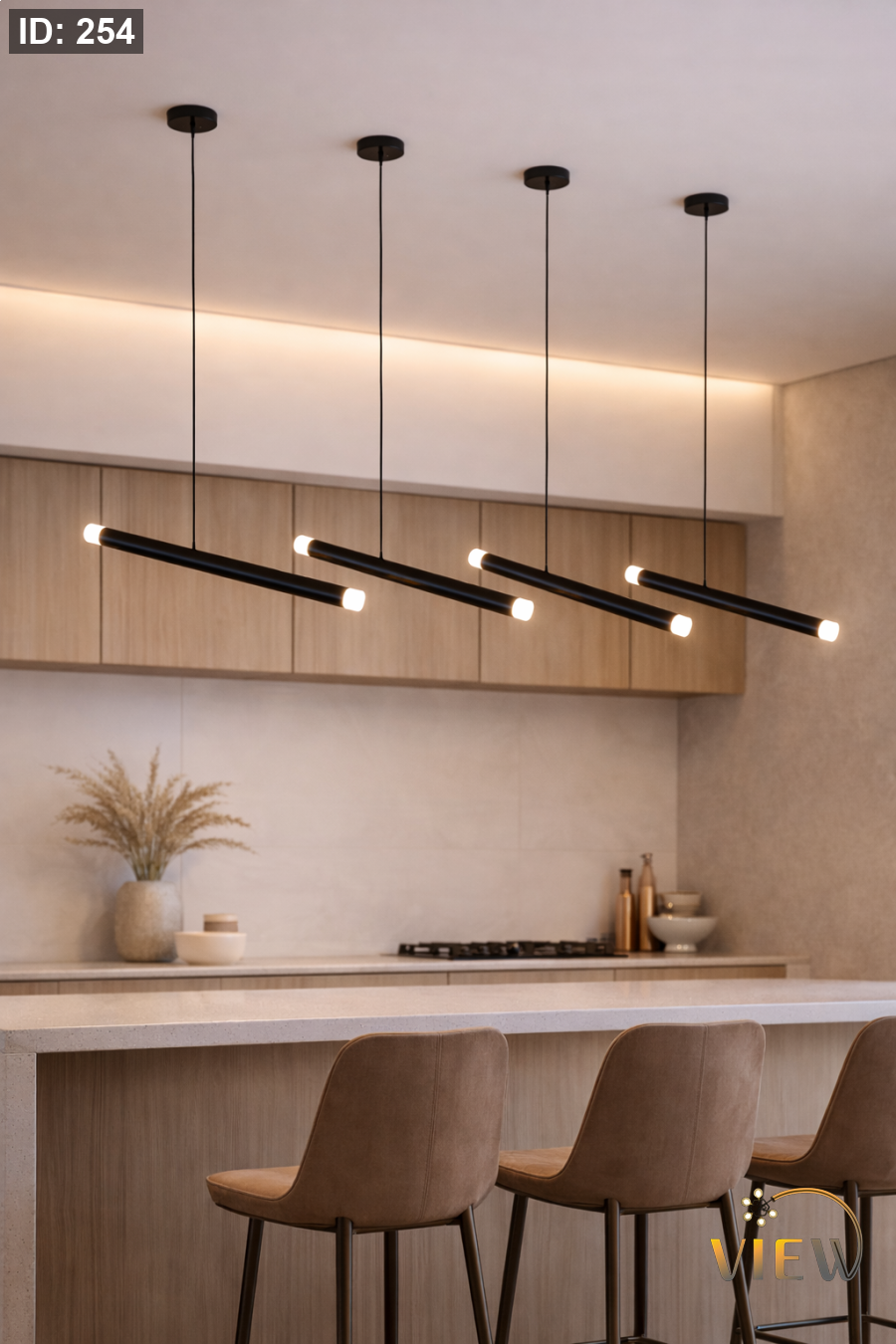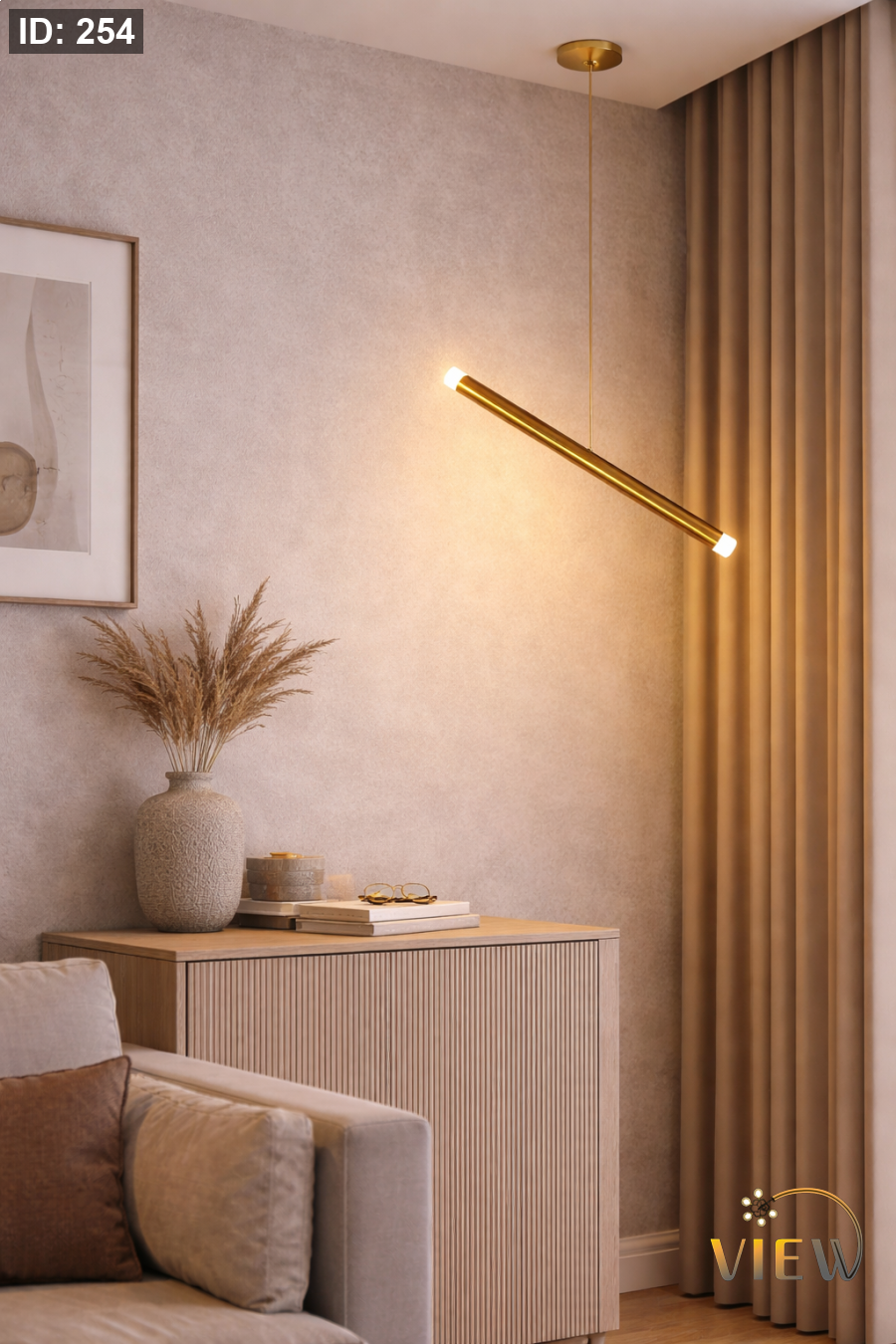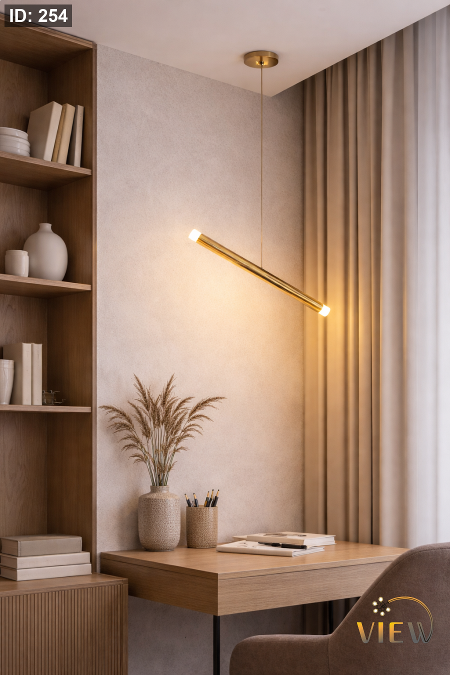 معلقة مودرن بتصميم خطّي نحيف باللون الذهبي اللامع مع نهايات مضيئة ناعمة، تتدلّى بشكل انسيابي وأنيق يناسب ديكورات المنازل الراقية والمكاتب الحديثة.