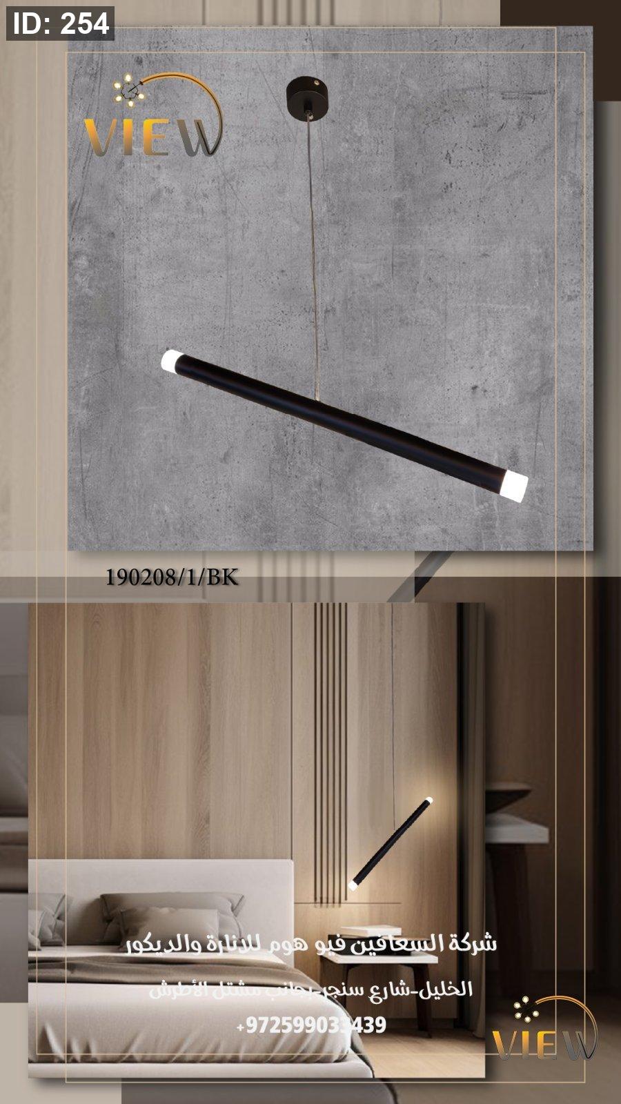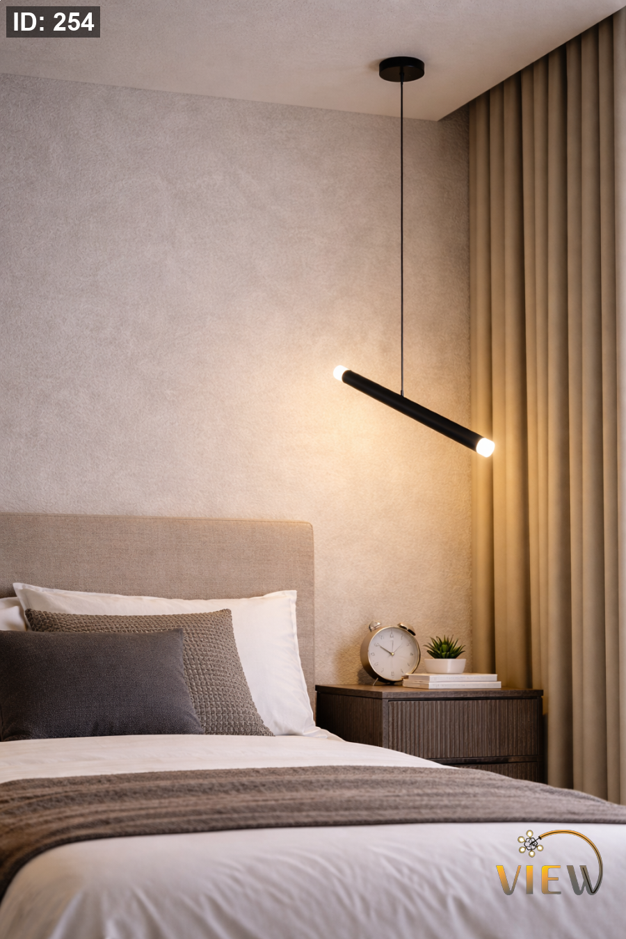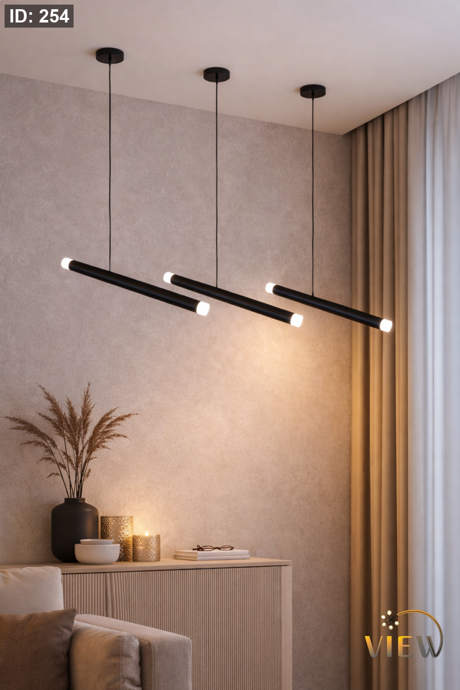 معلقة مودرن بتصميم خطّي نحيف باللون الذهبي اللامع مع نهايات مضيئة ناعمة، تتدلّى بشكل انسيابي وأنيق يناسب ديكورات المنازل الراقية والمكاتب الحديثة.