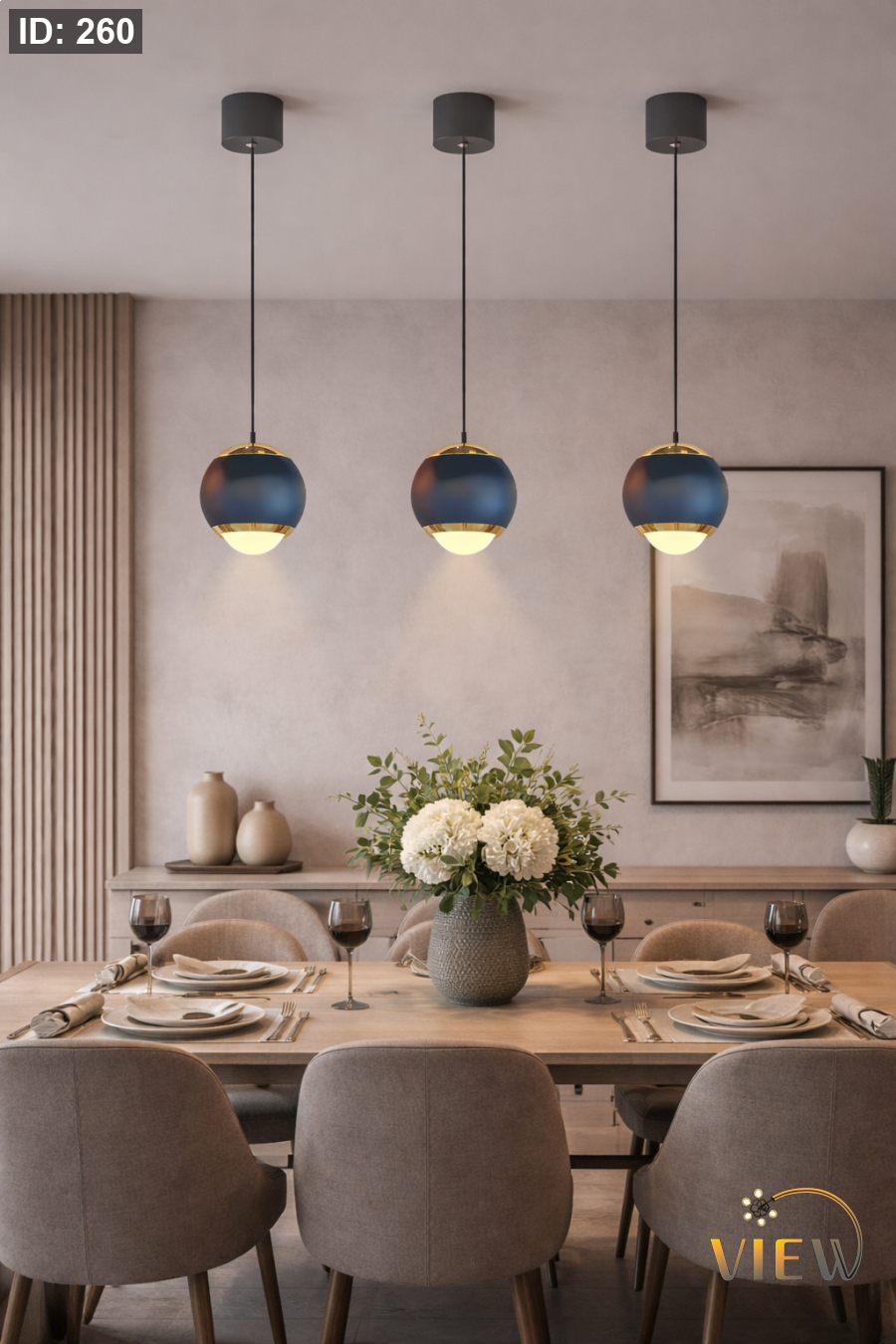 معلقة مودرن بتصميم كروي يجمع بين الأزرق الهادئ والذهبي الفاخر، تمنح المكان إضاءة ناعمة ومريحة مع لمسة ديكور راقية. شكلها العصري يجعلها مناسبة للمساحات الأنيقة التي تحتاج لإضاءة تتألق بدون مبالغة، وتبرز جمال الأثاث حولها.