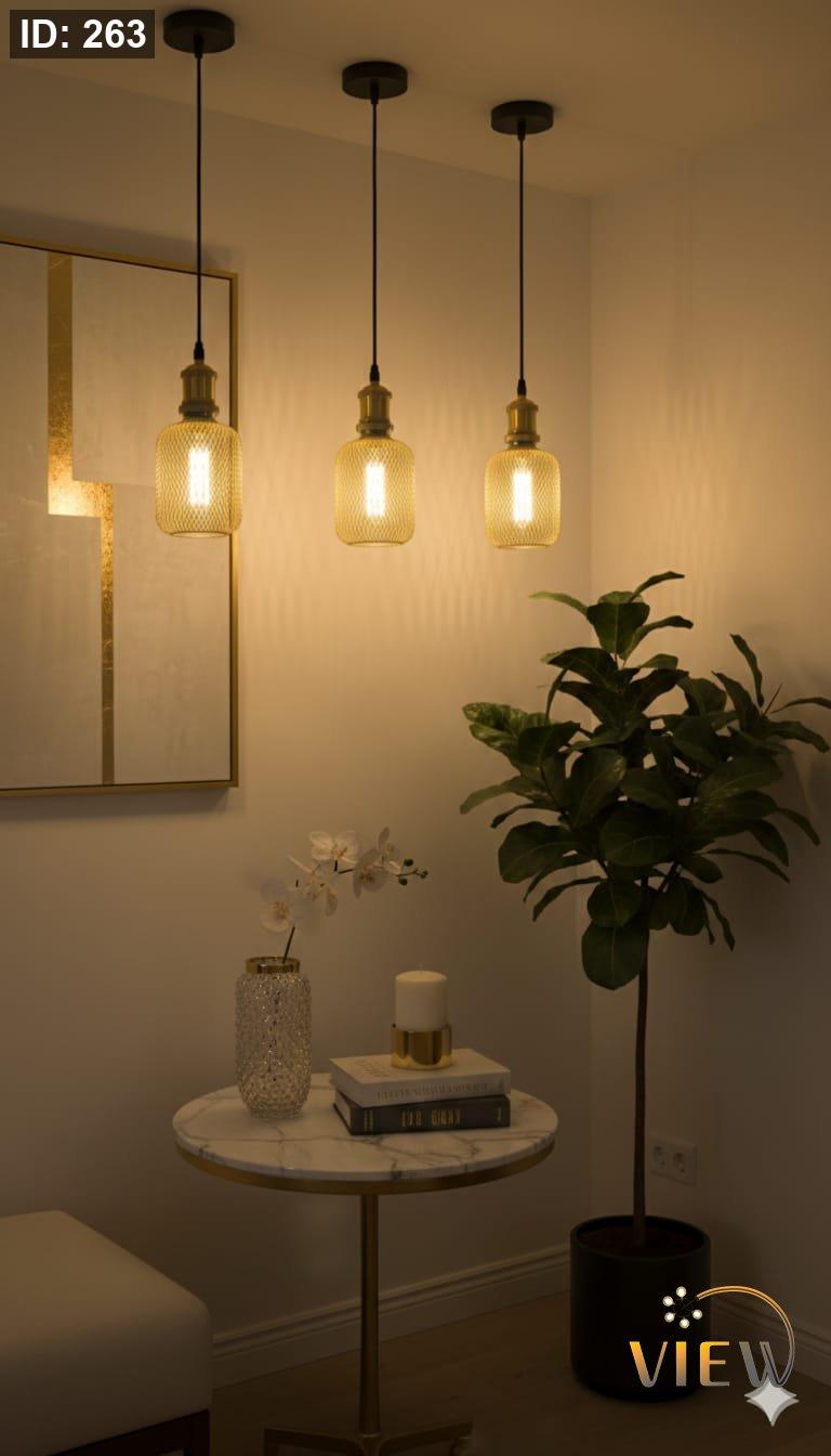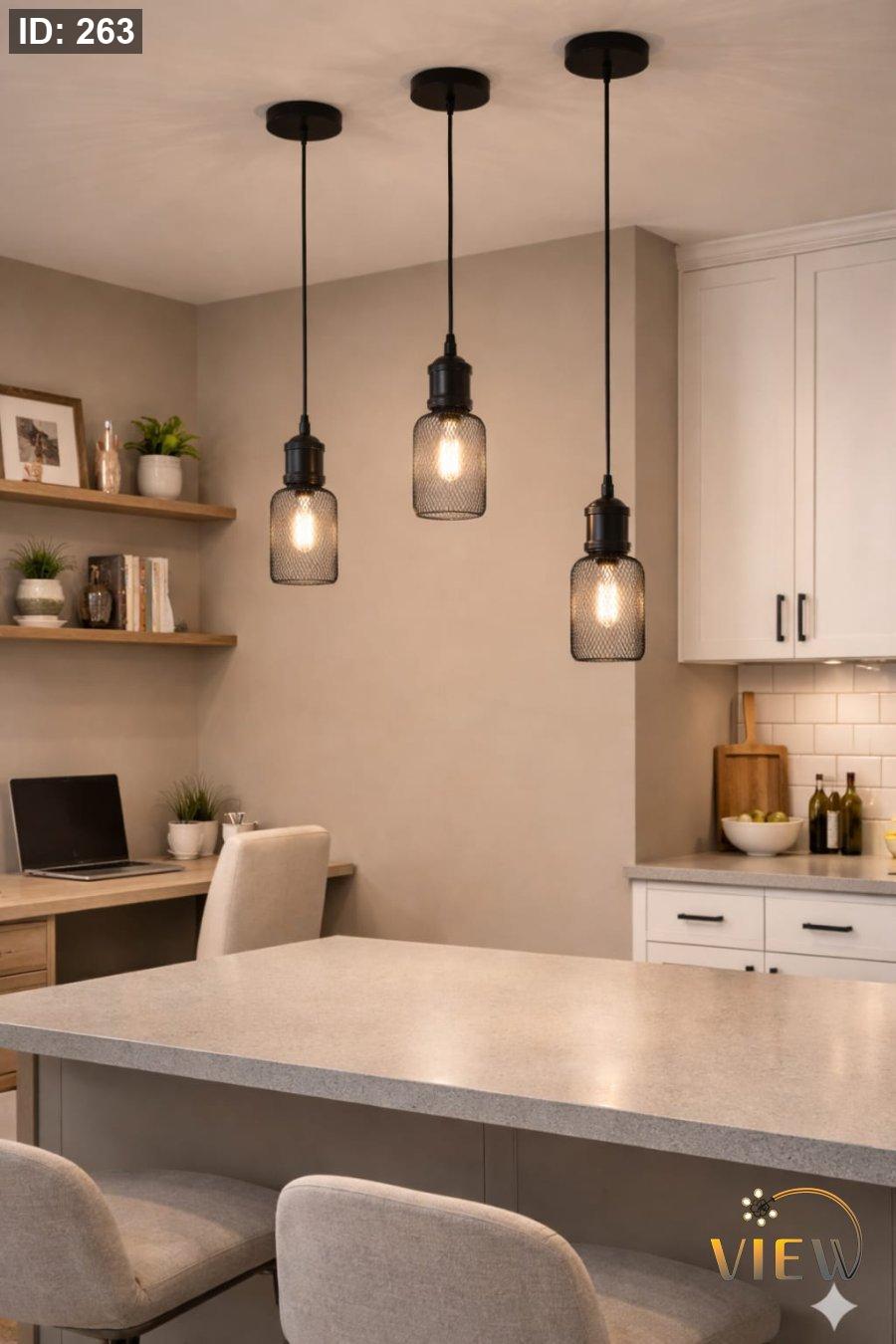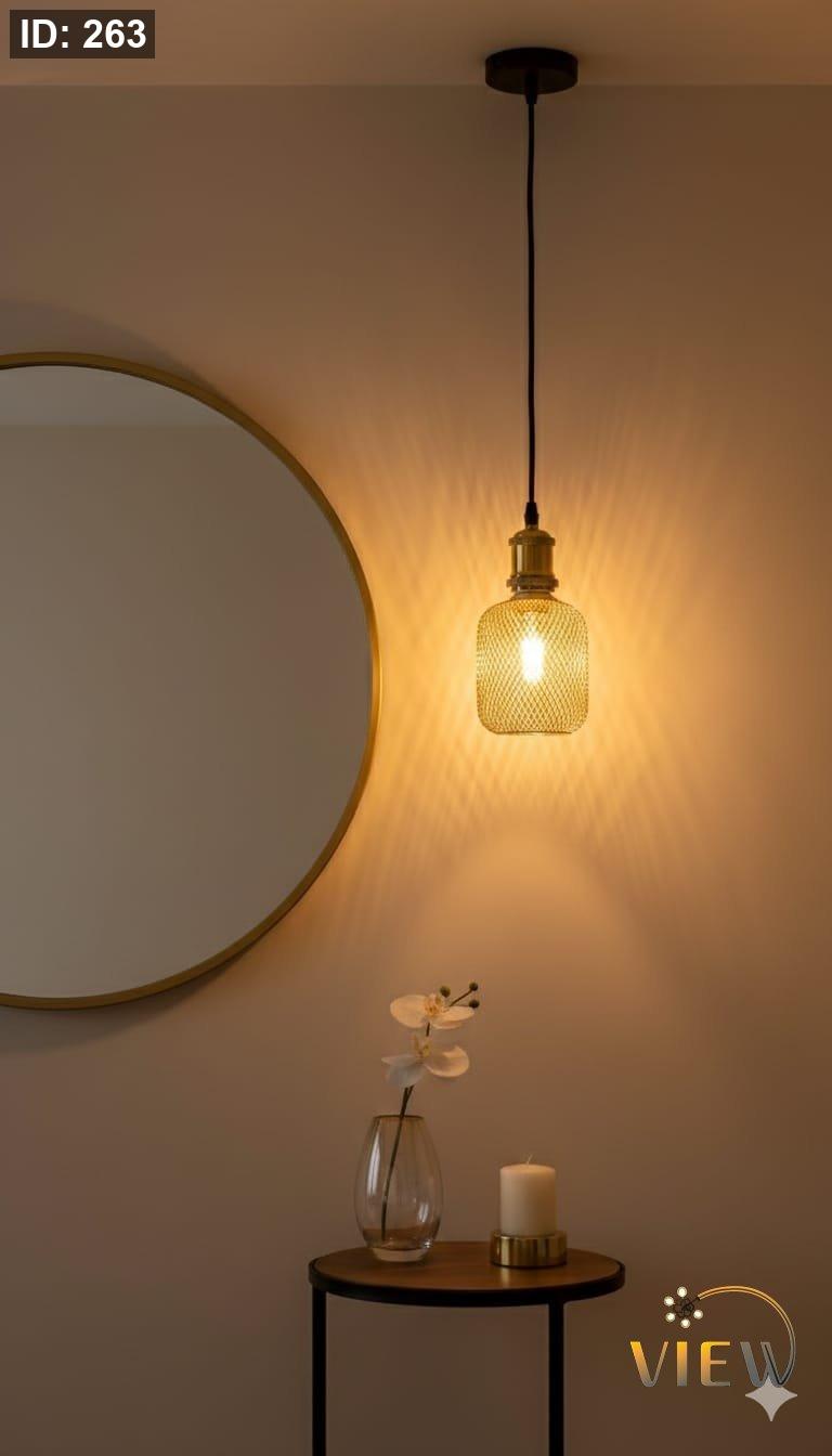 معلقة بتصميم صناعي–مودرن، تعتمد على غطاء معدني شبكي يسمح بانتشار الضوء بطريقة أنيقة وهادئة.