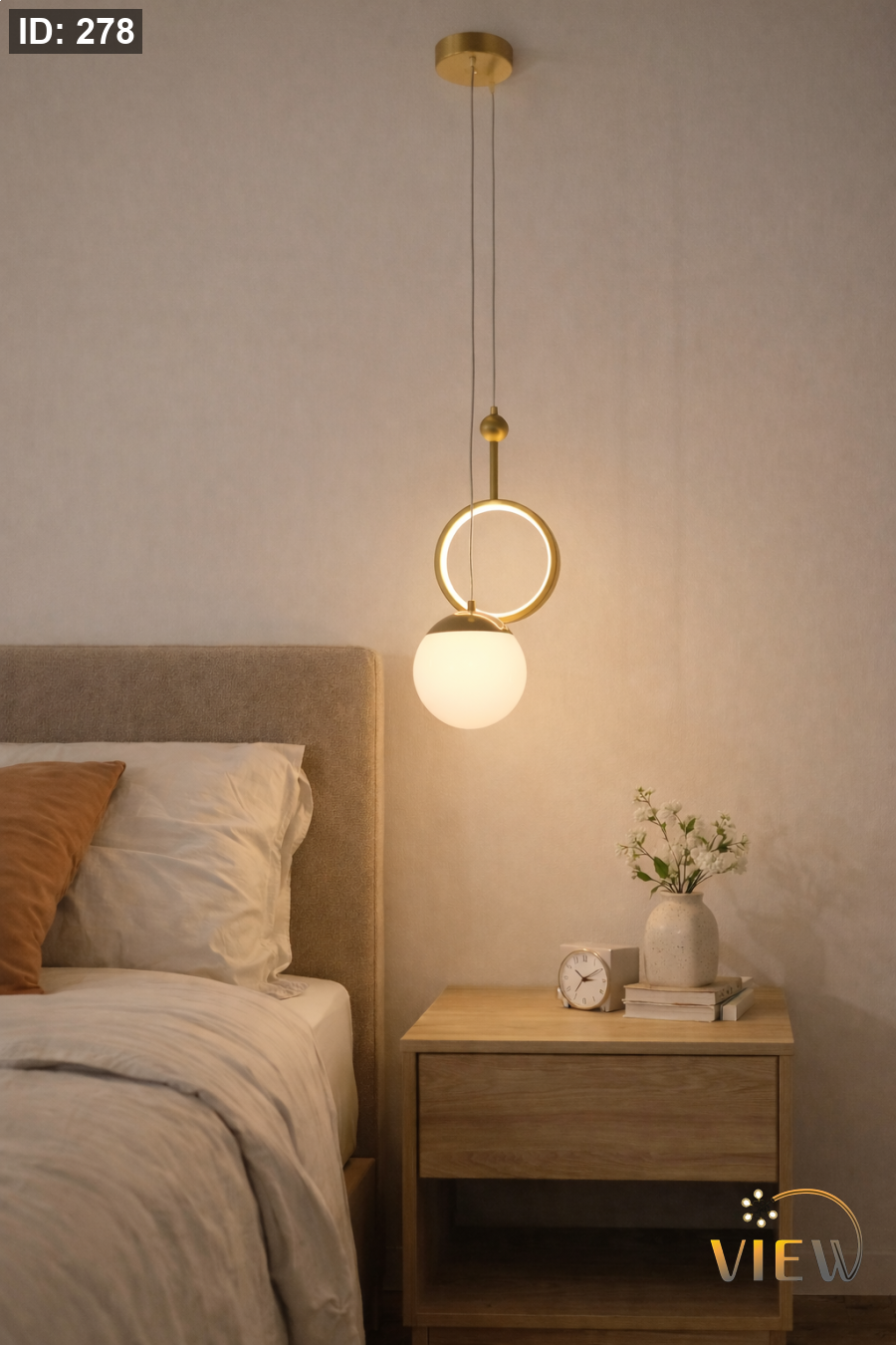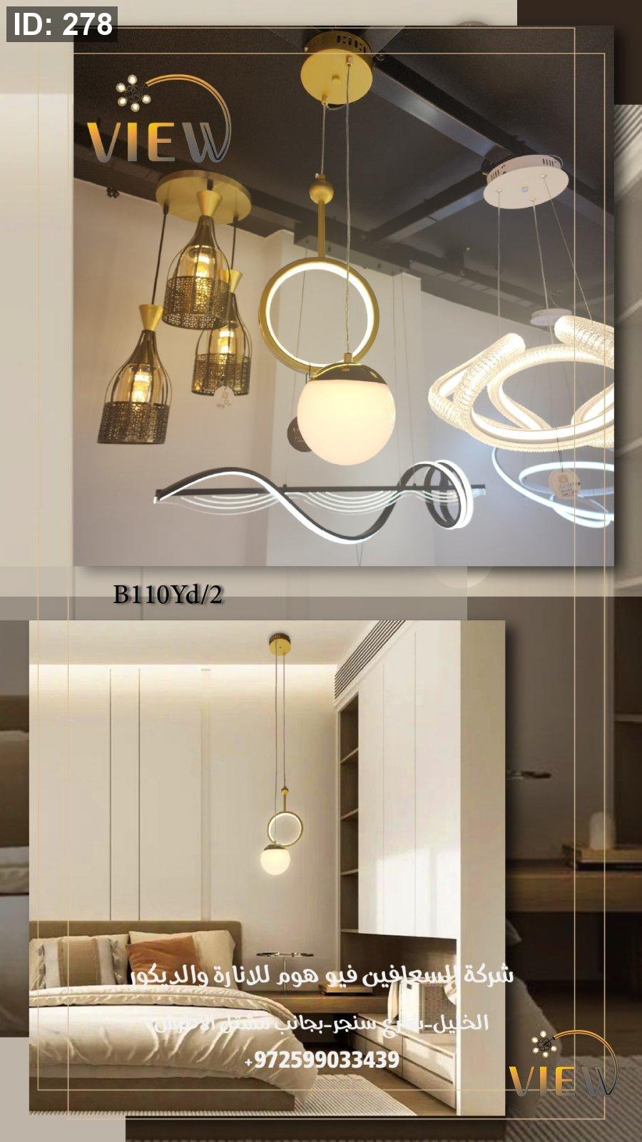 معلّقة مودرن تجمع بين حلقة ذهبية مضيئة وكرة ضوئية بيضاء تشبه القمر، بتصميم انسيابي يمنح المكان شعوراً بالدفء والراحة.