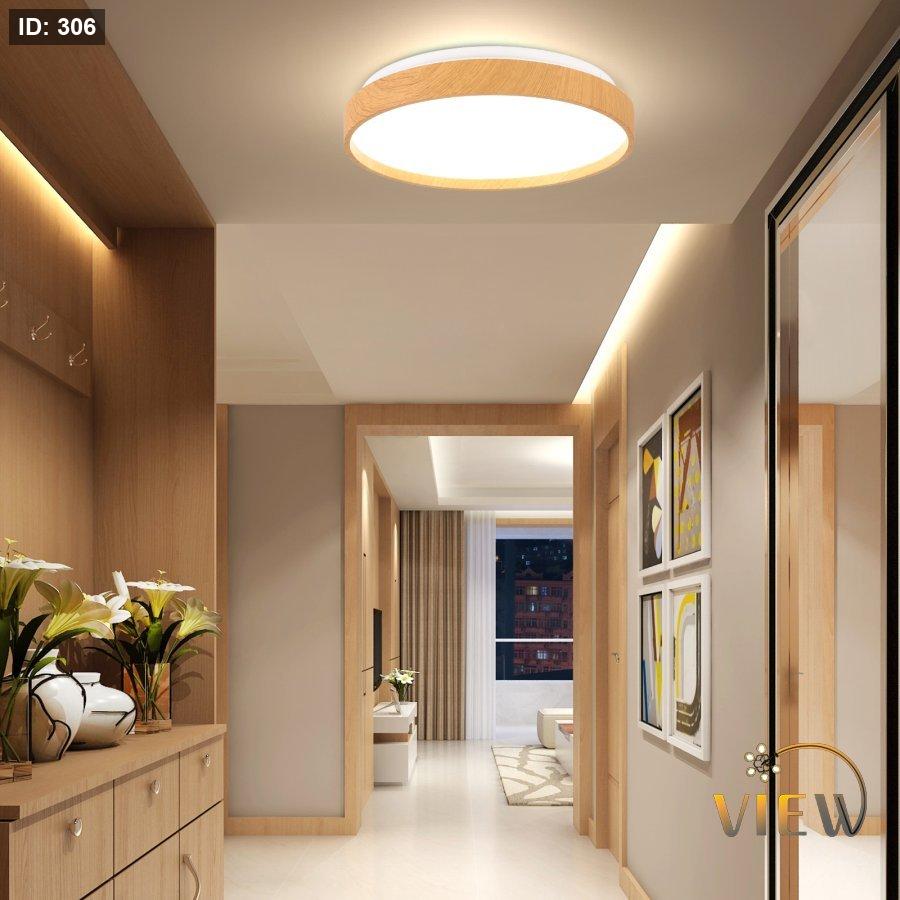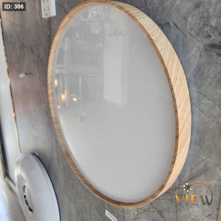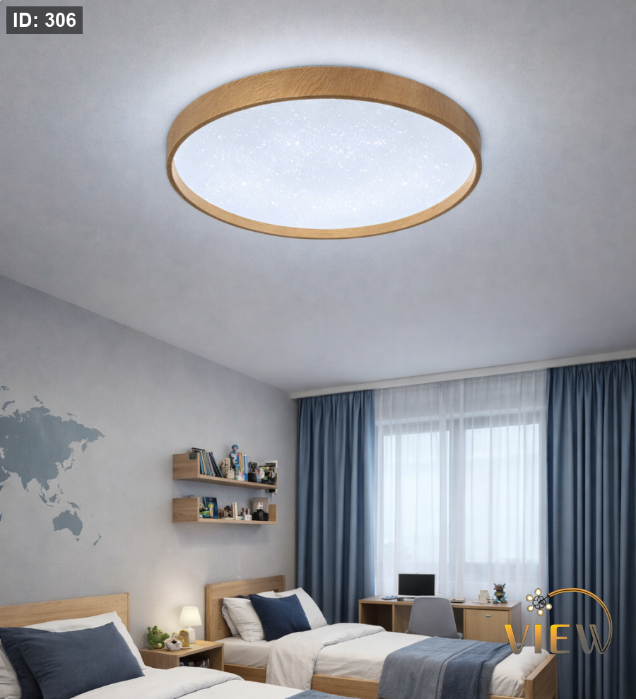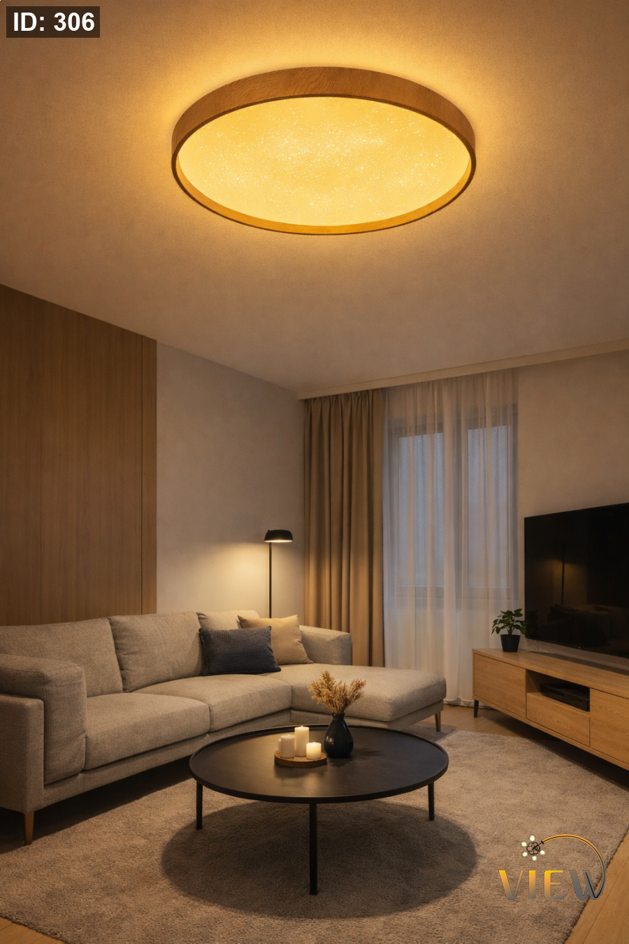 جلوب سقفي مودرن بإطار خشبي أنيق يمنح المكان لمسة دافئة وطبيعية، مع سطح إضاءة ناعم بتأثير نجمي خفيف يوزّع الضوء بشكل متوازن.