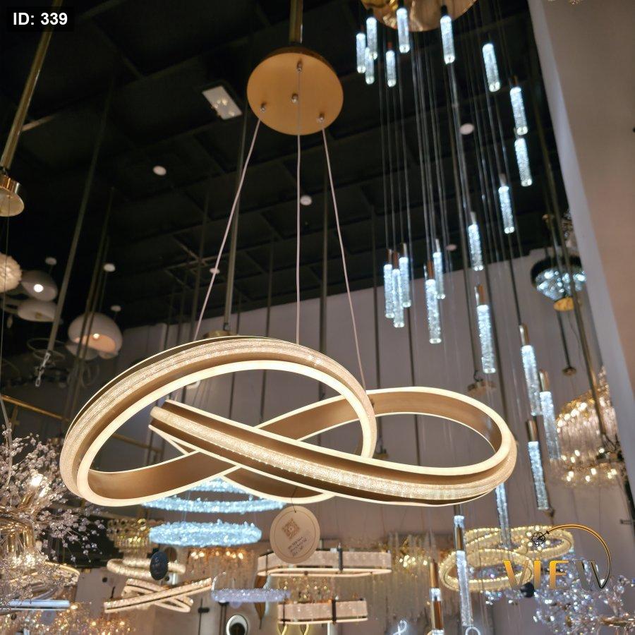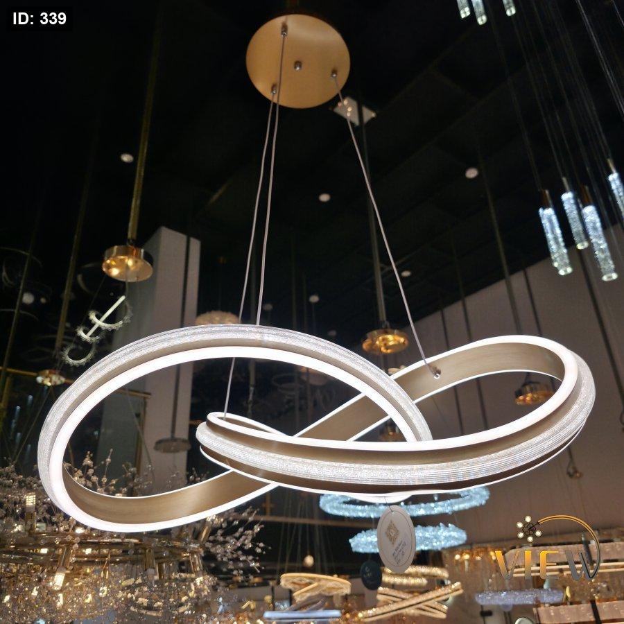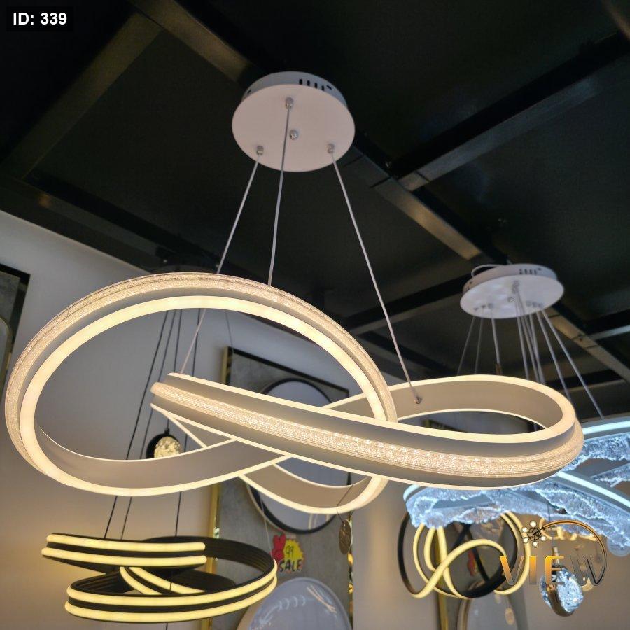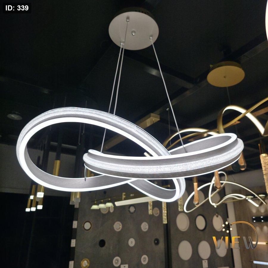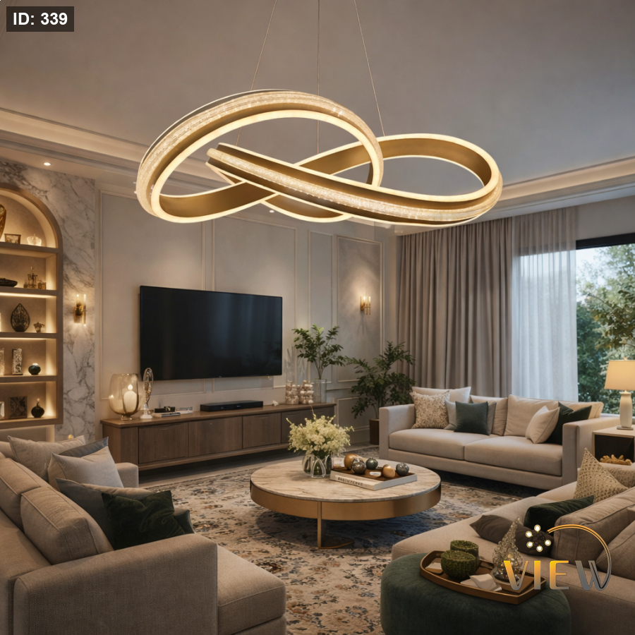 ثريا مودرن بتصميم مستوحى من رمز اللانهاية، تتكوّن من حلقات متداخلة بإطار معدني أنيق مع إضاءة LED محيطية ناعمة.