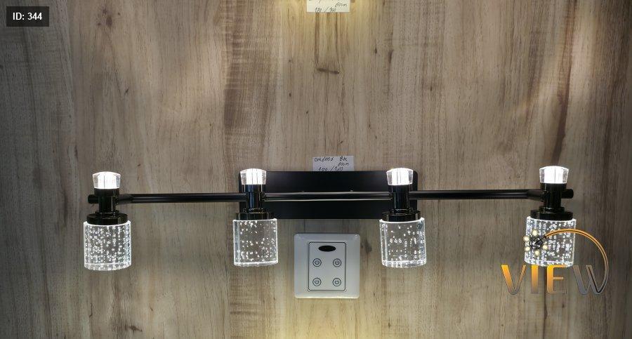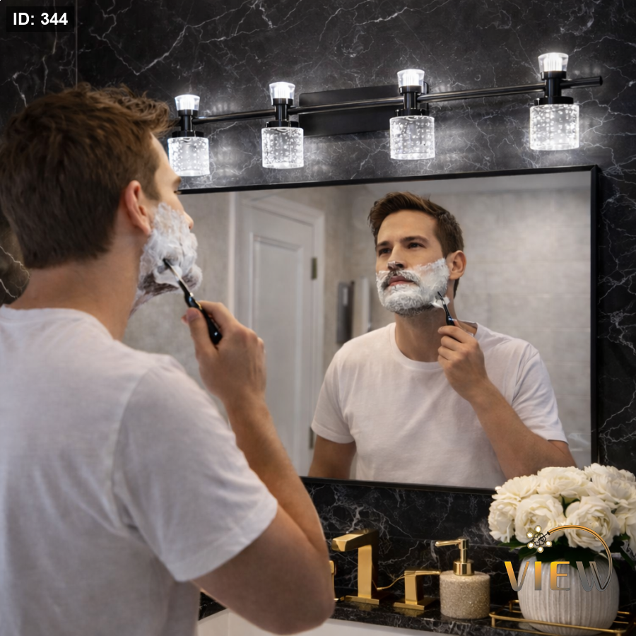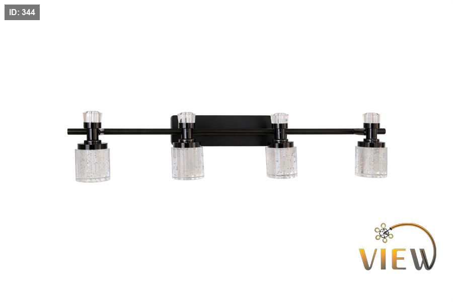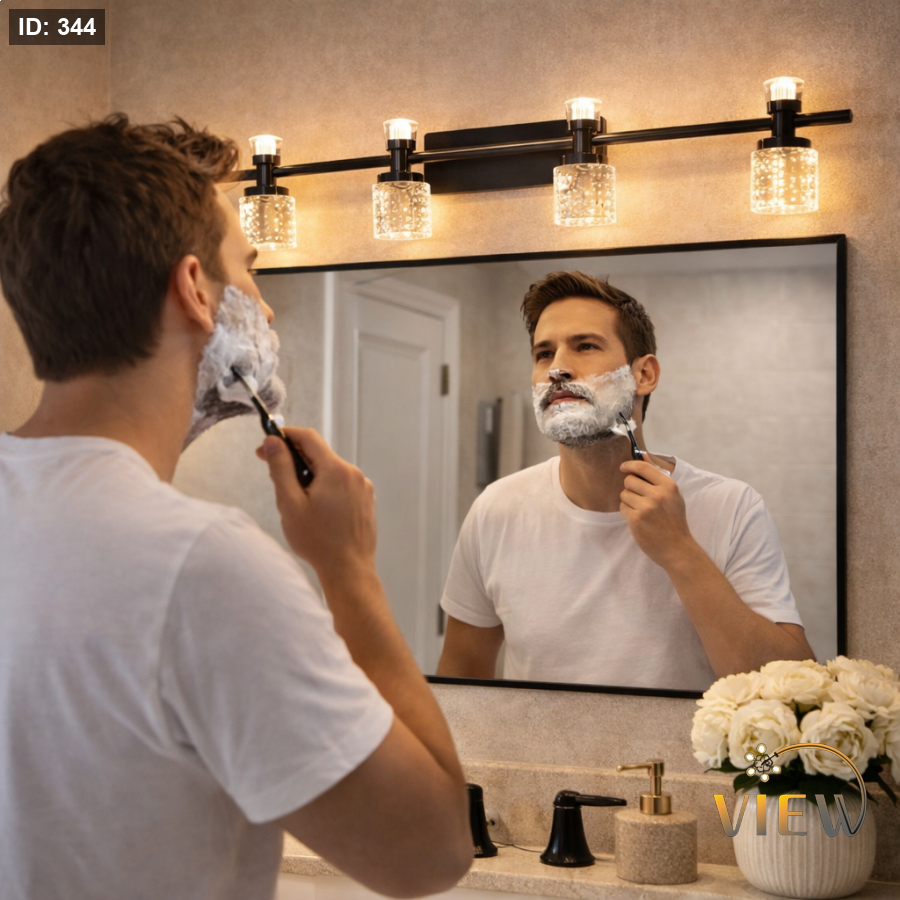 إنارة مغسلة مودرن بتصميم خطّي مستقيم يحمل أربع رؤوس أسطوانية شفافة بتفاصيل فقاعات داخلية تعكس الضوء بشكل ناعم وجذاب.