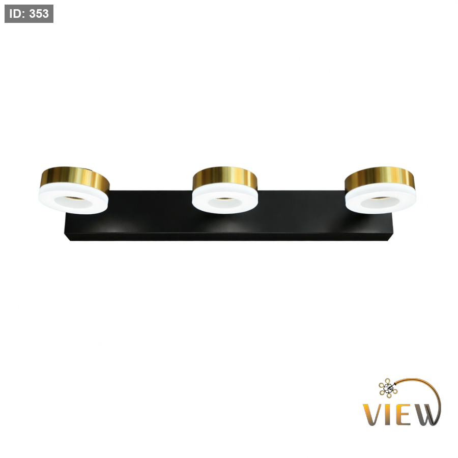 إنارة مغسلة بتصميم مينيمال عصري يجمع بين قاعدة سوداء مطفية وثلاث وحدات دائرية بلمسة ذهبية أنيقة تمنح المكان حضوراً راقياً دون مبالغة.
