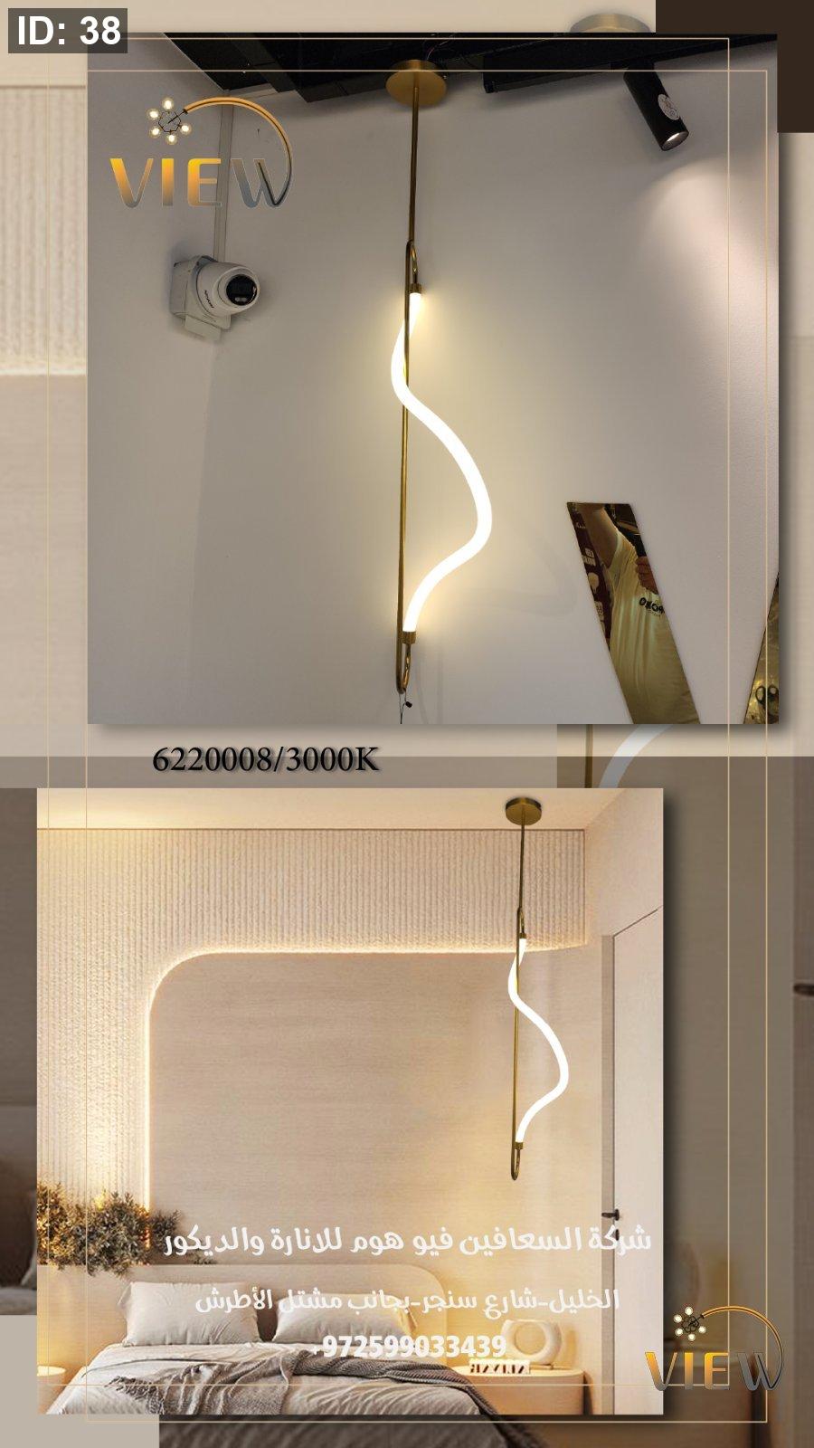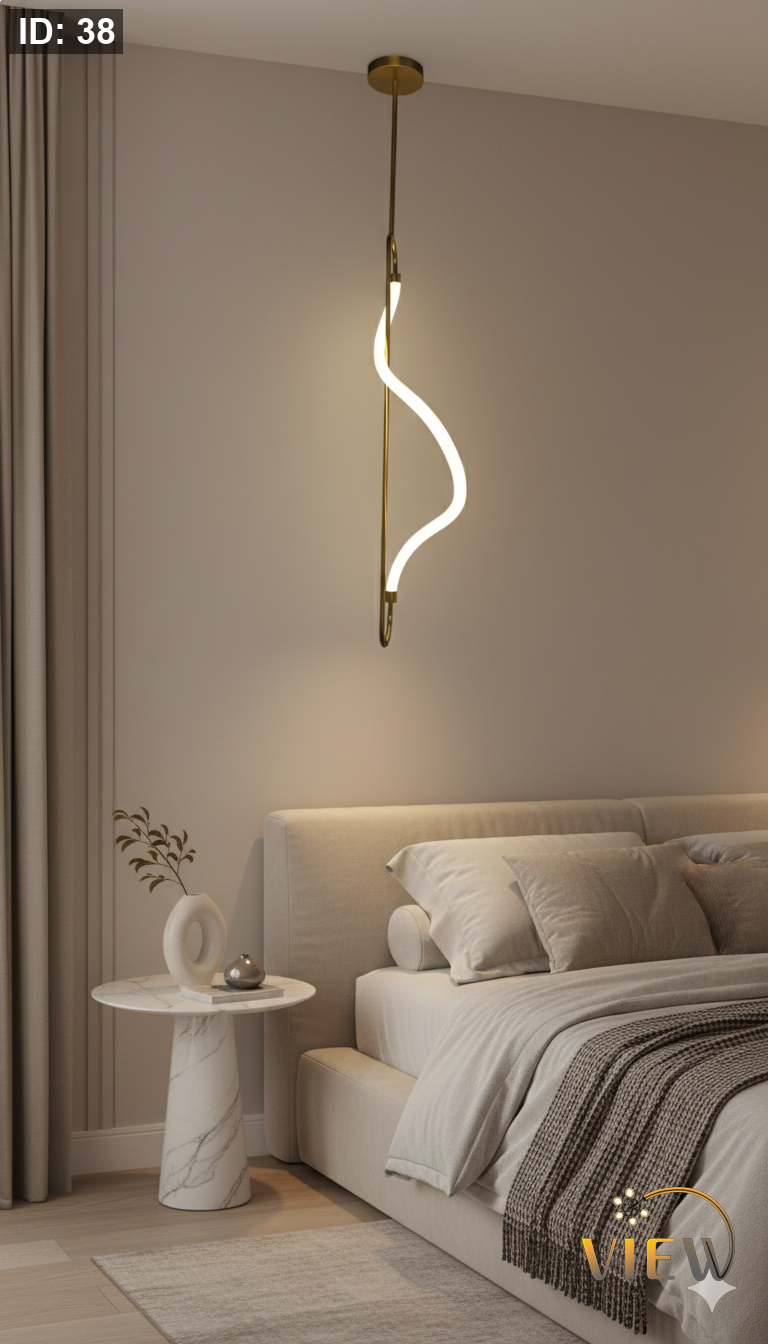 إنارة معلّقة بتصميم متموّج عصري، تجمع بين الخط النحيف والضوء الدافئ لتمنح المكان إحساسًا بالهدوء والرقي. مصنوعة من هيكل معدني بلون ذهبي مع إضاءة LED ناعمة، لتكون قطعة فنية تضيف لمسة أنيقة دون مبالغة، وتنسجم بسهولة مع الديكورات المودرن والهادئة.