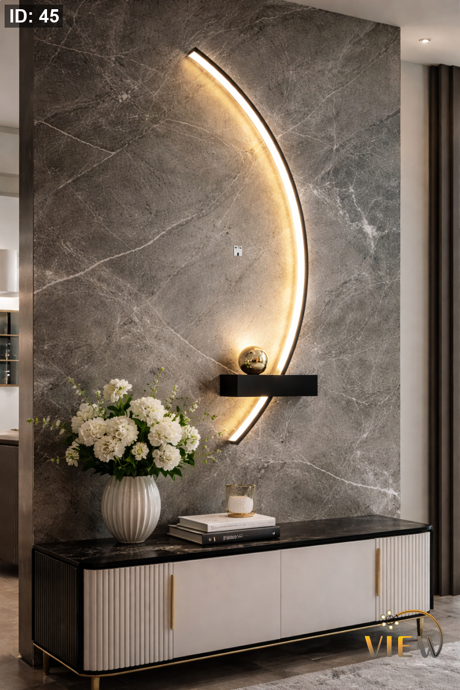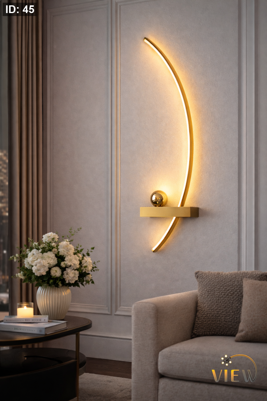 إنارة جدارية بتصميم قوسي أنيق، تجمع بين الخط المنحني الناعم واللون الذهبي الدافئ لتمنح الجدار حضورًا فنيًا راقيًا. تعتمد على إضاءة LED ناعمة تبرز الانحناءة وتضيف عمقًا بصريًا هادئًا دون إبهار، ما يجعلها قطعة ديكور مثالية للمساحات المودرن الكلاسيك والعصرية الراقية.