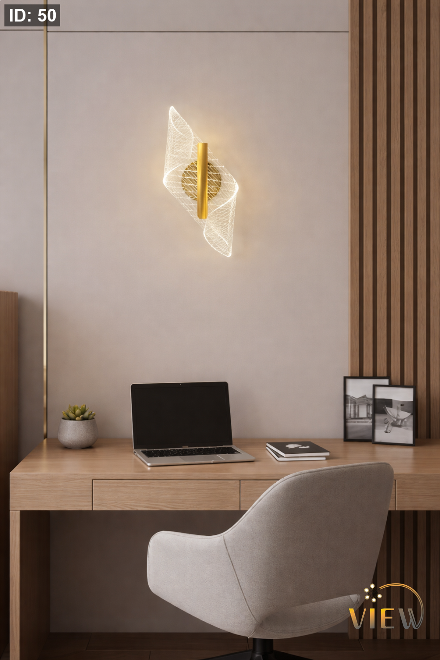إنارة جدارية فنية بتصميم شبكي خفيف، تتداخل فيه الخطوط المضيئة بانسيابية لتخلق تأثيرًا بصريًا ناعمًا وأنيقًا. يتوسطها عنصر ذهبي يضيف دفئًا وتوازنًا، مع إضاءة LED هادئة تمنح المكان إحساسًا بالإبداع والرقي دون إبهار.