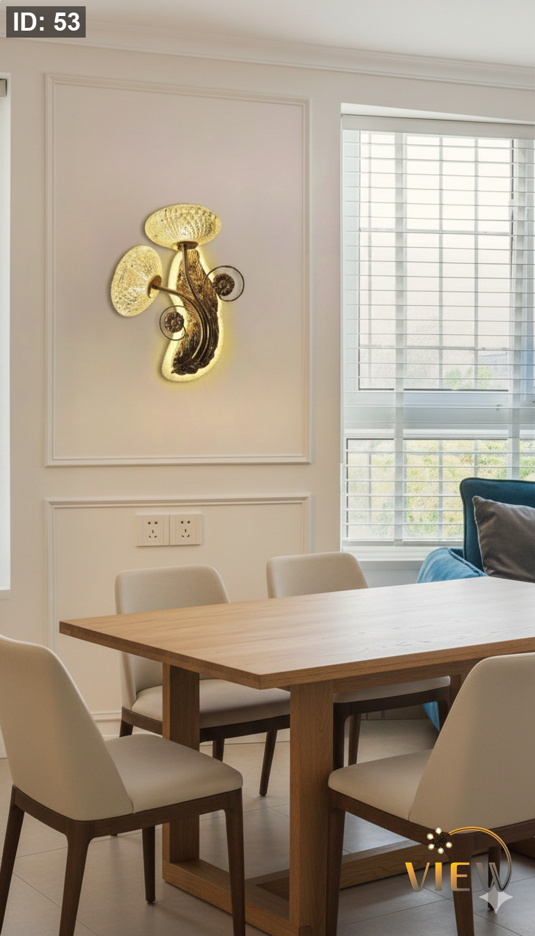إنارة جدارية بتصميم فني راقٍ، تعتمد على هيكل معدني بلون ذهبي مع عناصر بديل الزجاج الشفافة تعكس الضوء بنعومة وتوزعه بشكل متوازن على الجدار. يمنح التصميم حضوراً أنيقاً دون مبالغة، ويُعد خياراً مثالياً لإضاءة المساحات التي تحتاج إلى لمسة فخامة هادئة. مزودة بإضاءة متعددة الألوان CCT لتناسب مختلف الأجواء.