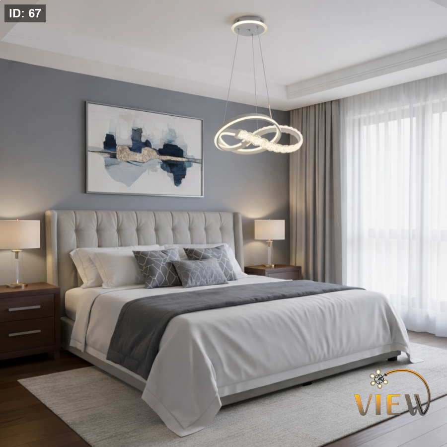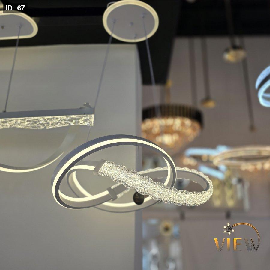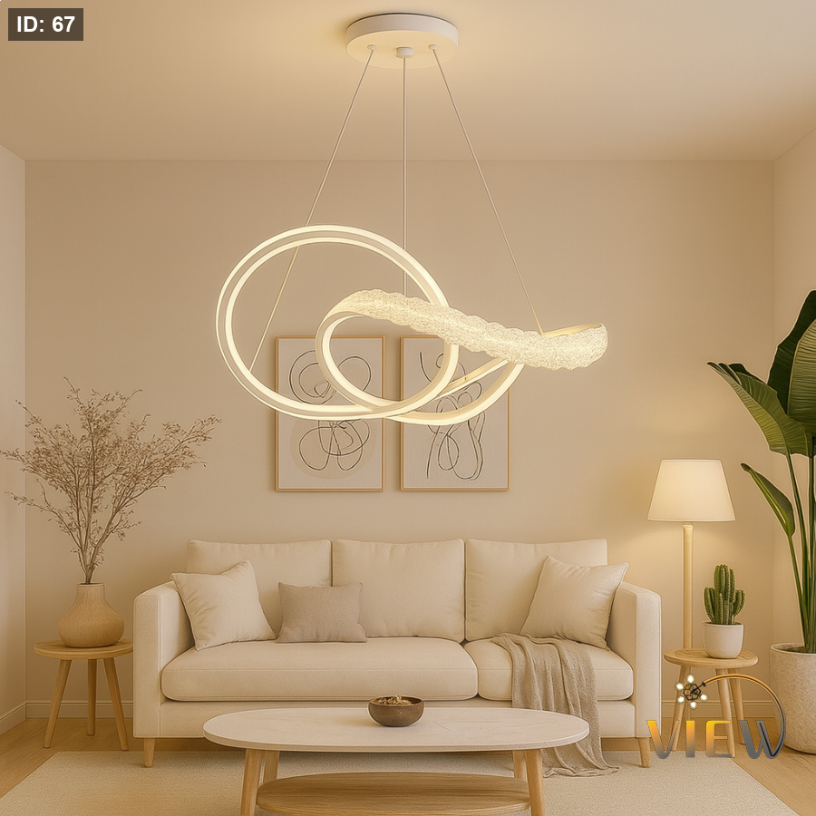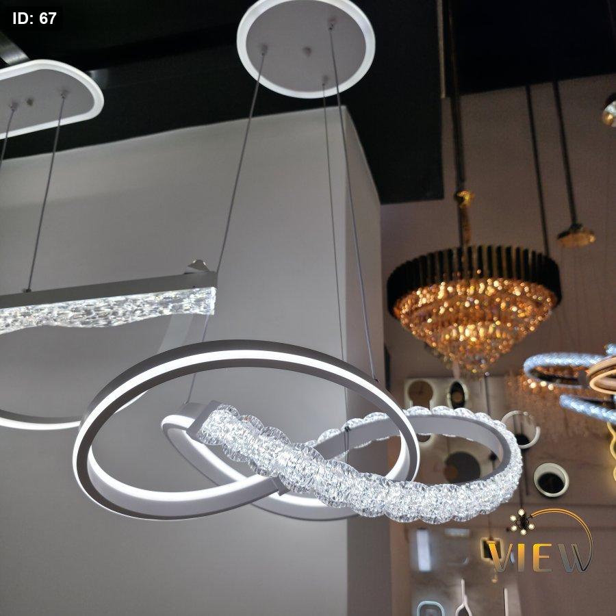 ثريا مودرن أنيقة بتصميم حلقات متداخلة تجمع بين إضاءة LED ناعمة وشكل كريستال شفاف عالي اللمعان، تمنح المكان إحساسًا بالفخامة والرقي دون مبالغة. توزيع الضوء متوازن ومريح للعين، مع لمسة عصرية تبرز جمال السقف وتضيف عمقًا بصريًا للمساحة.