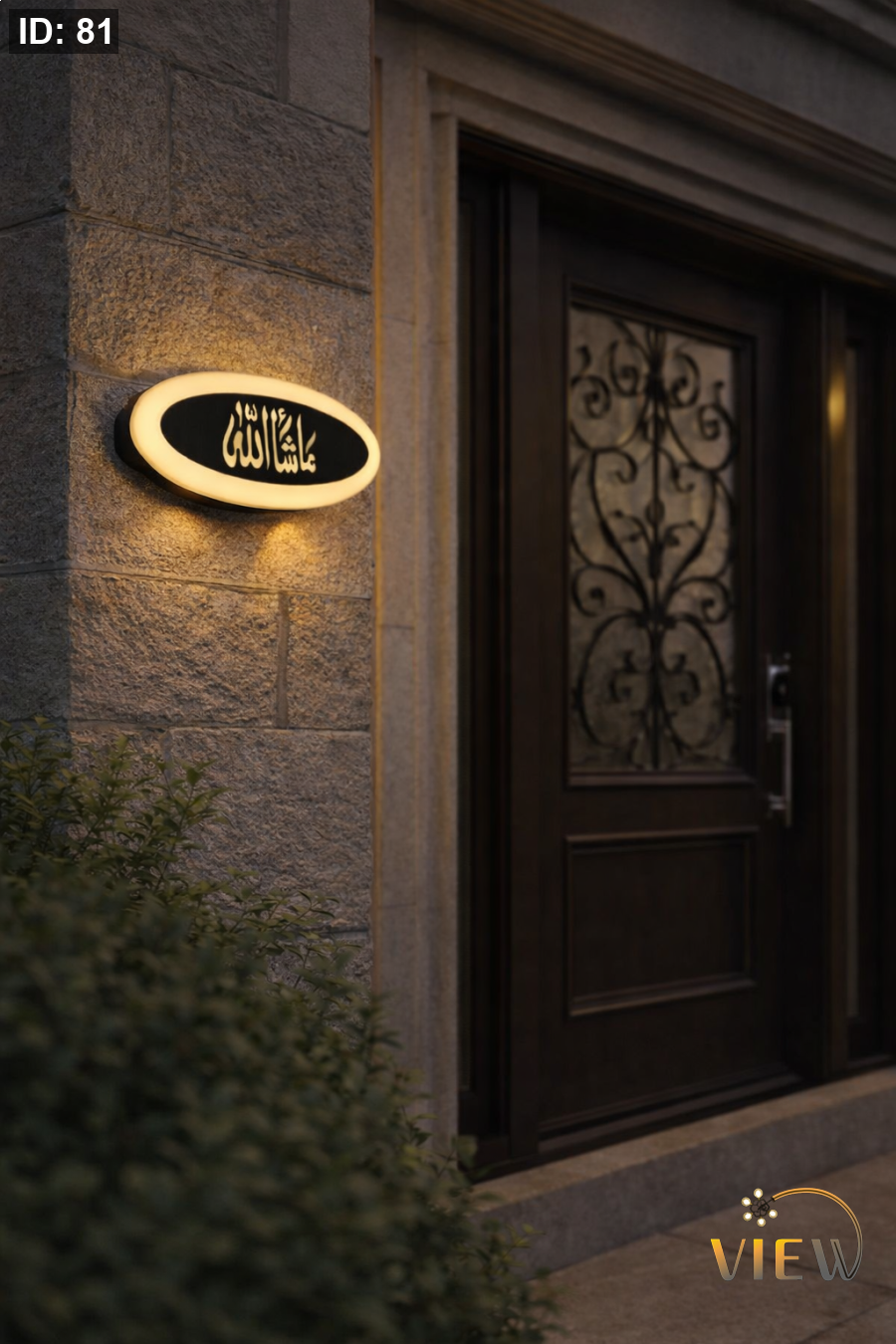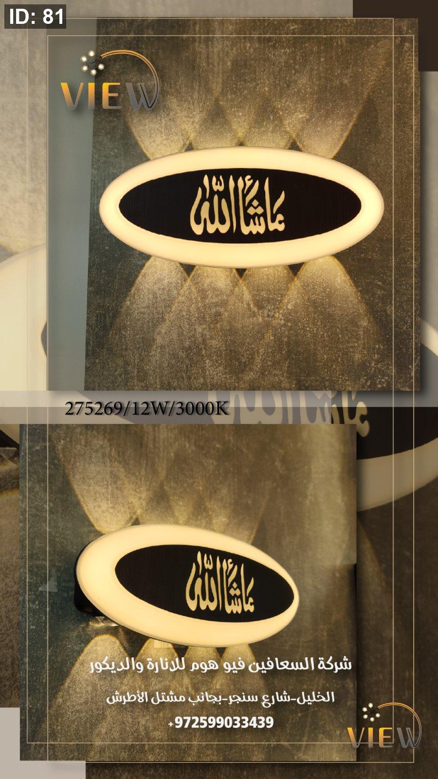 إنارة جدارية بتصميم بيضاوي أنيق تتوسطه عبارة “ما شاء الله” بخط راقٍ، محاطة بإضاءة دافئة ناعمة تعكس أشعة متناغمة على الجدار. تصميمها يمنح المكان إحساسًا بالطمأنينة والفخامة في آنٍ واحد، مع توزيع ضوئي هادئ غير مزعج، مثالي للأجواء الروحانية والديكور العصري الهادئ.