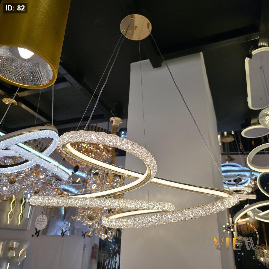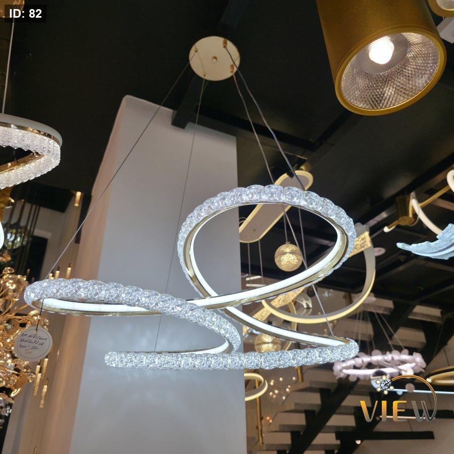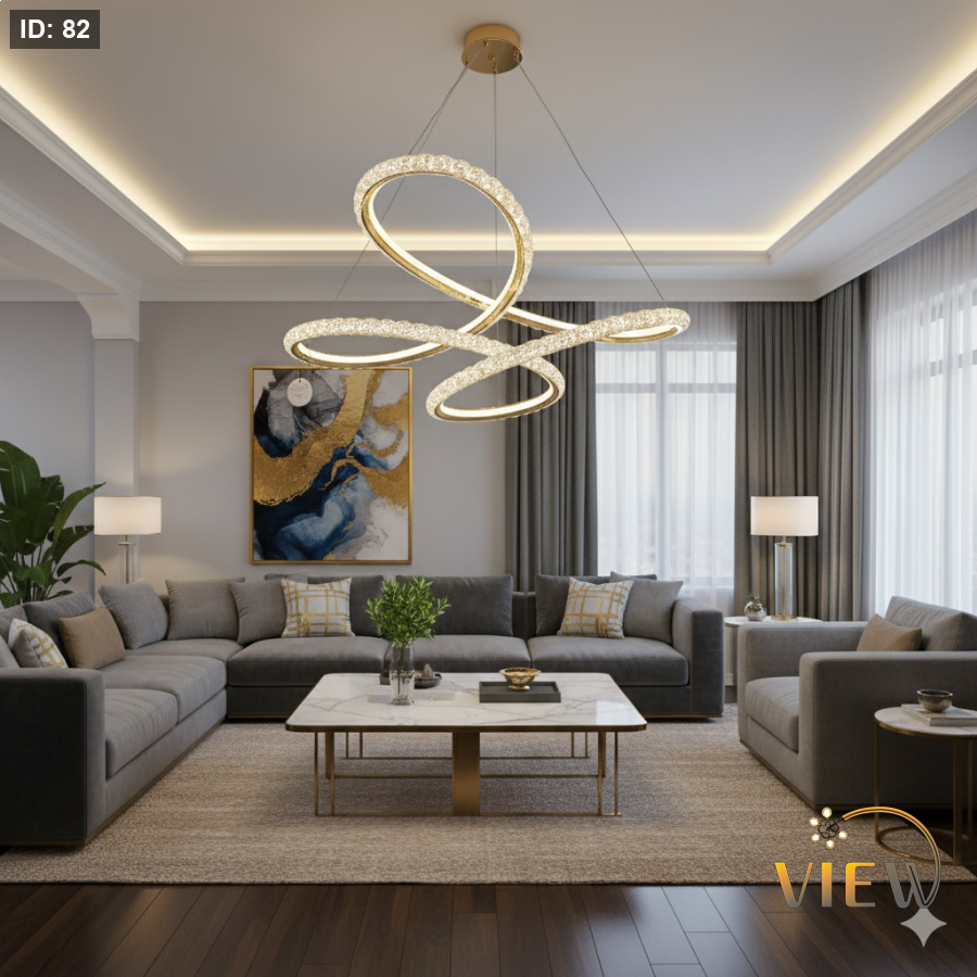 ثريا مودرن بتصميم فني مستوحى من بتلات الزهور، تجمع بين هيكل معدني أنيق بلون ذهبي دافئ وشكل كريستال شفاف عالي اللمعان. مزودة بإضاءة LED ناعمة توزّع الضوء بانسيابية، لتمنح المكان فخامة هادئة ولمسة عصرية راقية تبرز جمال السقف والمساحة.