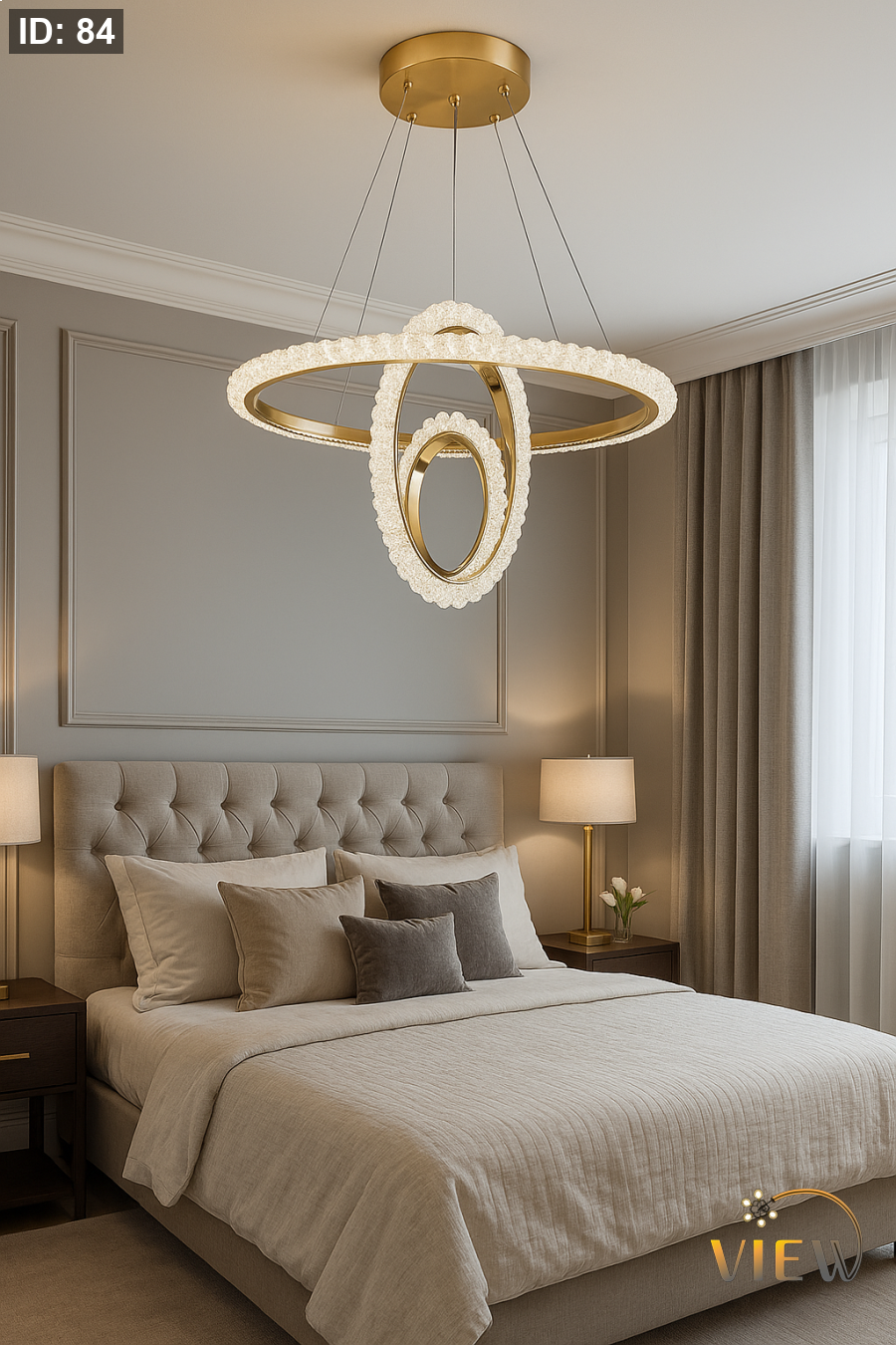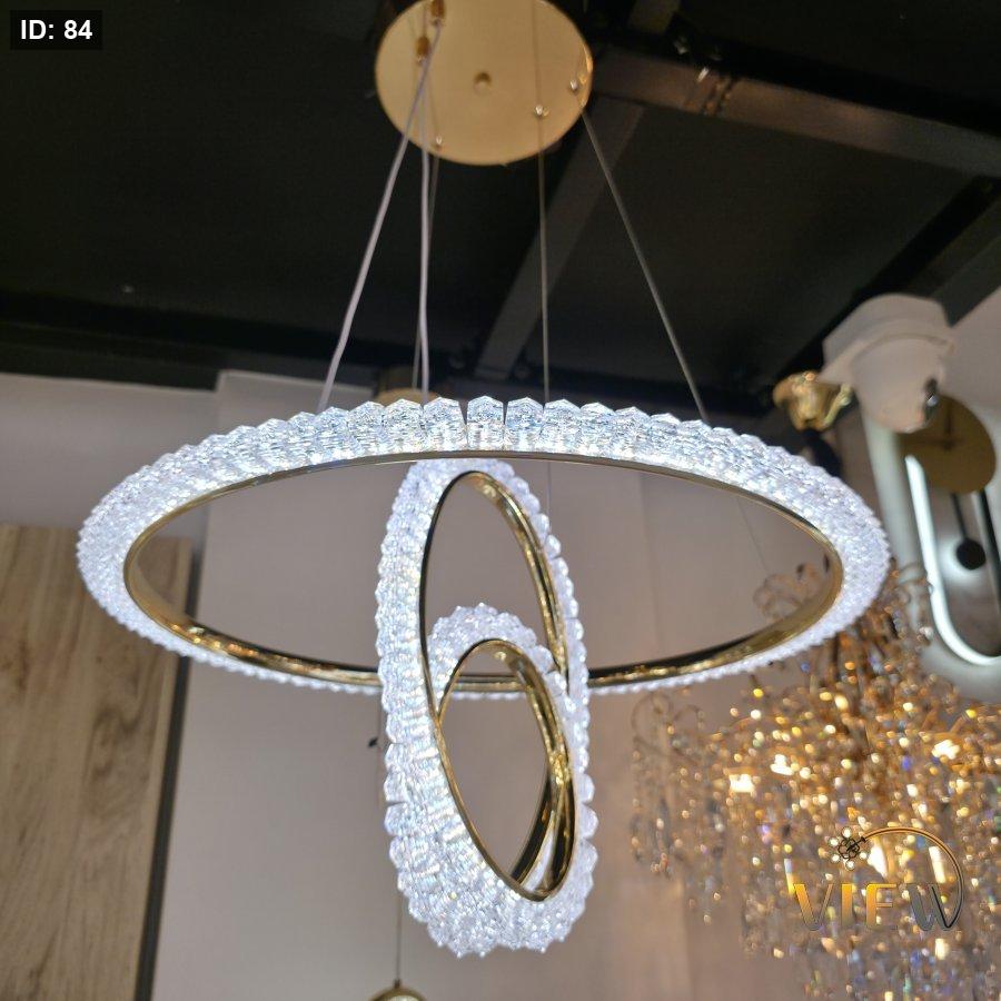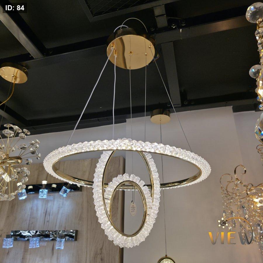 ثريا مودرن أنيقة بتصميم حلقتين متداخلتين مصنوعتين من شكل كريستال شفاف عالي اللمعان مع إطار معدني ذهبي فاخر. مزودة بإضاءة LED متوازنة تمنح المكان إشراقة ناعمة وفخامة عصرية، وتضيف لمسة فنية راقية تبرز جمال السقف والمساحة.