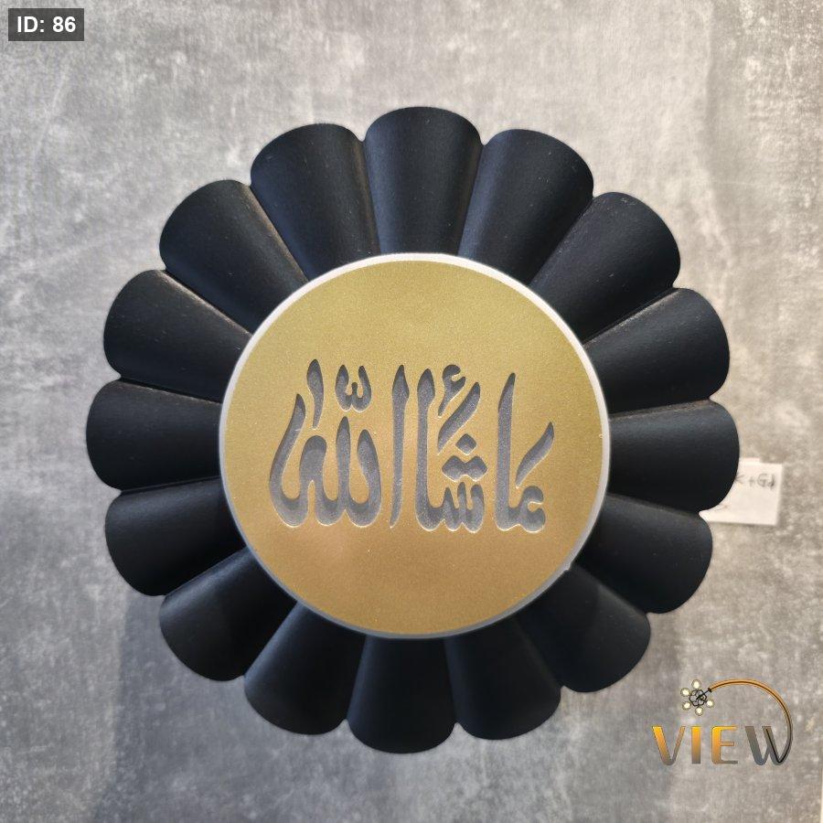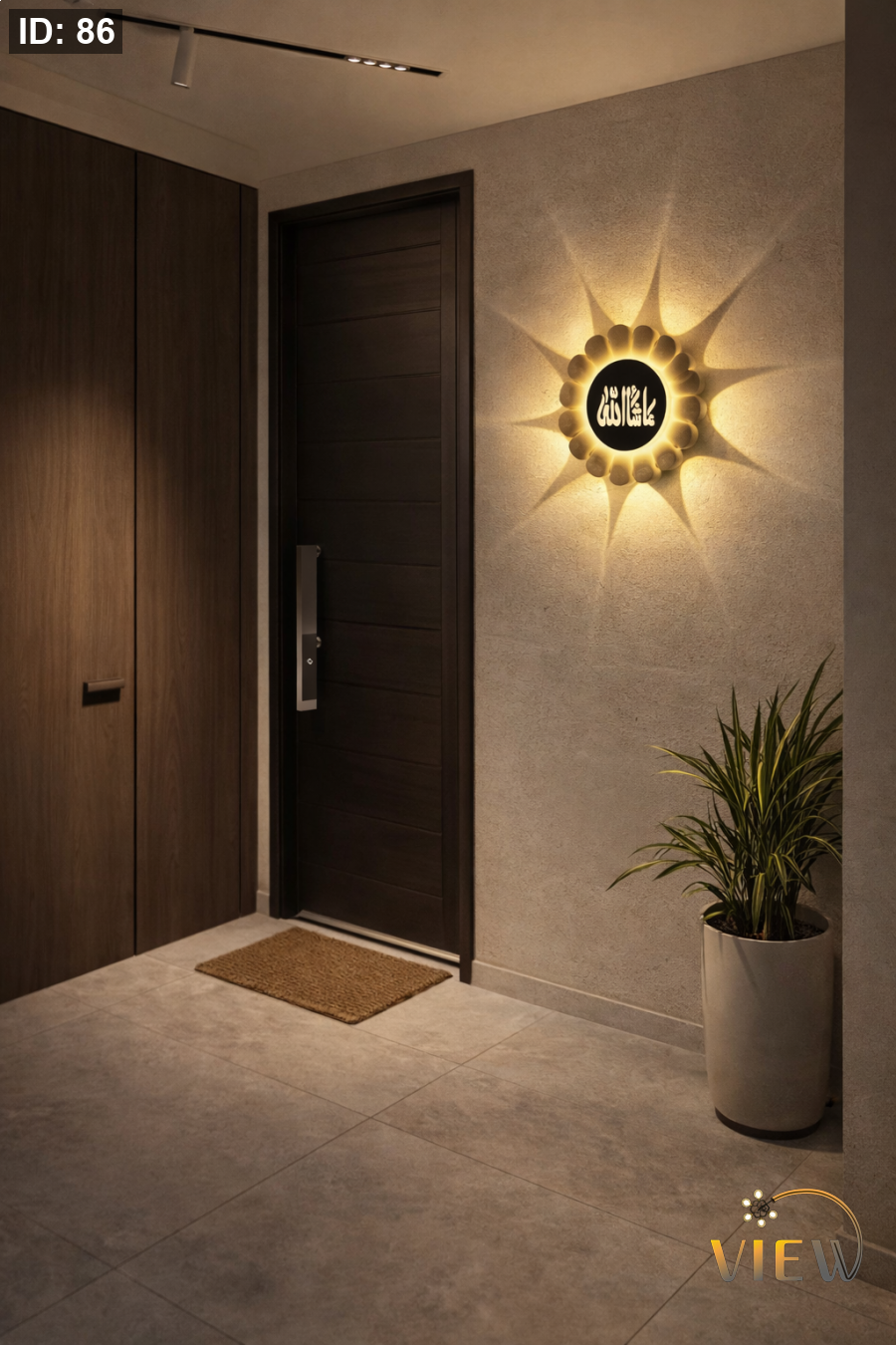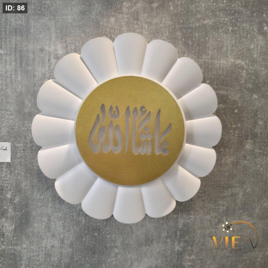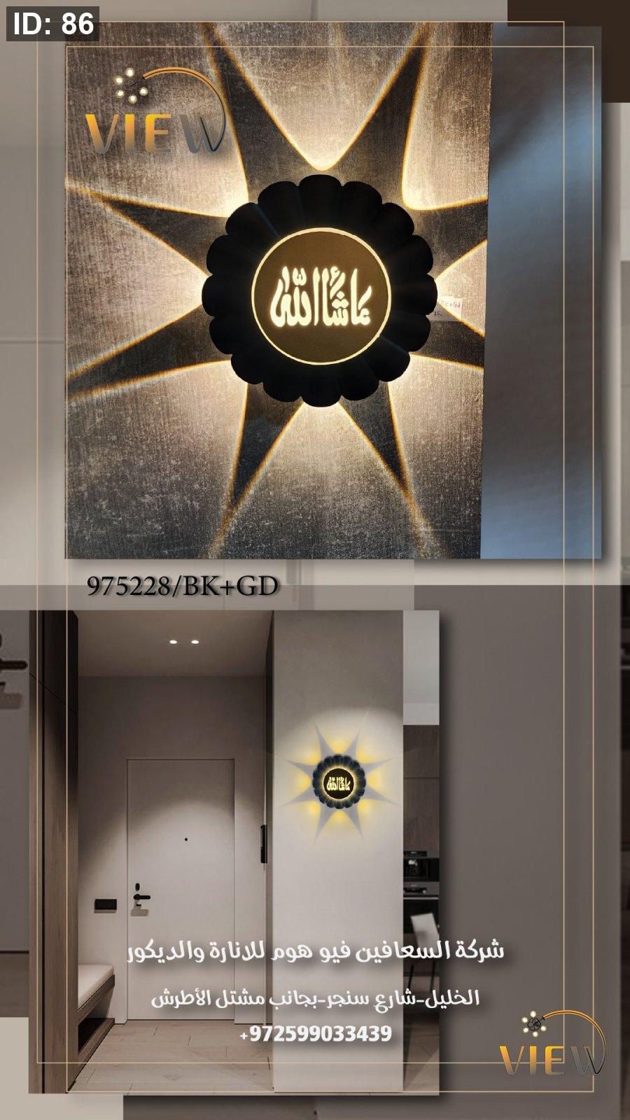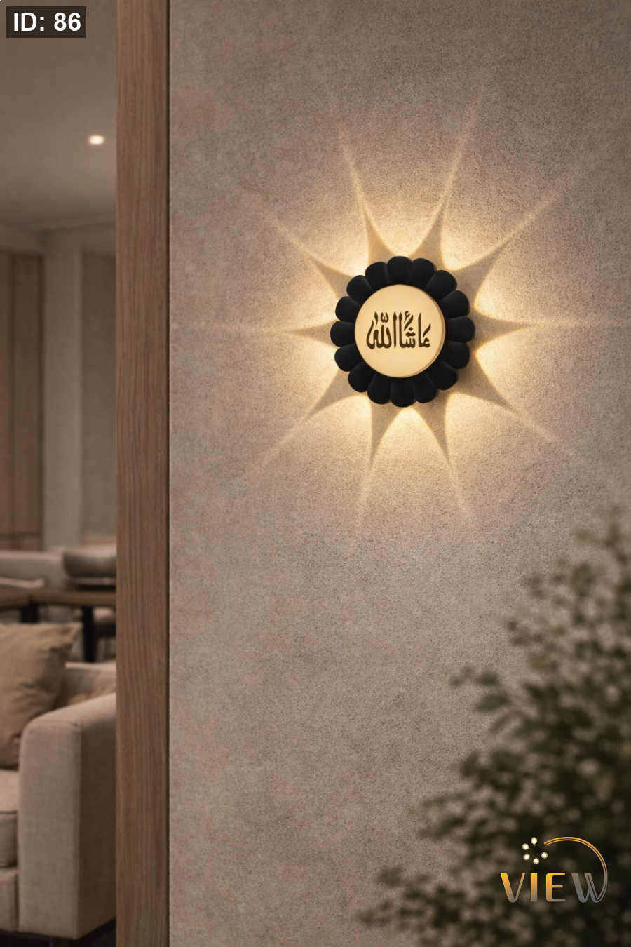 إنارة جدارية فنية بتصميم دائري أنيق تتوسطها عبارة «ما شاء الله»، تنبعث منها أشعة ضوئية متناغمة تُشكل لوحة ضوئية جذابة على الجدار. تجمع بين الجمال الروحاني والطابع المودرن، لتمنح المكان إحساسًا بالسكينة والفخامة في آنٍ واحد. مثالية لإبراز الجدران وإضفاء لمسة دافئة ذات معنى.